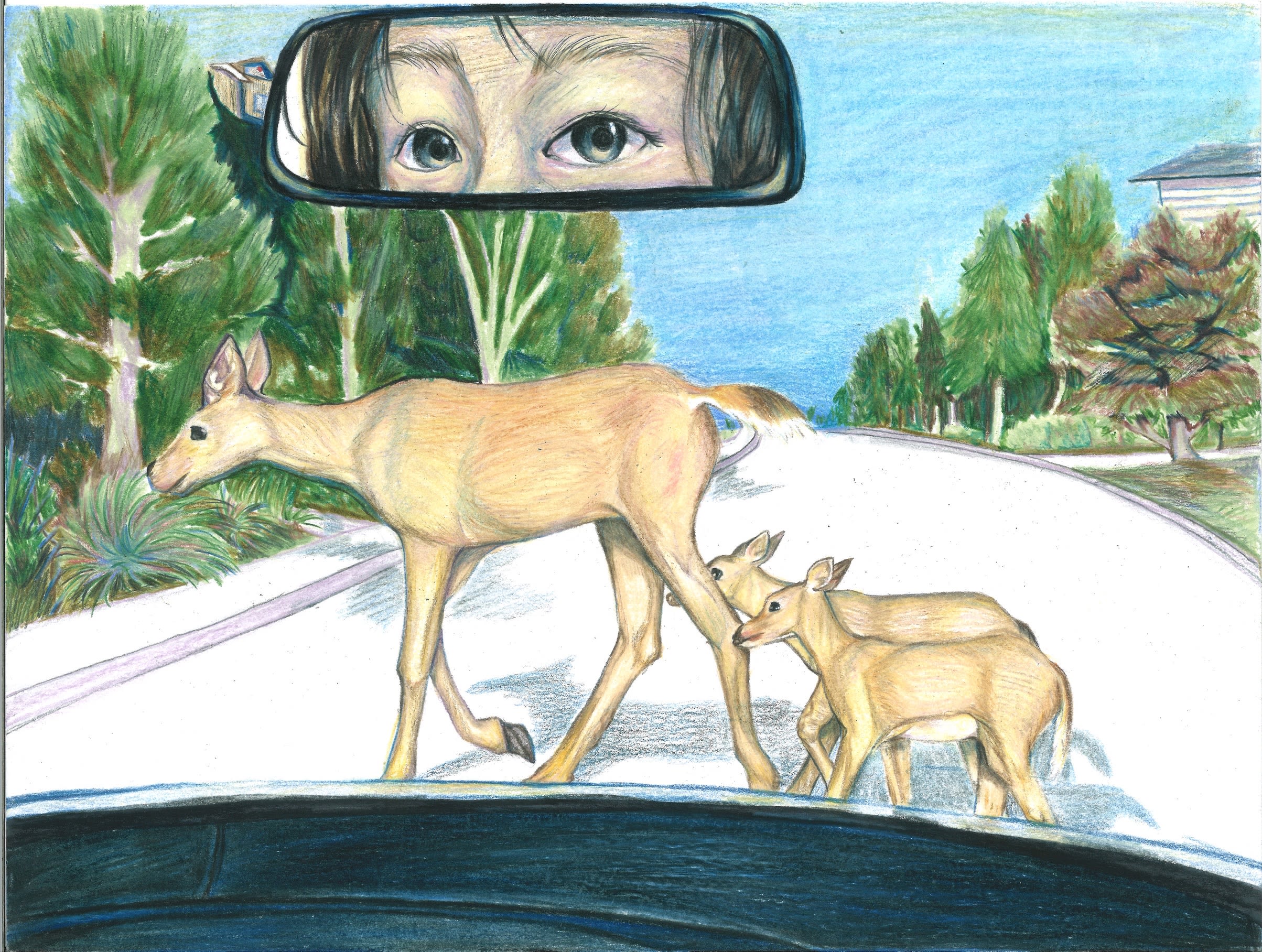 The artwork describes my own experience of seeing a deer family walking through the road. While my mum and I were driving our car in my neighborhood, we saw a doe leading two fawns crossing the road. My mum stopped the car suddenly and watched them walk through safely. I was shocked for a moment, but this soon turned into a surprise. Because I never thought I could see a deer so closely one day in my life. They were only a few meters from our car! I used to think they were in the forest away from us, but in fact, I saw them in my neighborhood. My mum took a picture, and I decided to use my art skills to record this incredible movement. Throughout this experience, I feel like nature is actually close and associated with our human beings’ life.