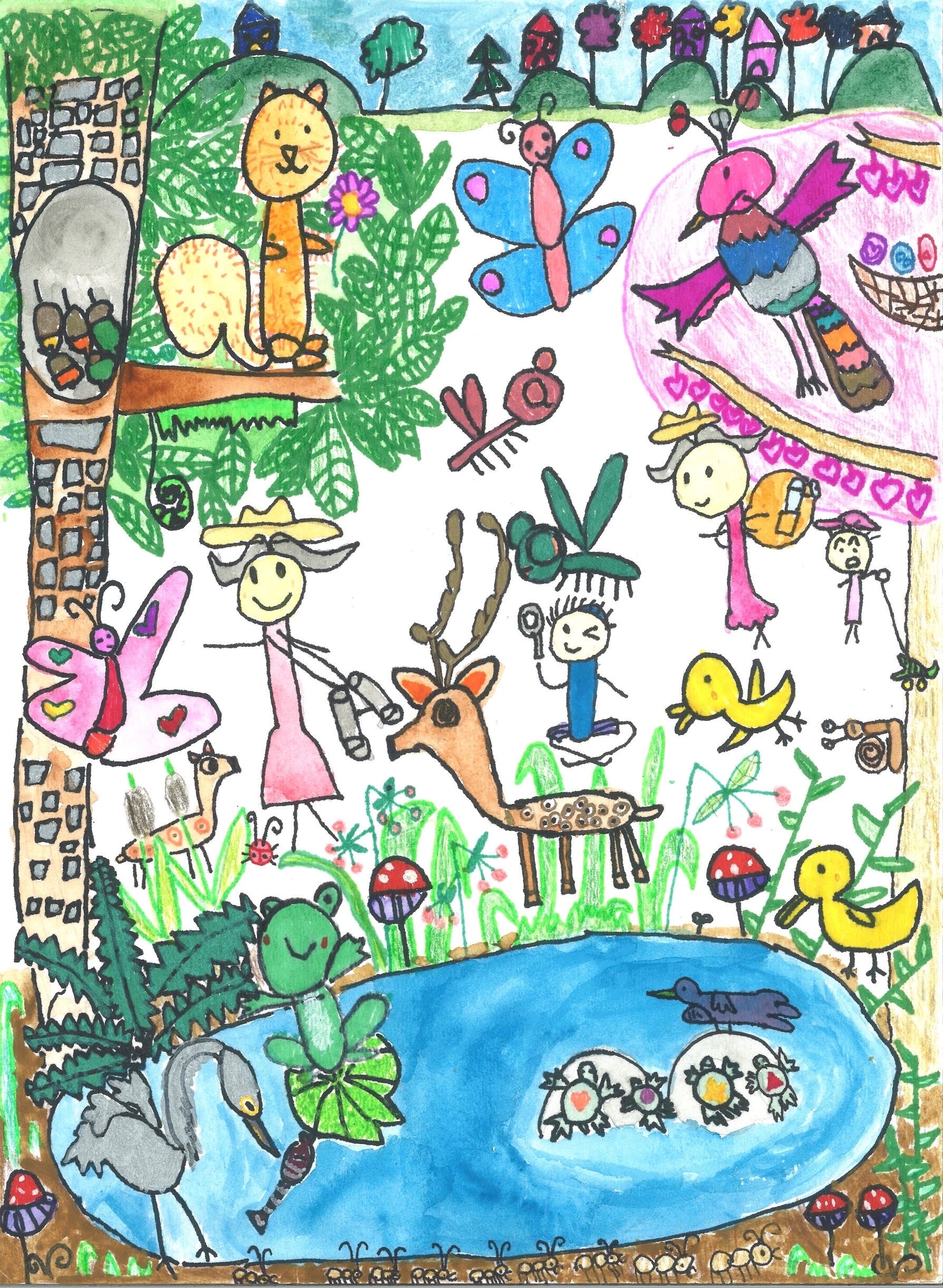 My inspiration is human beings live in harmony with nature, nature brings me happiness, because our family loves to go to wildlife refuge nature parks when we have time, we love spend a whole day to explore and make lots of observation over there. Telescope is the most important equipment that we must bring together, we can use it to easily watch the animal’s activity, such as grey heron, turtle, frog, duck, deer, birds, and squirrel in the park, so I draw them all in my paper, and I also recorded some ladybug, ants, snail, dragonfly, butterfly, trees, grasses and mushroom. Lake is the important part for those area, it helps nature with a good ecological balance. Human is the member of the nature, we are grateful for the happiness that nature brings to us, we also respect and treat well to our natural environment so that we can continue to coexist well.