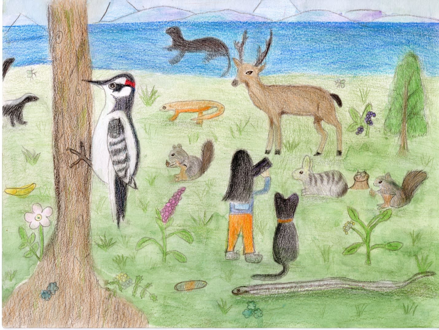 You can watch nature but, you can’t harm it. Trees and animals have a mind of their own. I drew a bird, squirrels, a black-tailed deer, a skunk, a snake and many more. It represents that animals can take care of themselves, and if you interfere with wildlife, you could hurt the animals so they can’t take care of themselves anymore. I drew my dog and I in my drawing to show how we are a part of nature but only as observers. We are only watching the other animals, we are not physically touching any of them.