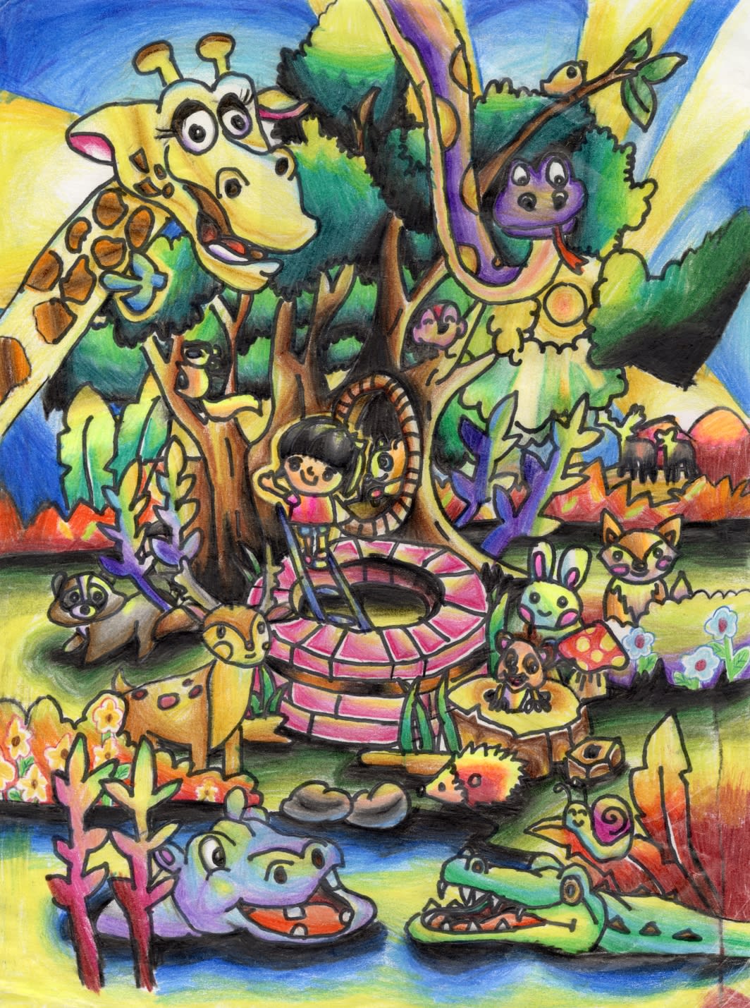 I’m climbing out from a well into a magical nature park. I like colorful plants and patting the animals is what I really wanted to do! Adventurous