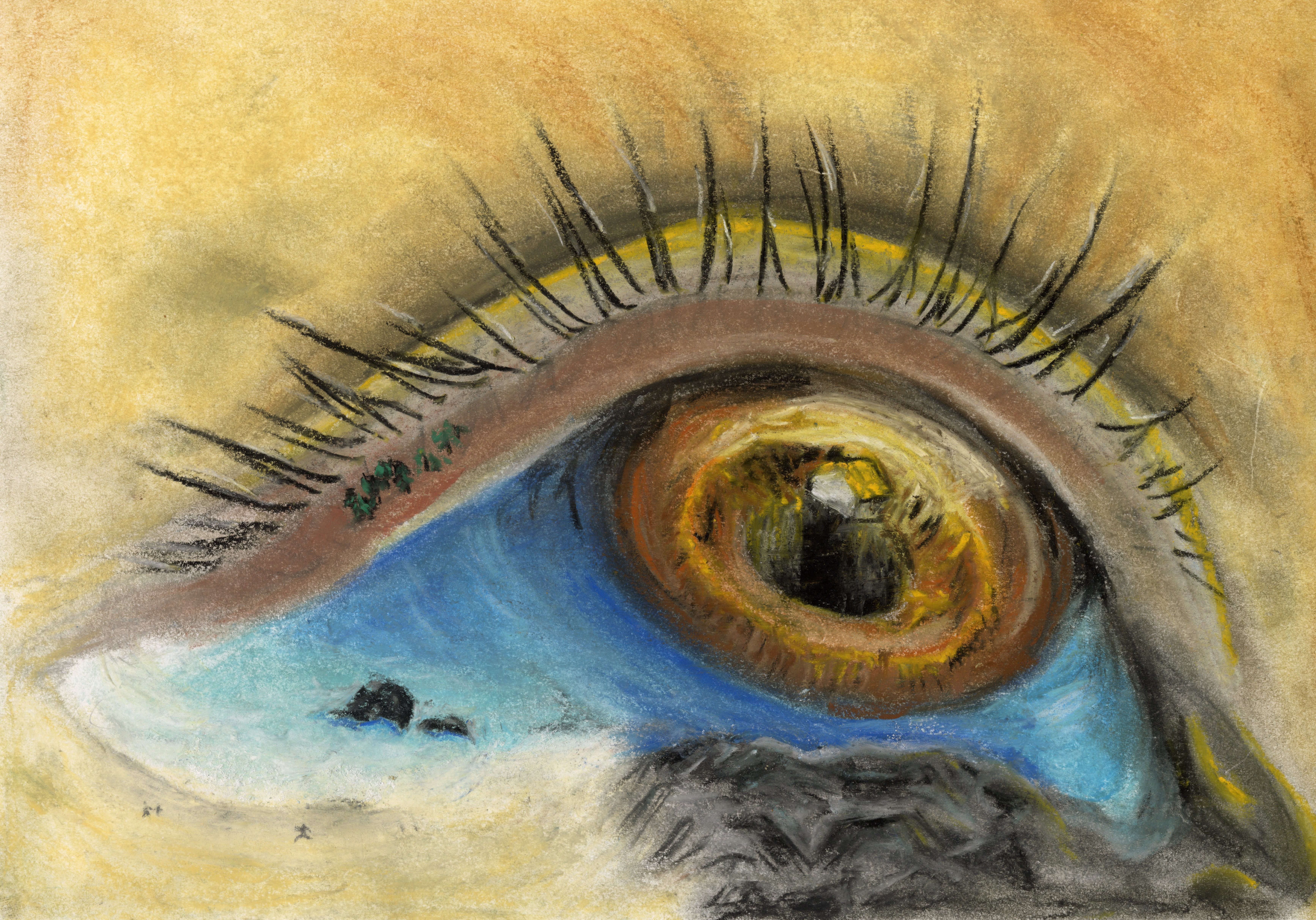 My visit to Costa Rica’s natural tapestry, woven with lush rainforests, cloud forests, swamps full of wildlife, and charming but mischievous Capuchin Monkeys catalyzed my reflections on how nature widens the view of the world around us. The dance of life within this Central American haven compelled me to contemplate the profound connections that exist when we open our eyes to the wonders of nature surrounding us. Many people stay nested at home, unaware of the nature outside. The eye in my artwork, gazing upward with the ocean as its sclera (the white part of an eye) symbolizes the barrier one has to sail across to open their eyes and reach the shore of the unknown, outside of their home (the house nestled in the pupil of the eye). To me, the healing art of nature projected in this piece describes the cure of one’s addiction to staying at home.