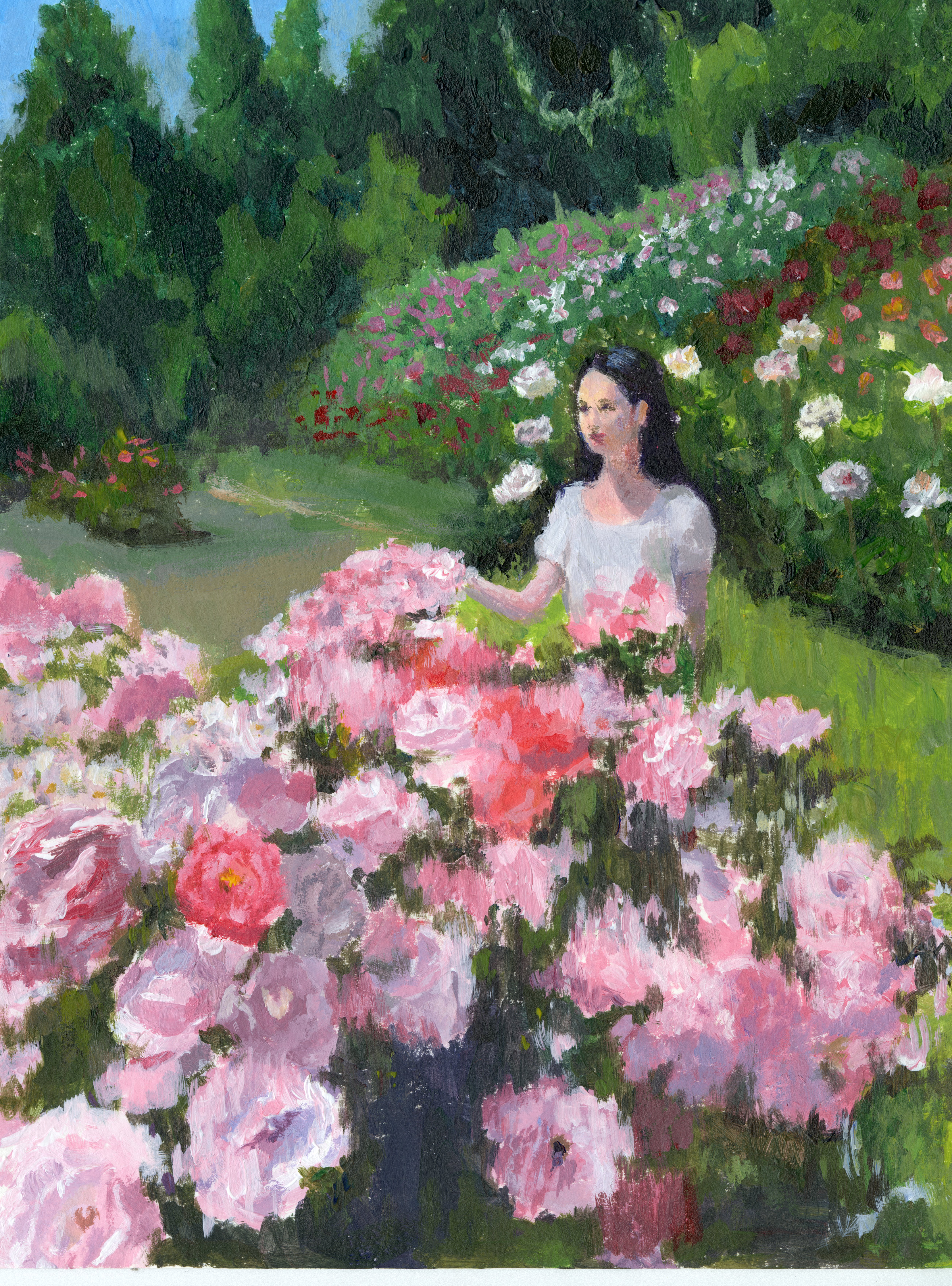 Every year I go to the Portland Rose Garden with my family. This painting is of a photo of me at the garden, admiring the flowers. Although the rose garden gets busy during the summer months, it still feels peaceful when standing amongst the rose bushes. Visiting the rose garden is my favorite way to connect with nature, because I can observe nature’s beauty and diversity.