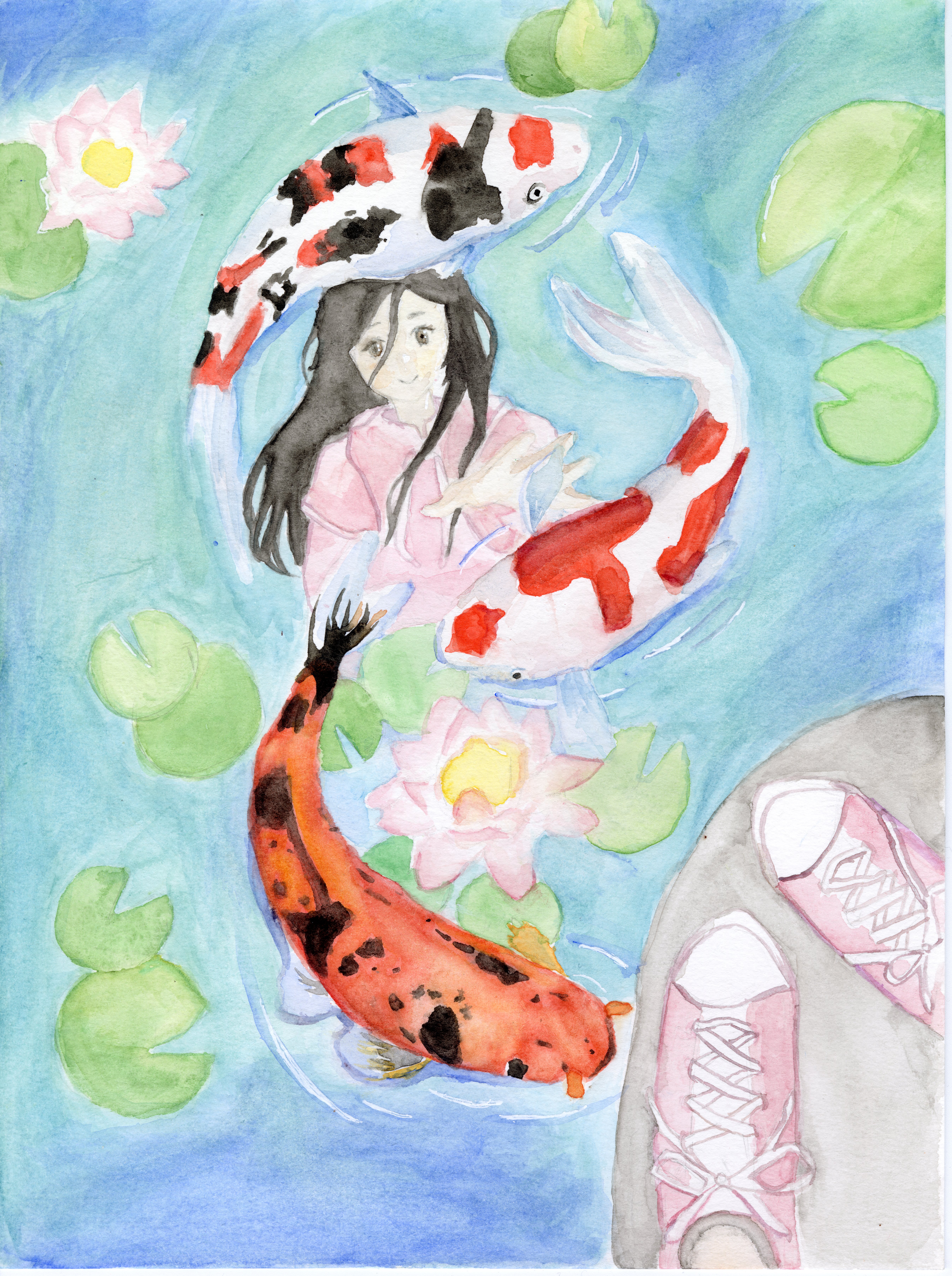 Koi fish have been my favorite species of fish ever since I saw them at a pond in a Japanese garden. I was drawn to their mesmerizing patterns and soothing presence. I remember seeing my reflection as I watched their fluid movements and vibrant colors as they gracefully glided through the water. This memory of mine inspired my entry, which shows me looking at my reflection as koi fish surround it.