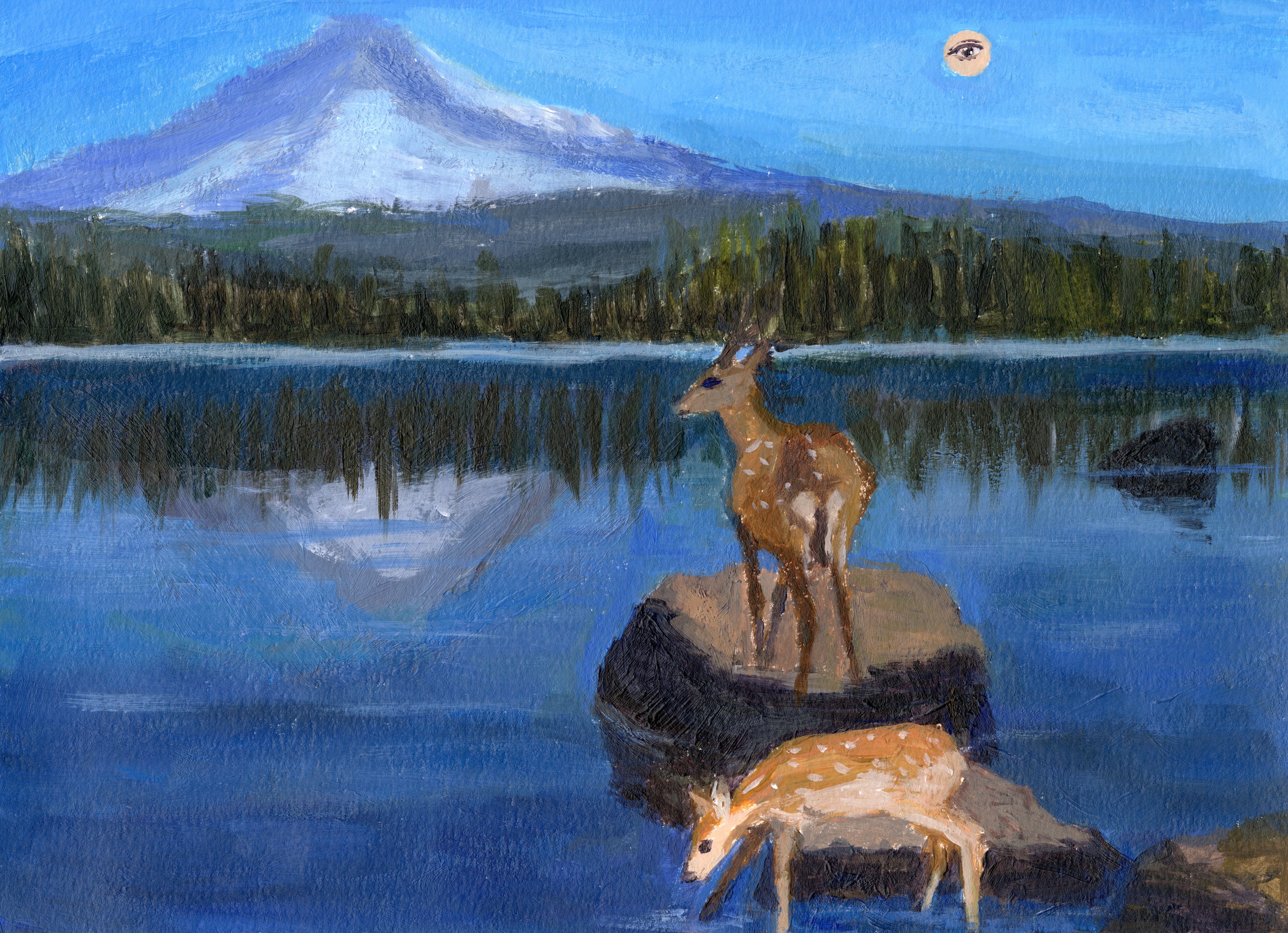 When I See this painting I think of how beautiful nature is and the way people react when they see it. I imagine how the eye peeking through is must have felt. When I was working on this painting I noticed all of the creases and curves Mt. Hood has and was in aweof how unique nature can be. While I was sketching the deer I discovered how strong deers can be with all of its muscles. I hope you will find the beauty of nature.