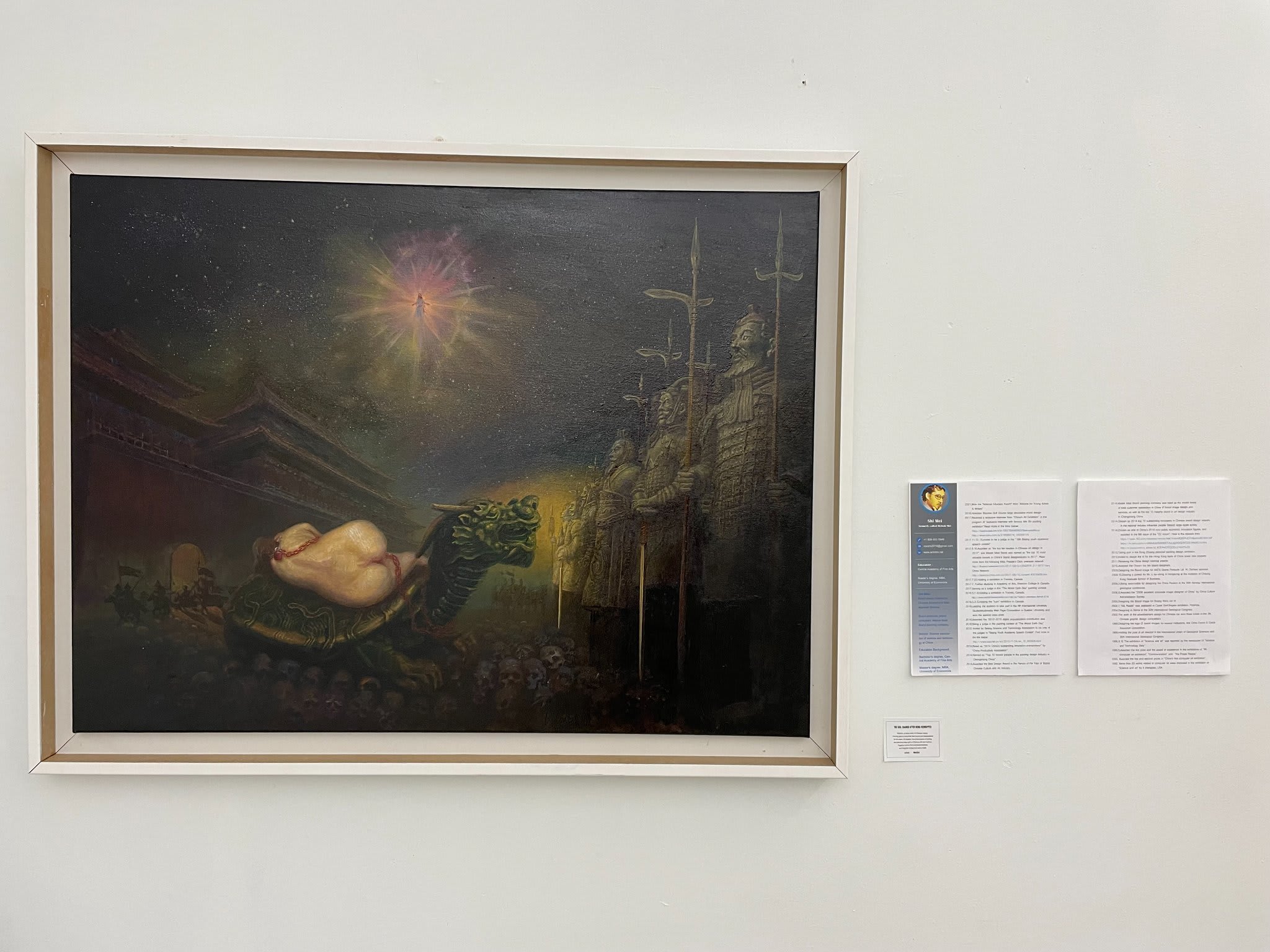 梅石老师的巨作必须放在最显然的地方,布展那天他是最早过去的人之一,我看到他的作品马上就力荐靠进门的两面墙,正好把两个不同主题的作品分开。先说铁链女,到目前我可能理解最为深刻的一个了,整个背景显得比较暗,突出的是龟背上裸女,一条铁链从脖子顺着身子悬在一边。背景里是古代身穿盔甲的士兵,和另外一侧的城墙,意喻着在现代的中国,内心深处还是没有脱离封建社会的禁锢。在封建制度下,人的地位在皇权之下是可以忽略不计的,所以,才会有铁链女悲剧的发生,而这个悲剧因为制度又不会是孤立的事件,这个可以从下面的无数骷髅可见一斑。当然,铁链女现象需要向游客介绍80年代的计划生育政策和后来造成的男女比例严重失衡和拐卖妇女社会问题的出现。。。画的上方是耶稣,因为梅石老师是一个虔诚的基督教徒,这里如何发挥因该就不难了。