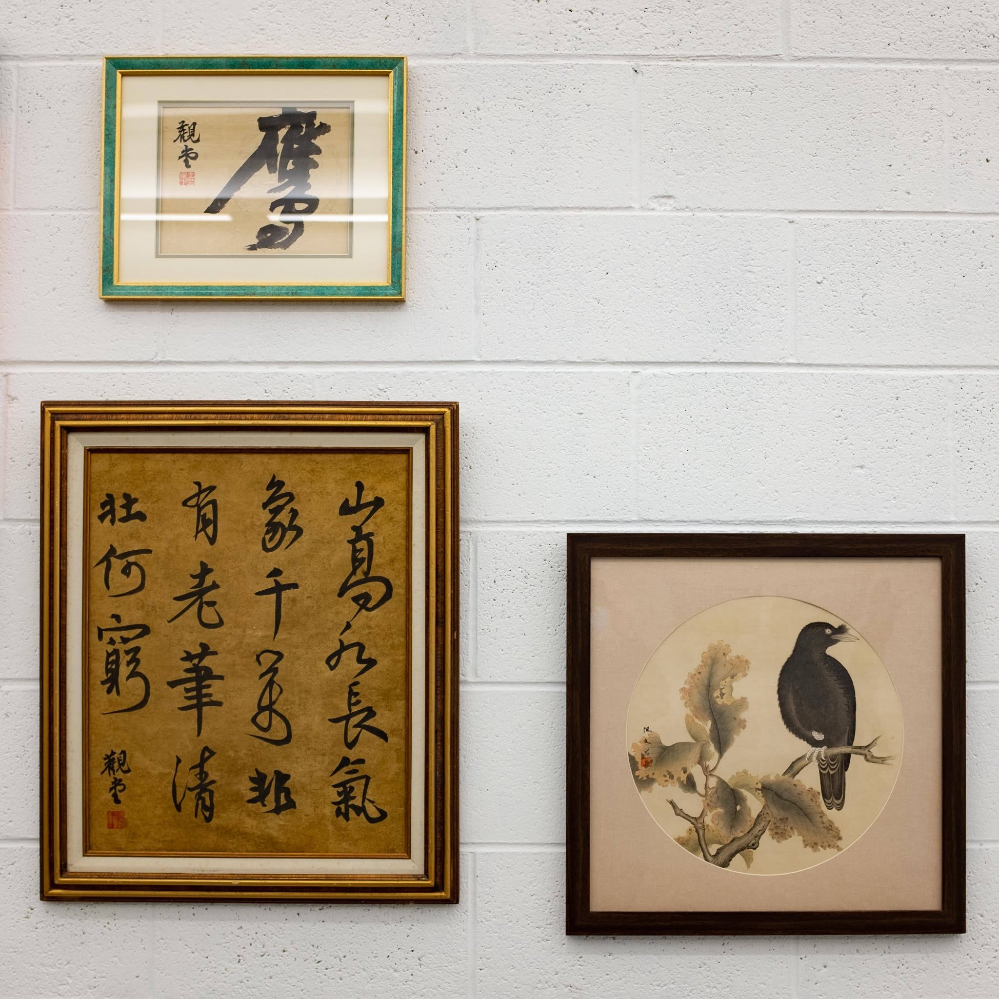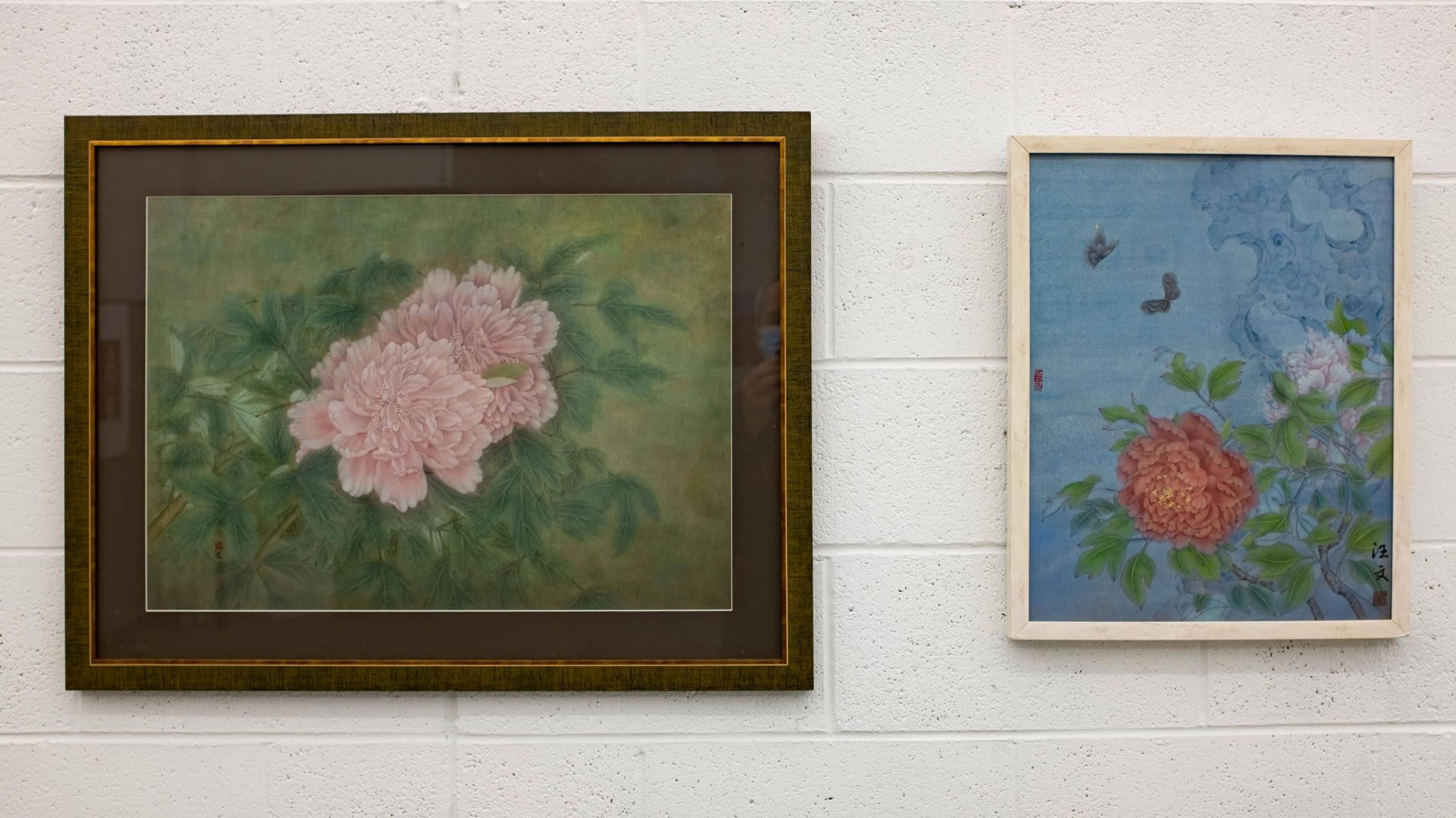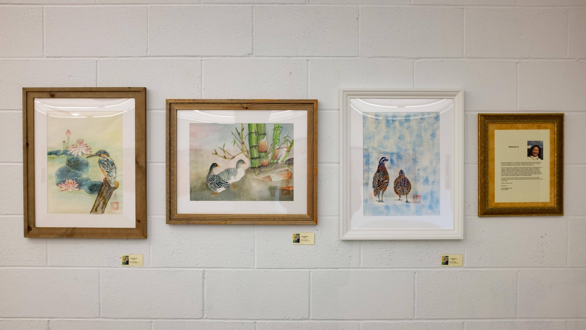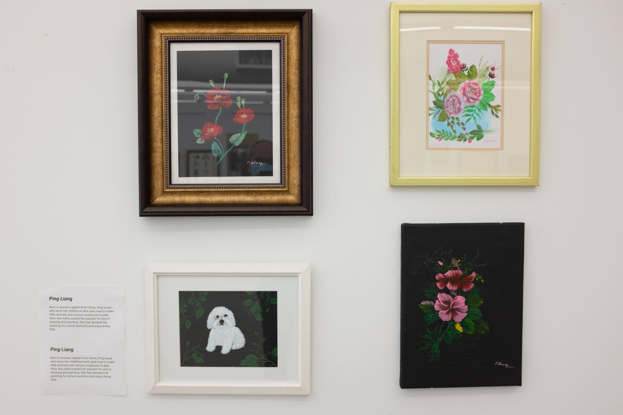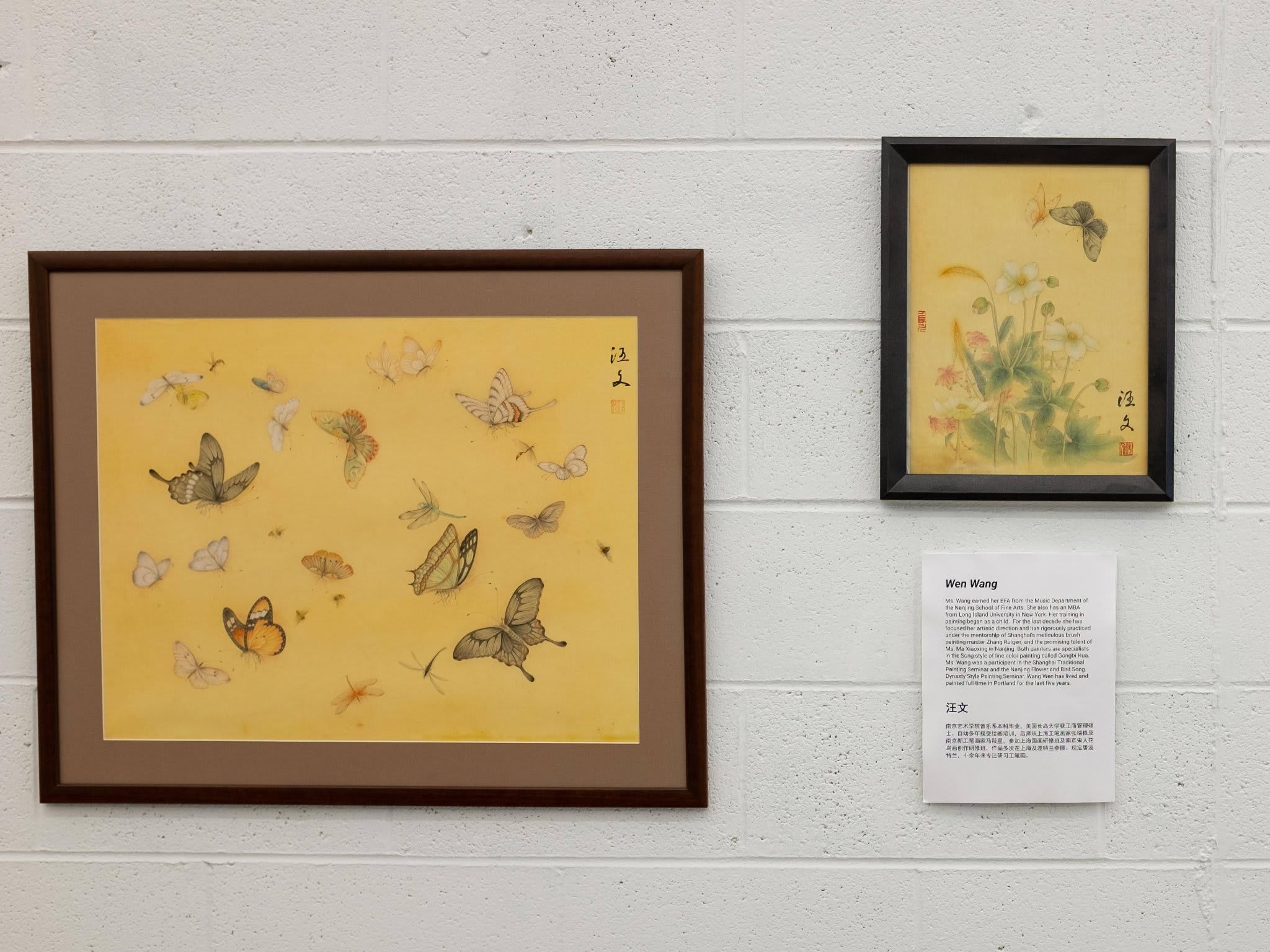 靠近墙角是刘(Xiaohong)老师的几幅工笔画,刘老师在Lake Oswego有一个开了许多年的中文学校,是当地社区的一个灵魂人物。她凭借着认真的工作态度让教会为她开放所有学校需要的空间,她平时除了教书,还花费大量时间和家长们交流,最近还参加了社区组织的精神健康互助小组。从她的作品可以看出她的人格魅力,温和低调又充满爱心。每次注意到她的作品所在的角落,我都是心存感激,参与就是为了社区公益。
