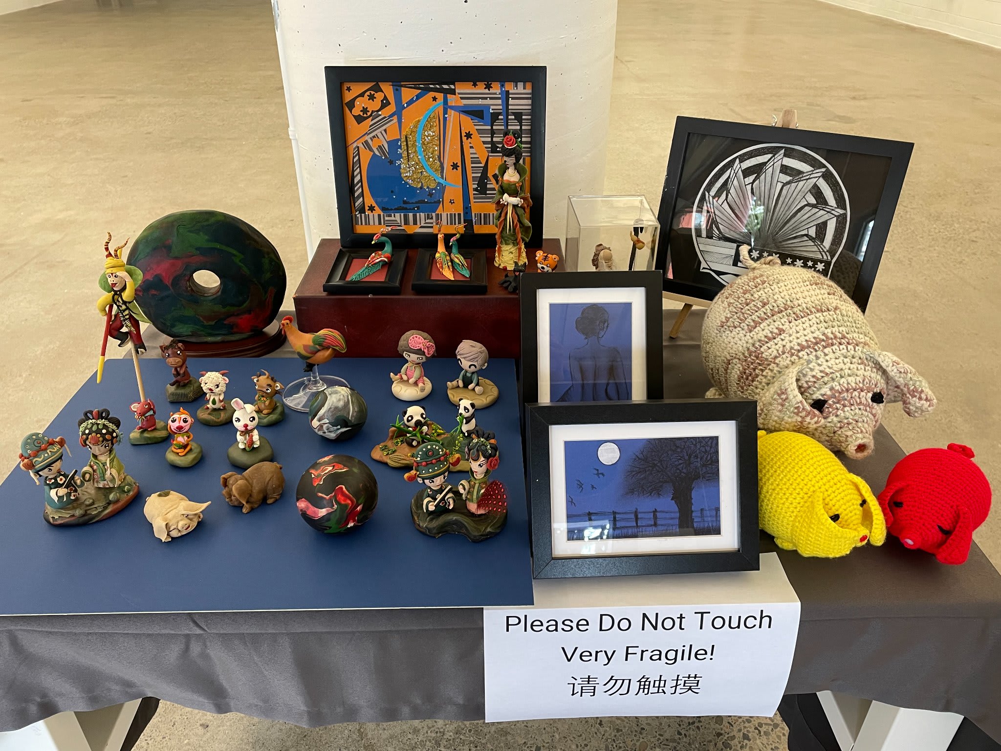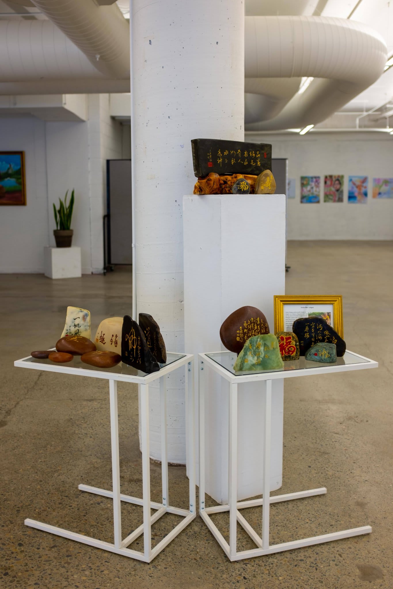 展厅的中间有两个柱子,柱子下面分别摆放着黄先生的石刻作品和茶飘香的用面团做成的面人等作品。黄先生的石刻几乎融进了他的生命中,记得去年画展看到过他用的工具,还不是那么容易联想到如何转换成展台上的作品,可想而知其中的劳作和辛苦。茶飘香则是在2018年中国城参加活动后首次回到社区,何为精诚所至金石为开,她看到是真真正正的社区公益,此次和我们大家相聚,表明在社区公益周边聚集了越来越多的人,这是让人最开心的。
