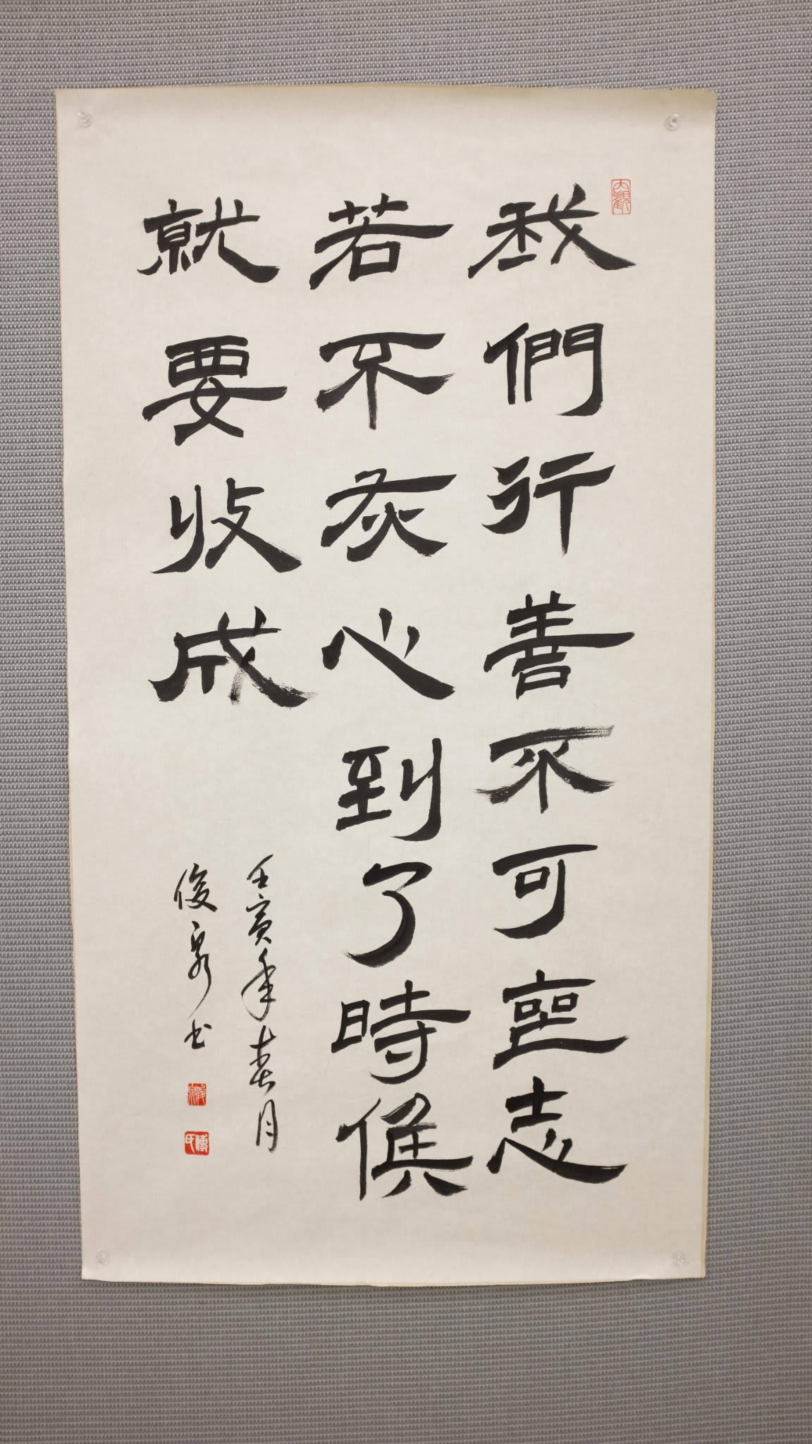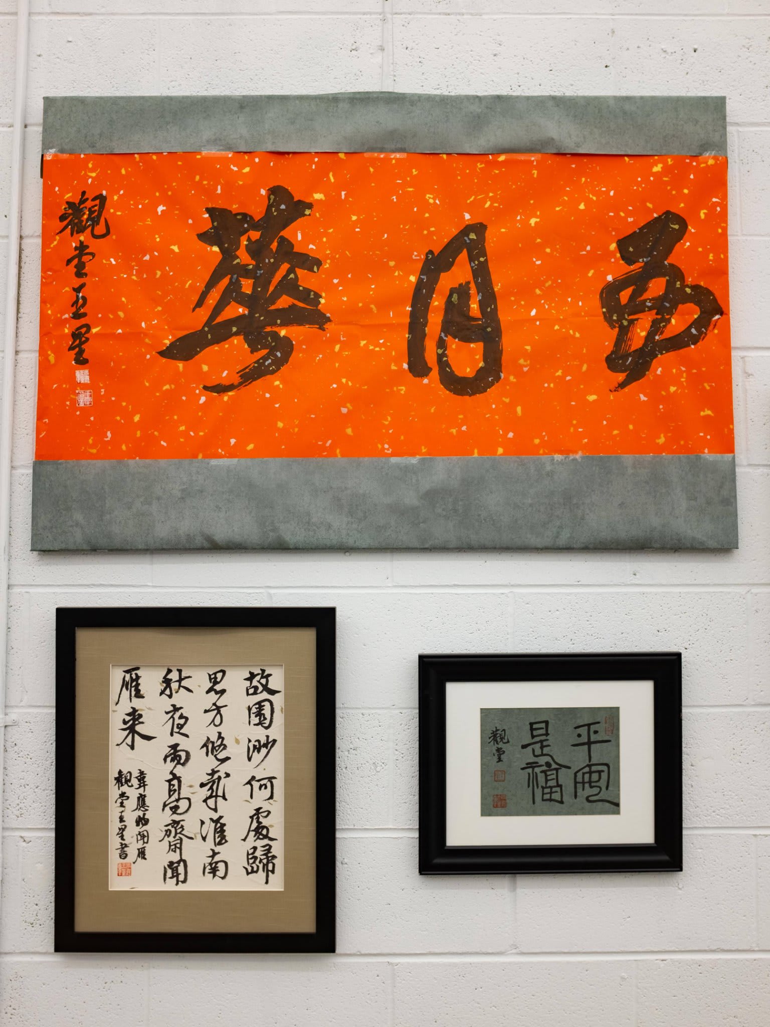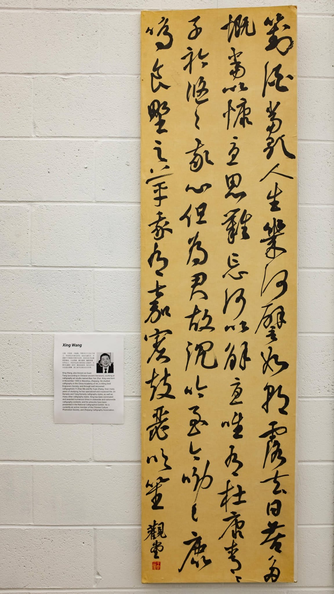 刚要介绍王星老师的作品,方注意到是在汪文的前面,想起来是最后一个布展的。王老师特意为这次艺术展题写了“五月花”三个大字,想想当年在兰苏园的汉语角的三个字也是王老师题写的。王老师的书法在社区很受欢迎,但丝毫没有架子,社区活动是有求必应。平时在希望中文学校教授孩子们书法,是很受孩子们喜爱的老师。