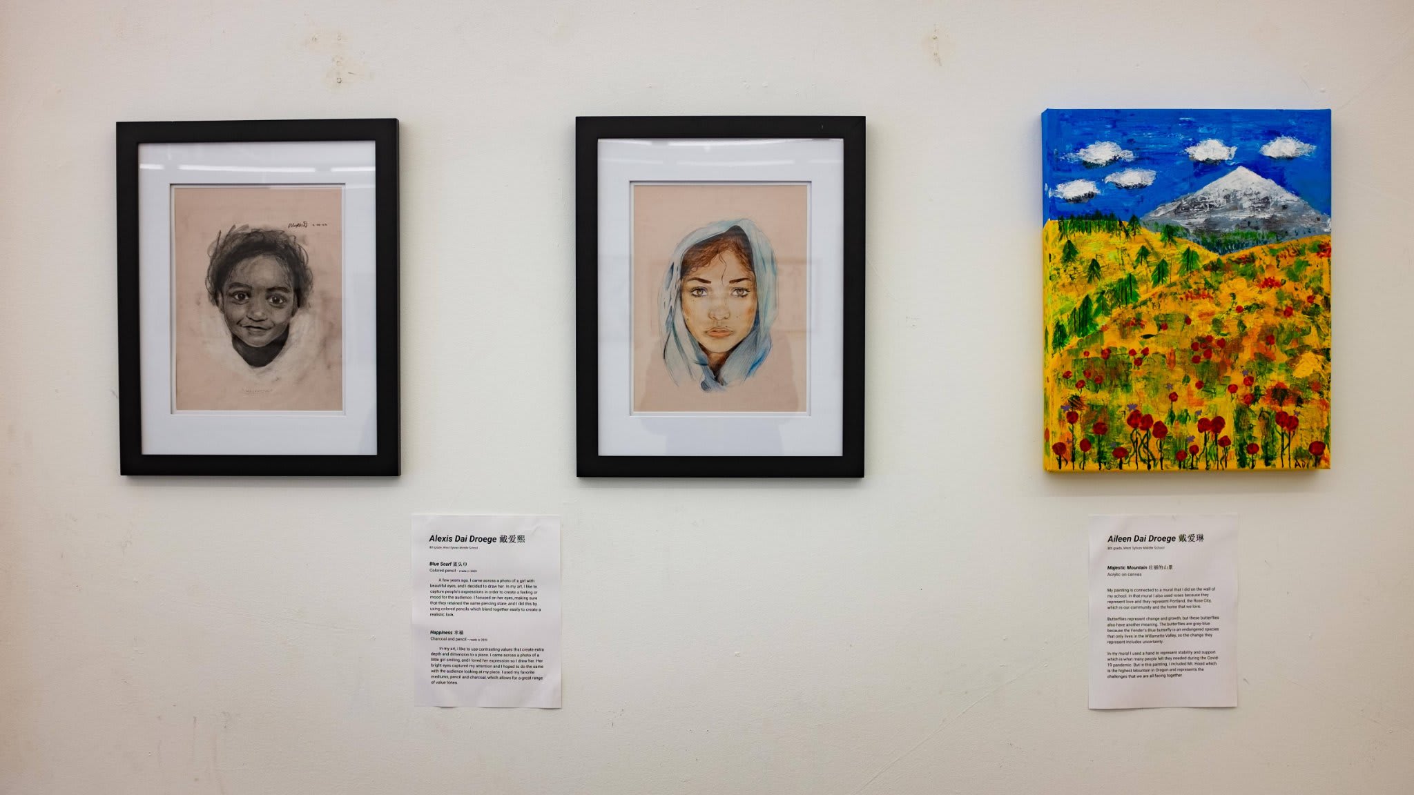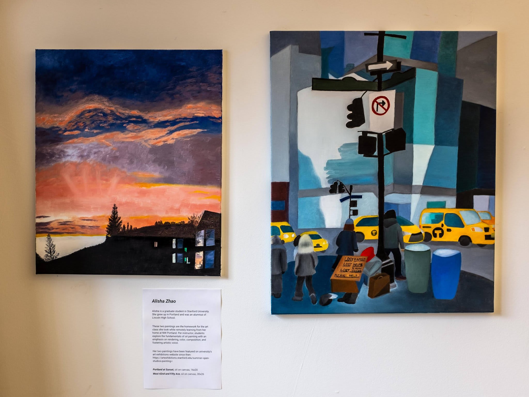 大多从玻璃门进来,第一幅作品是我女儿的两幅作品。这是她在家里远程上课的时候,因为无聊选了一门art class,结果她毫无基础的背景下,凭借平时偶尔自己涂鸦的本事,提交的两幅作品得了A+,并在斯坦福网站上一直是featured artworks,我想大家喜欢的原因是内容。昨天梅石老师看到作品,只是从细节就分析出她的性格,大师就是大师,太厉害了,分析得十分的精准到位。