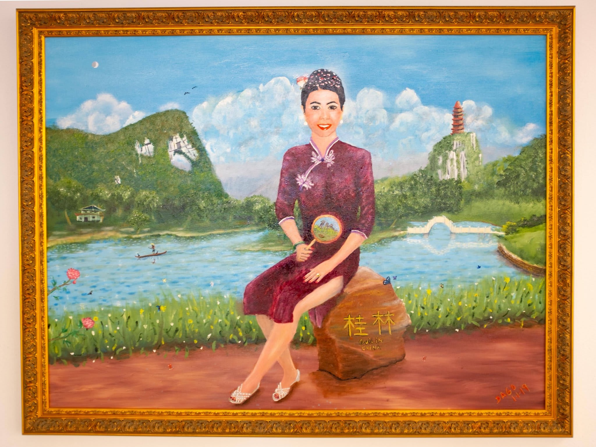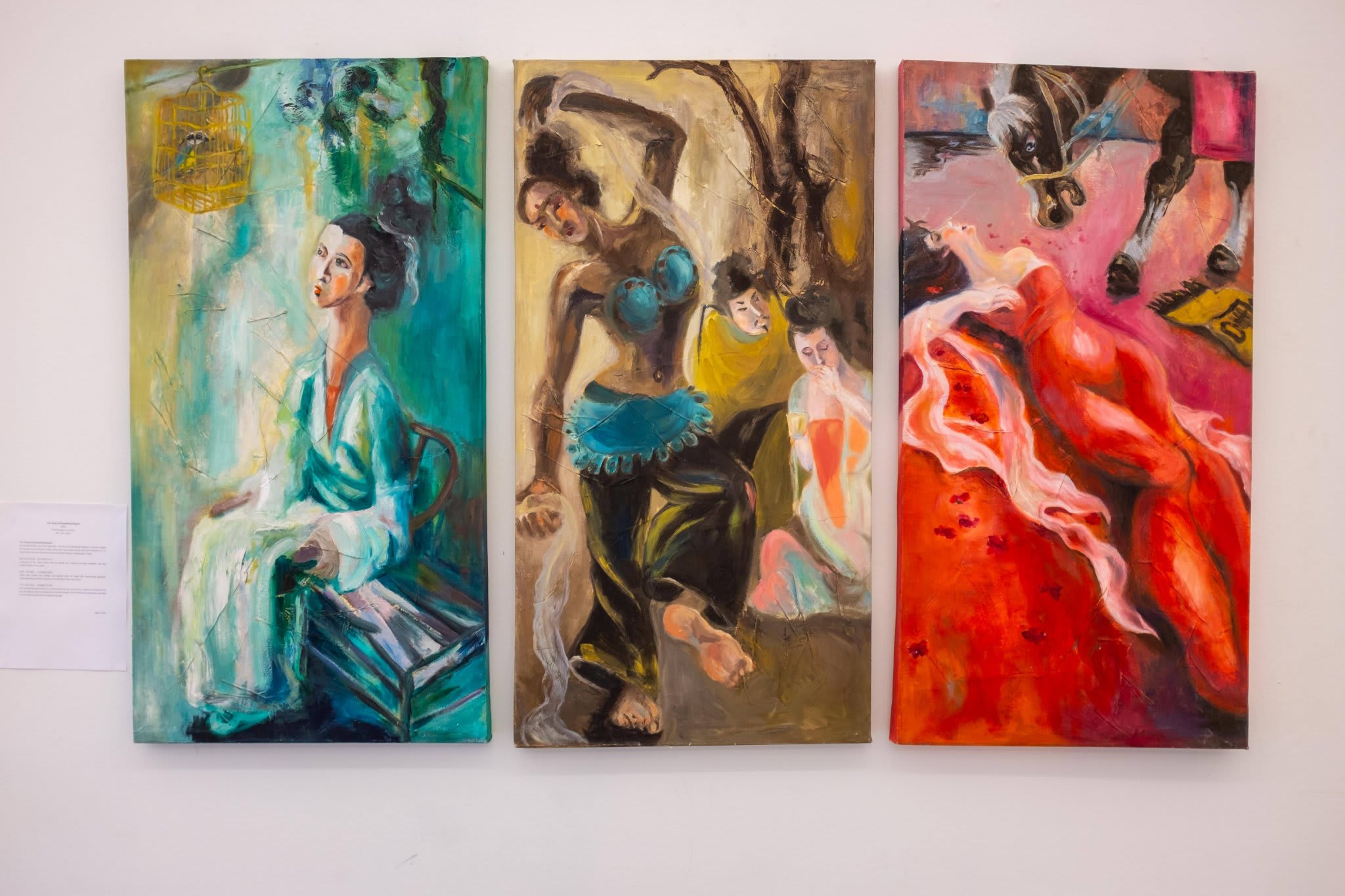 后面三副是Jenny的妈妈,本科和研究生都是学习绘画,三幅作品是一个系列,展示的是杨贵妃的宫廷生活,每一幅作品都是来源于一首诗,意境极佳。