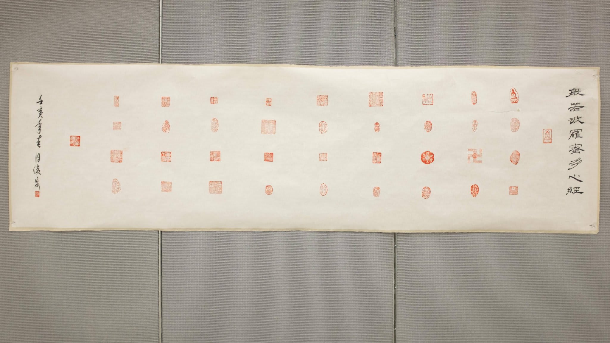 转过去,是校友俊泉师弟的两个作品,盖满“印章”的是《心经》,普通人看的就是天书,这个是历时半年才完成的,没有一个字是重复的。我只知道刻字分阴刻和阳刻,阳刻非常的难,看着几个阳刻“印章”,我都觉得为他提心吊胆,手一抖,全盘皆输。