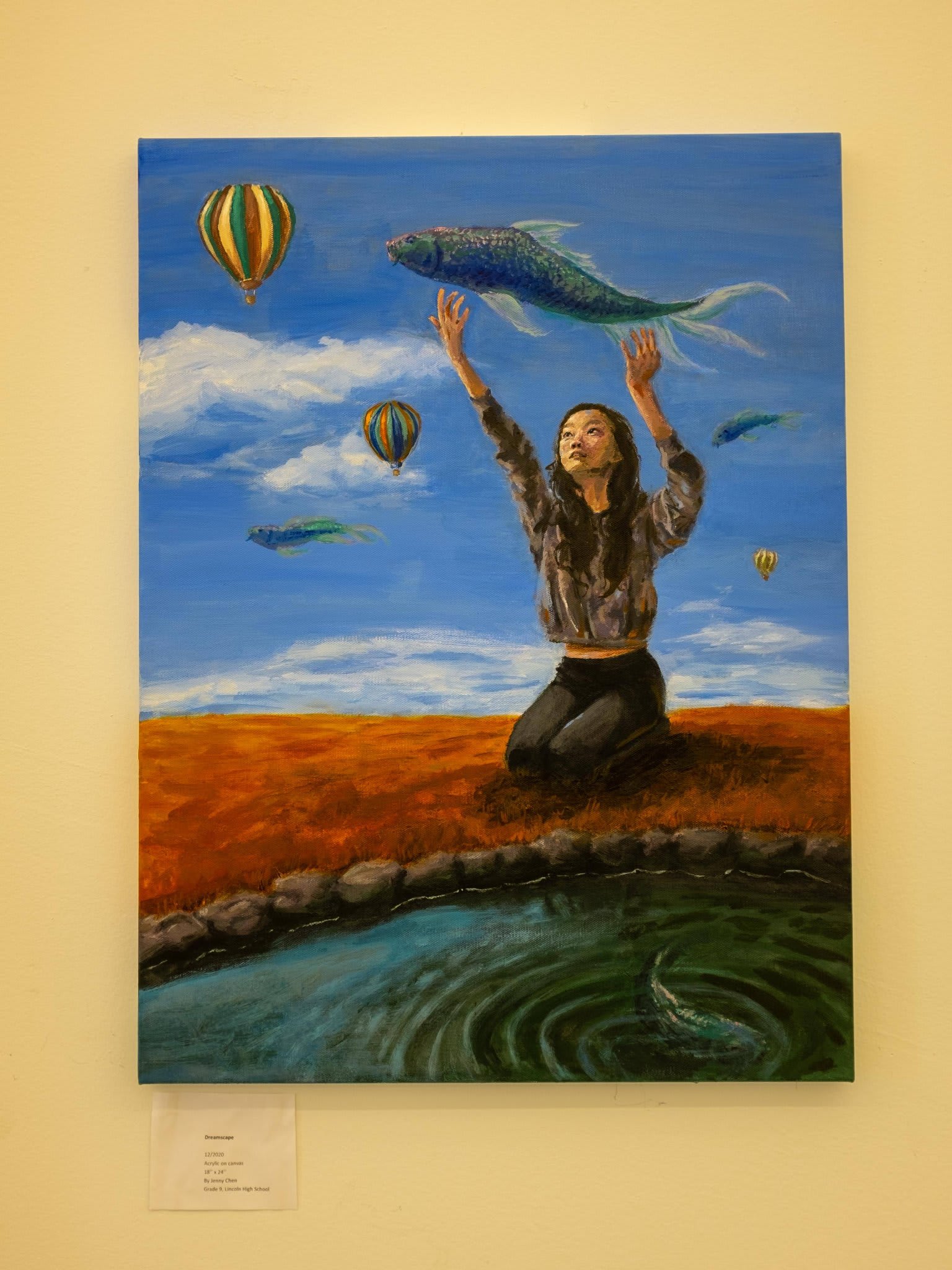 下一个是林肯高中的Jenny Chen,她刚刚荣获national scholastic artds and writing gold medal,说是学生绘画最高奖项不知道是否为过,但是她画的内容(高中午饭时间学生在校园三五成群的镜像)会成为疫情期间高中生活的一个经典缩影。
