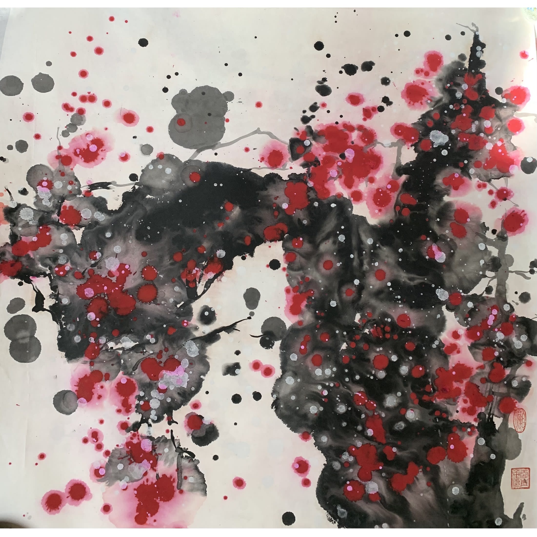 Breath of Spring series #4, Ink and watercolor on rice paper 宣纸水墨泼彩, 27 × 27 inches, from $350 (winning bid $350). Authored and donated by Shirakawa (顾更青).
