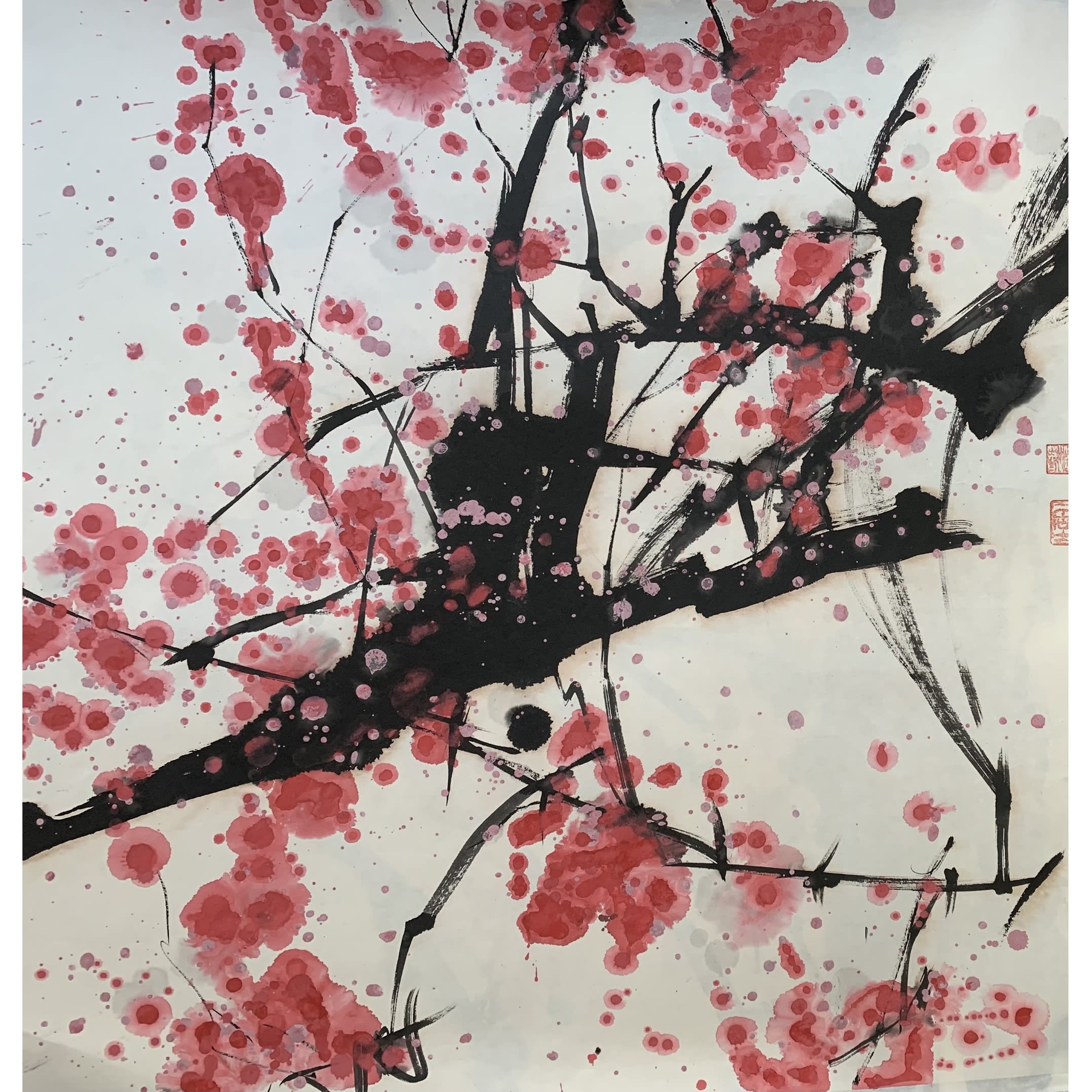 Breath of Spring series #1, Ink and watercolor on rice paper 宣纸水墨泼彩, 27 × 27 inches, from $350 (winning bid $350). Authored and donated by Shirakawa (顾更青).