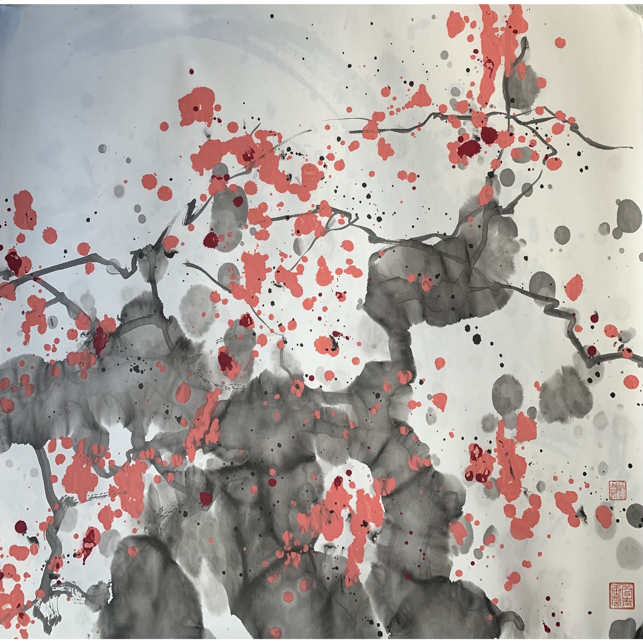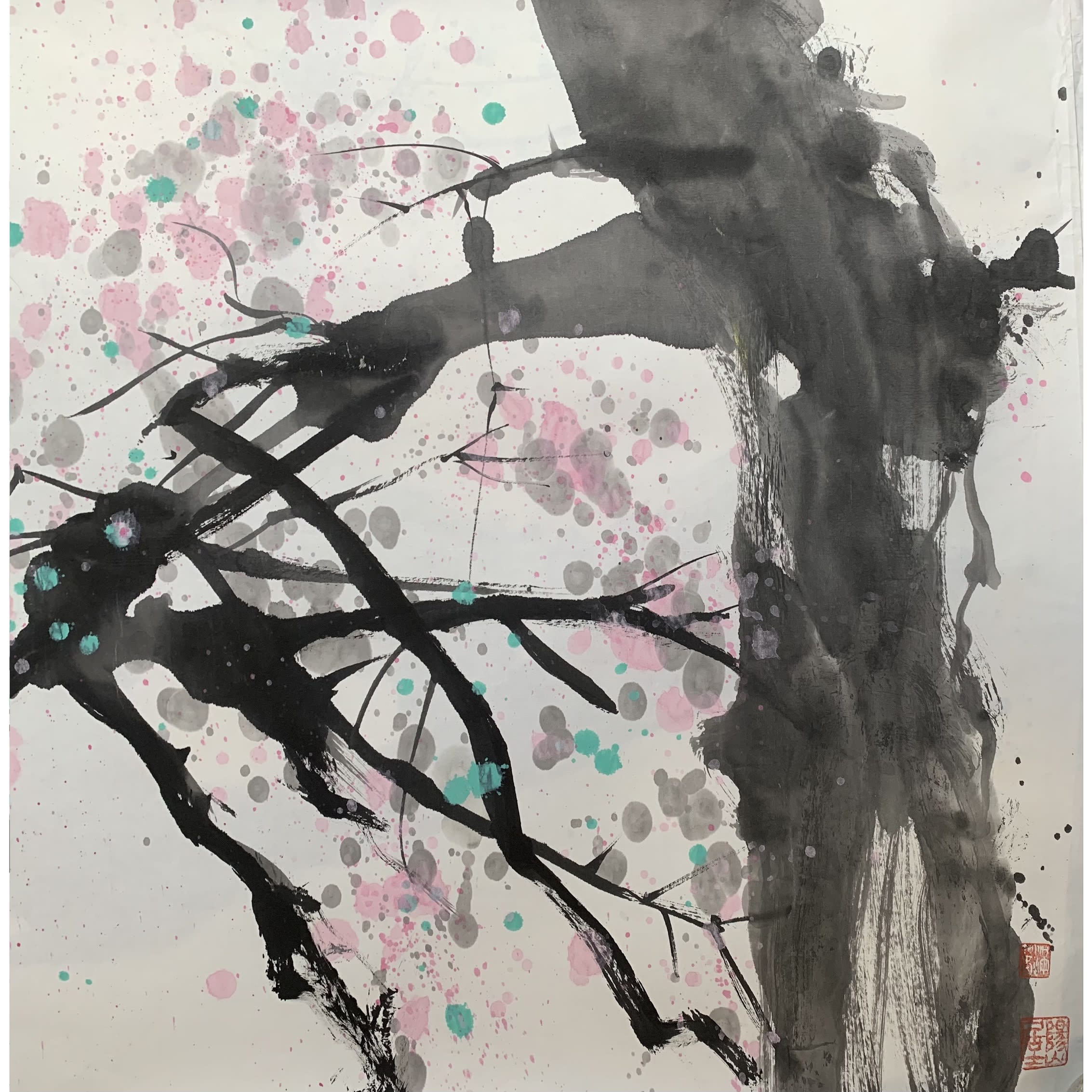 Breath of Spring series #2, Ink and watercolor on rice paper 宣纸水墨泼彩, 27 × 27 inches, from $350 (winning bid $350). Authored and donated by Shirakawa (顾更青).