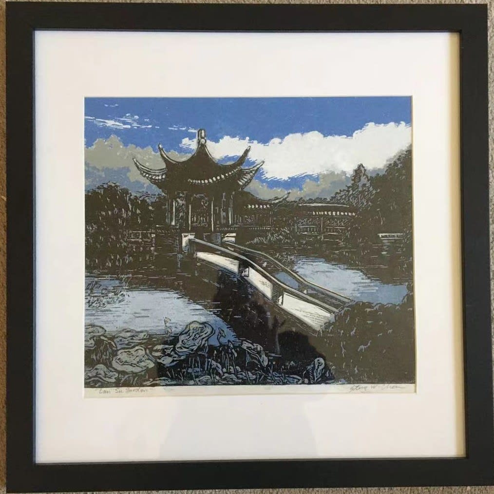 Lan Su Garden, Block printing, framed, 13.5 × 15.0 inches, from $400 (winning bid $450). Authored and donated by Steve Chen.