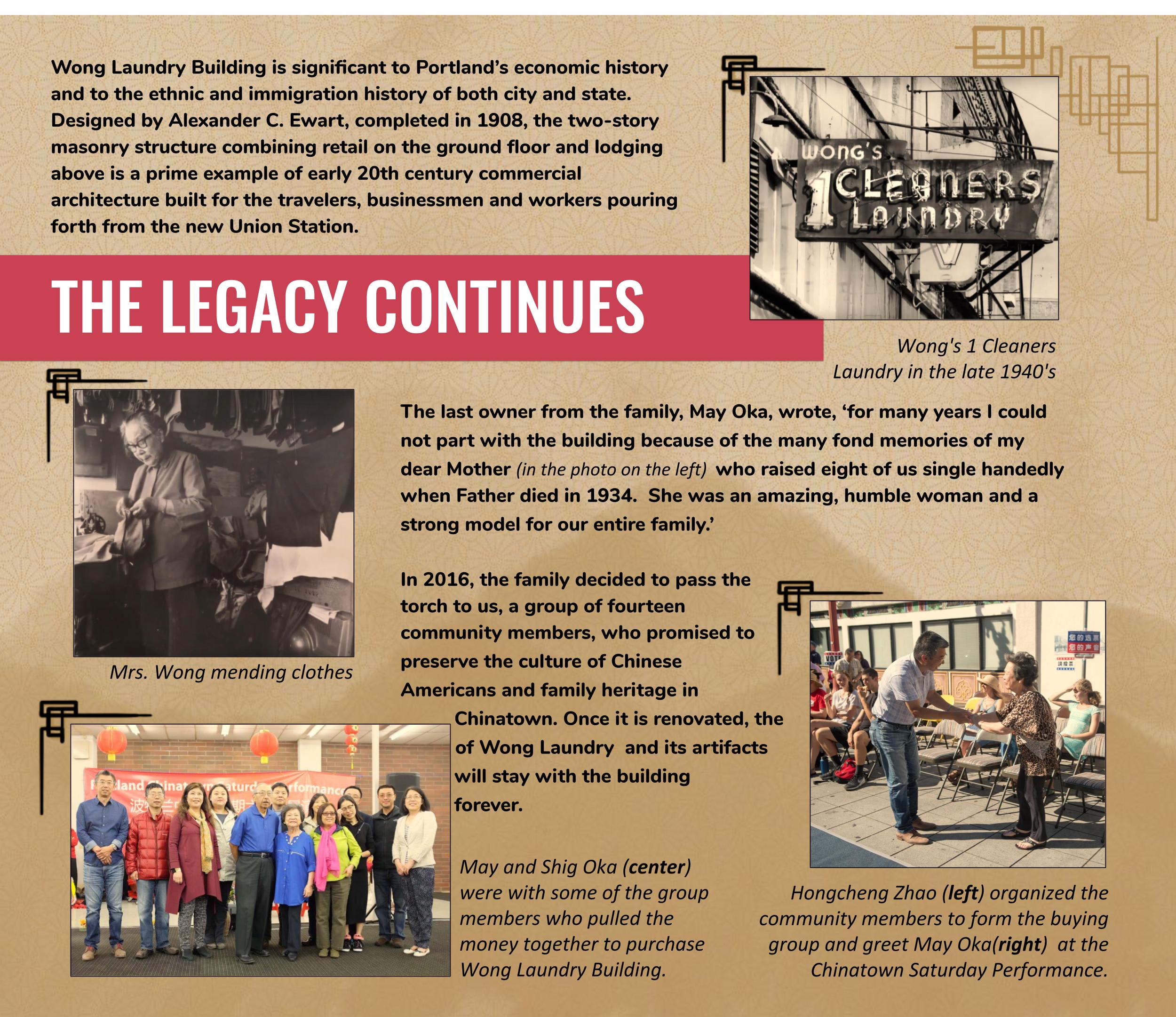 Given these circumstances, we came up with the idea of forming a buying group which consisted of a dozen Chinese community members. We pooled the money together to purchase properties from Chinese owners like May and Shig Oka. We believed this solution not only made our endeavor more financially feasible but also deprioritizes the usage of these buildings as rental properties. We would therefore be able to utilize the properties for the benefit of the community and to preserve and enrich the culture and heritage of Chinese Americans.