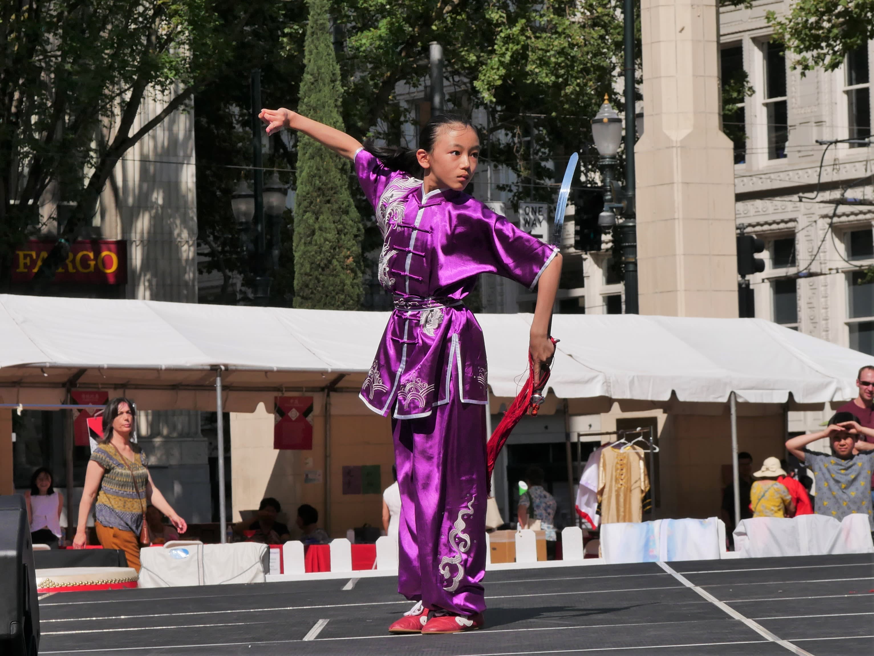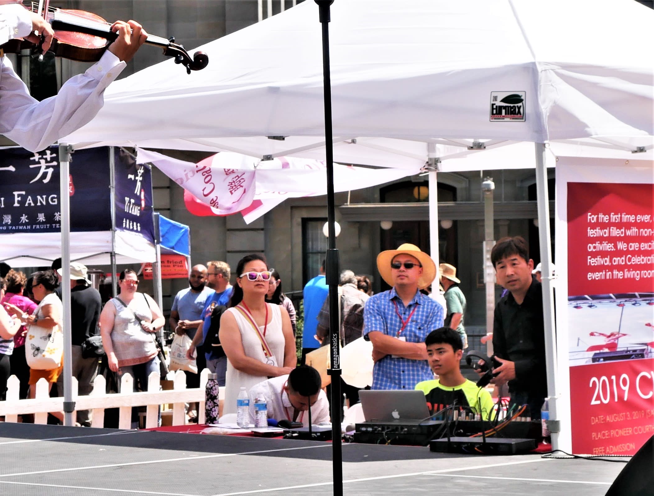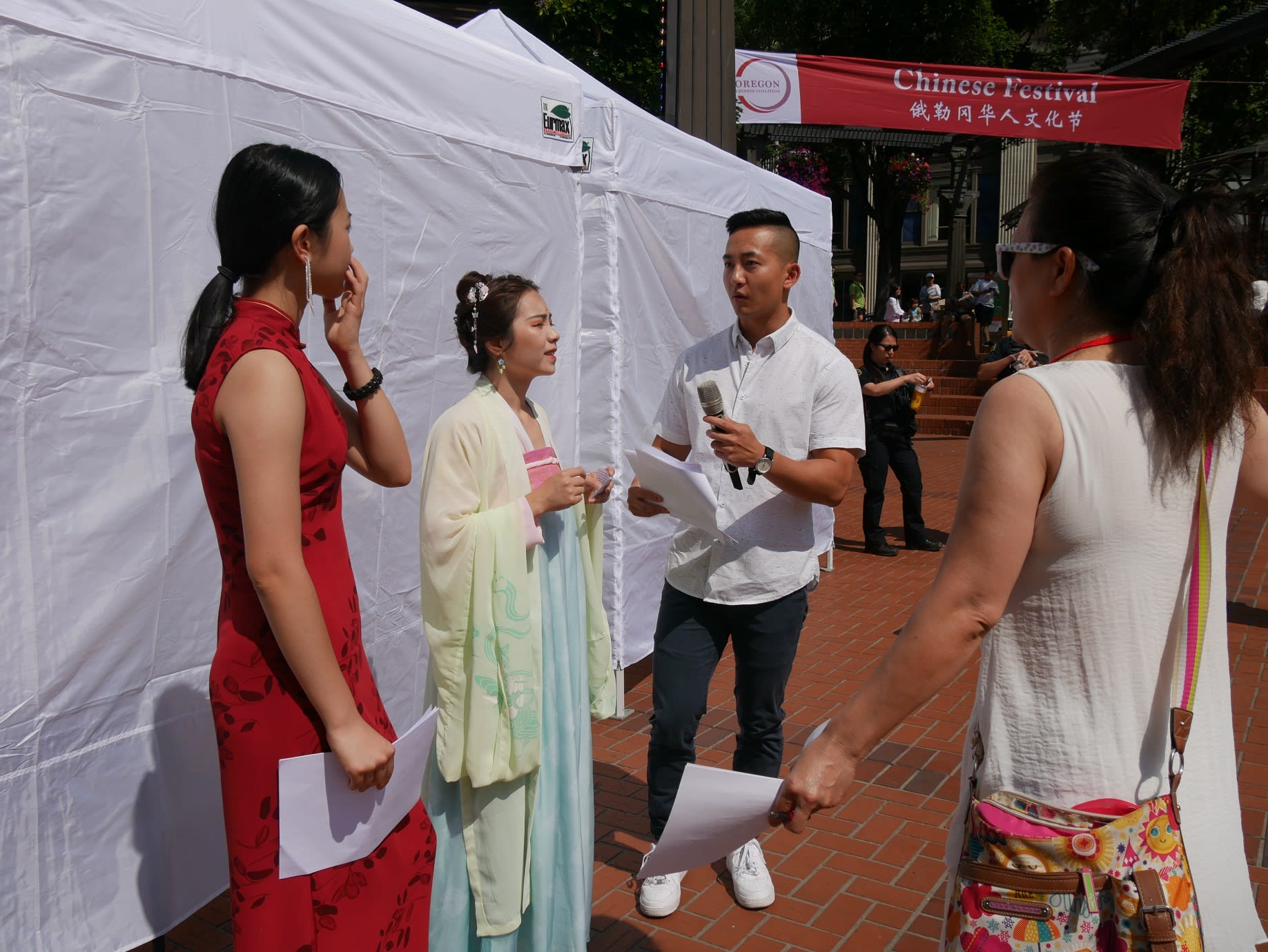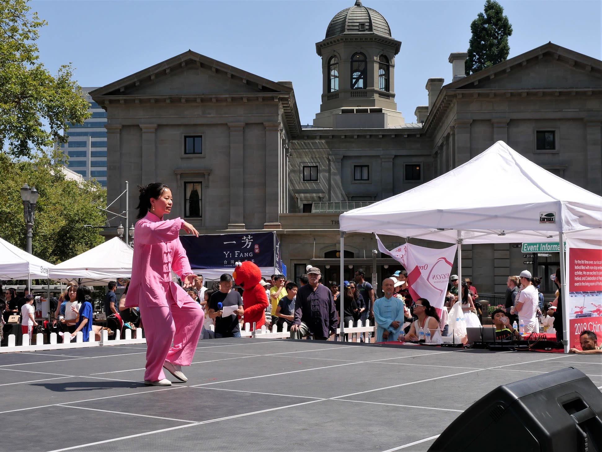 但是无论如何,还是要提到两个团体,一个是来自Corvallis的东方舞艺术团,这是我们社区活动中第一次邀请到Metro之外的华人团体,她们不仅克服了上面提到的团员不齐的问题,对远道而来从没有任何抱怨,只是一再表示能为文化节演出深感荣幸。另一个是高加敏老师的美国武术中心,高老师和女儿前一天刚从国内回来,因为航班的问题,在路途上耽搁了很长时间。旅途劳顿外加天气炎热让高老师的女儿在演出后突然出现了听力问题。高老师心情着急,但是除了一边按人中,还在安慰周边的人。恰巧陈静在旁边,帮助按摩穴位,这才逐渐恢复了听力,大家方如释重负。