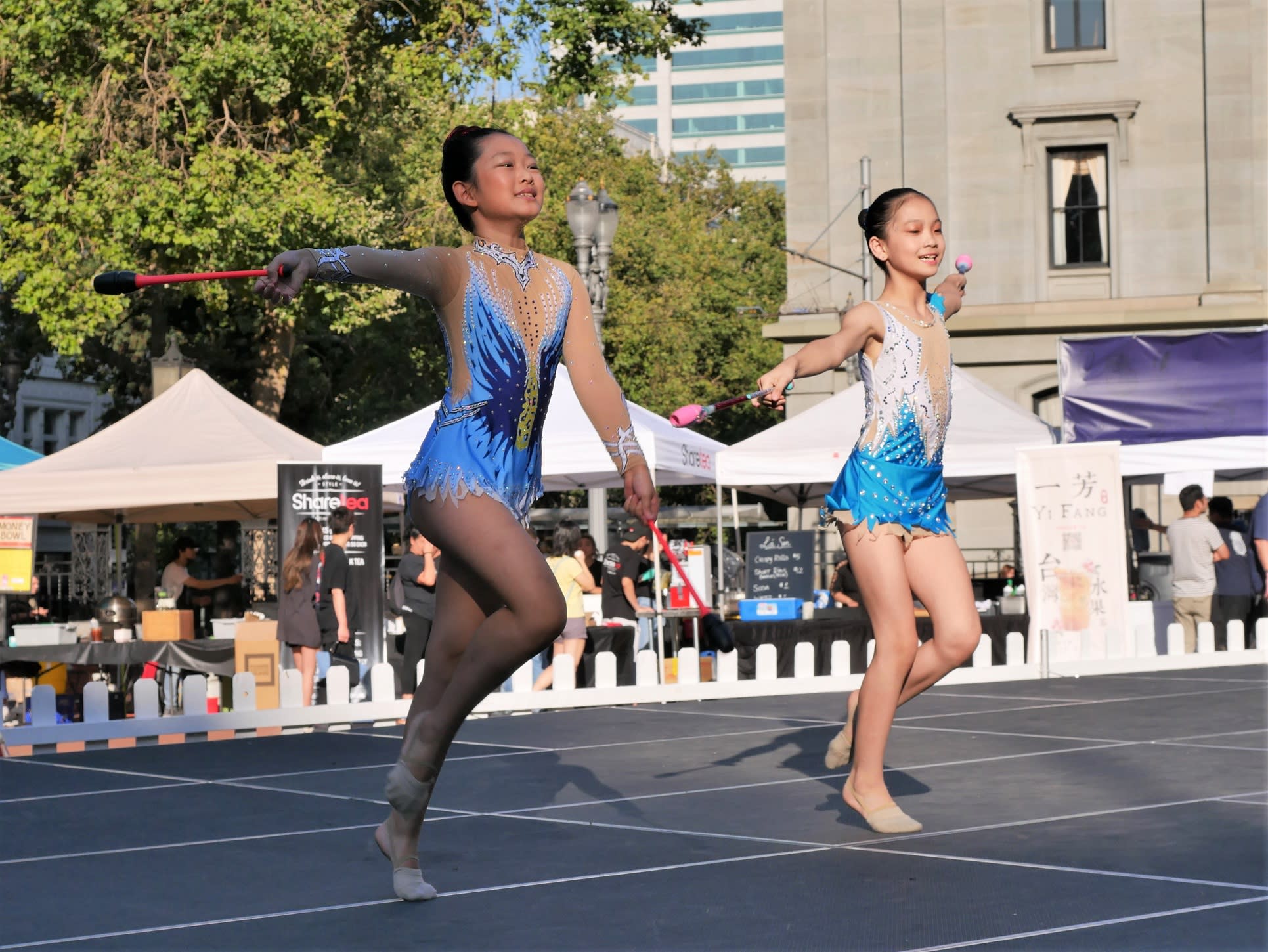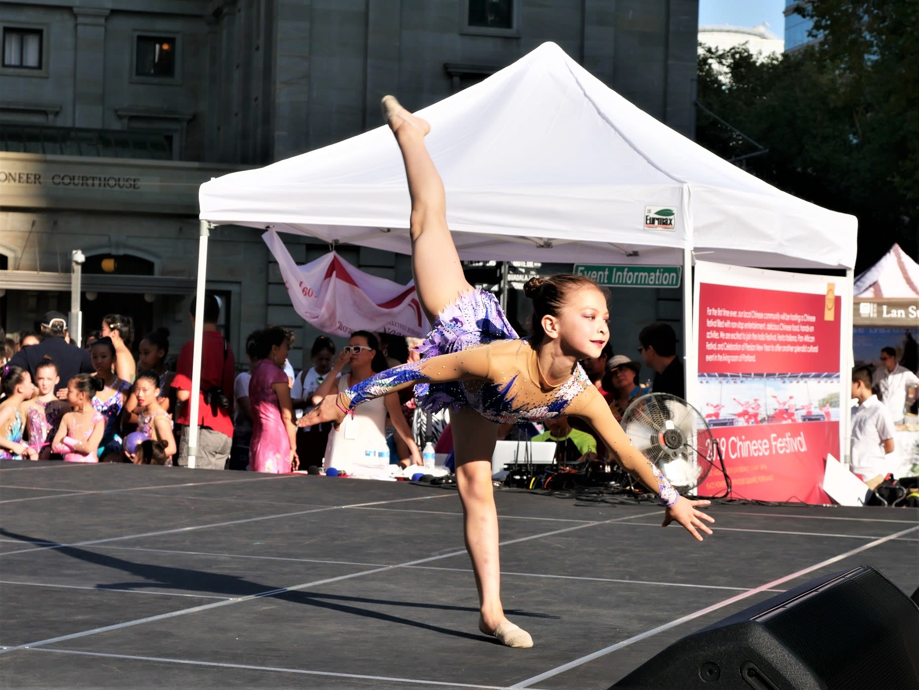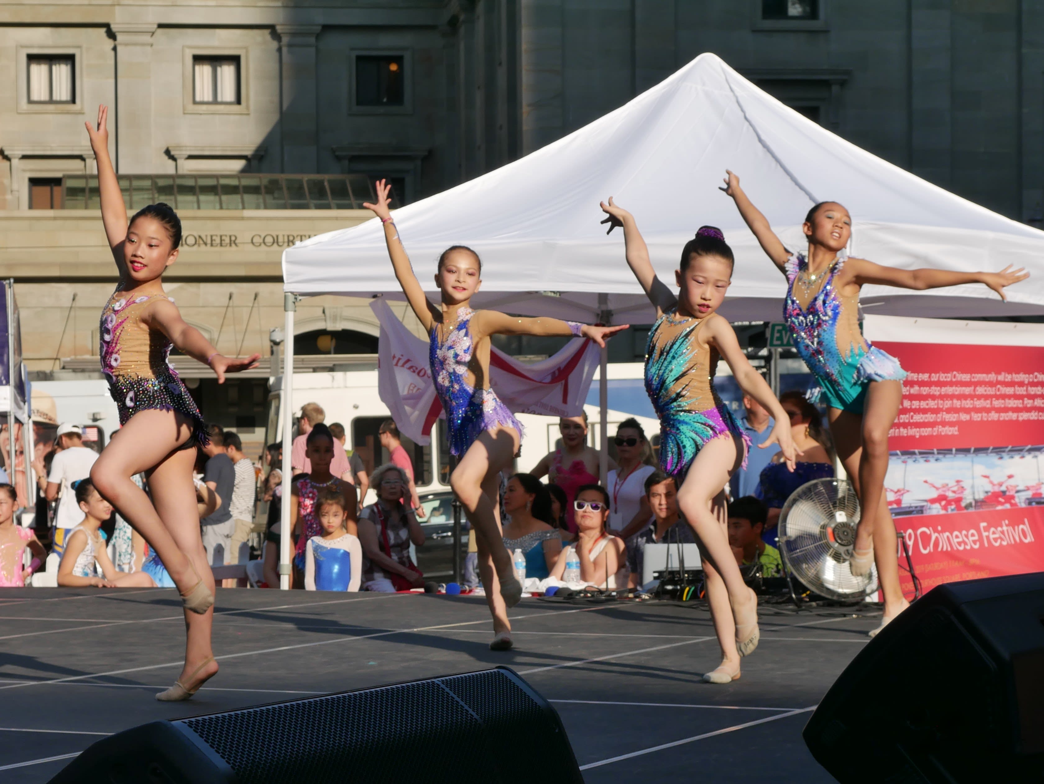 前面说到高老师不顾旅途劳累率队参加文化节演出,实际上我和高老师的对话持续了好几个月了,高老师不仅满腔热情支持这项活动,而且希望能将演出定位在高水平上。为此我们专门加大了舞台,但是最后还是发生了此次活动最大的glitch,现场的舞台台面太硬太滑,使得很多队员,也包括后面上台的Oregon Rhythmic Gymnastics and Dance队员,在演出中出现了皮肤擦伤的问题。在此向两个学校参演的学生们做出诚挚的道歉。活动结束后,已经和舞台公司做了沟通,当天搭建的舞台是他们最新的式样,以后再有活动可以专门提供更为合适的带有地毯的舞台供我们使用。