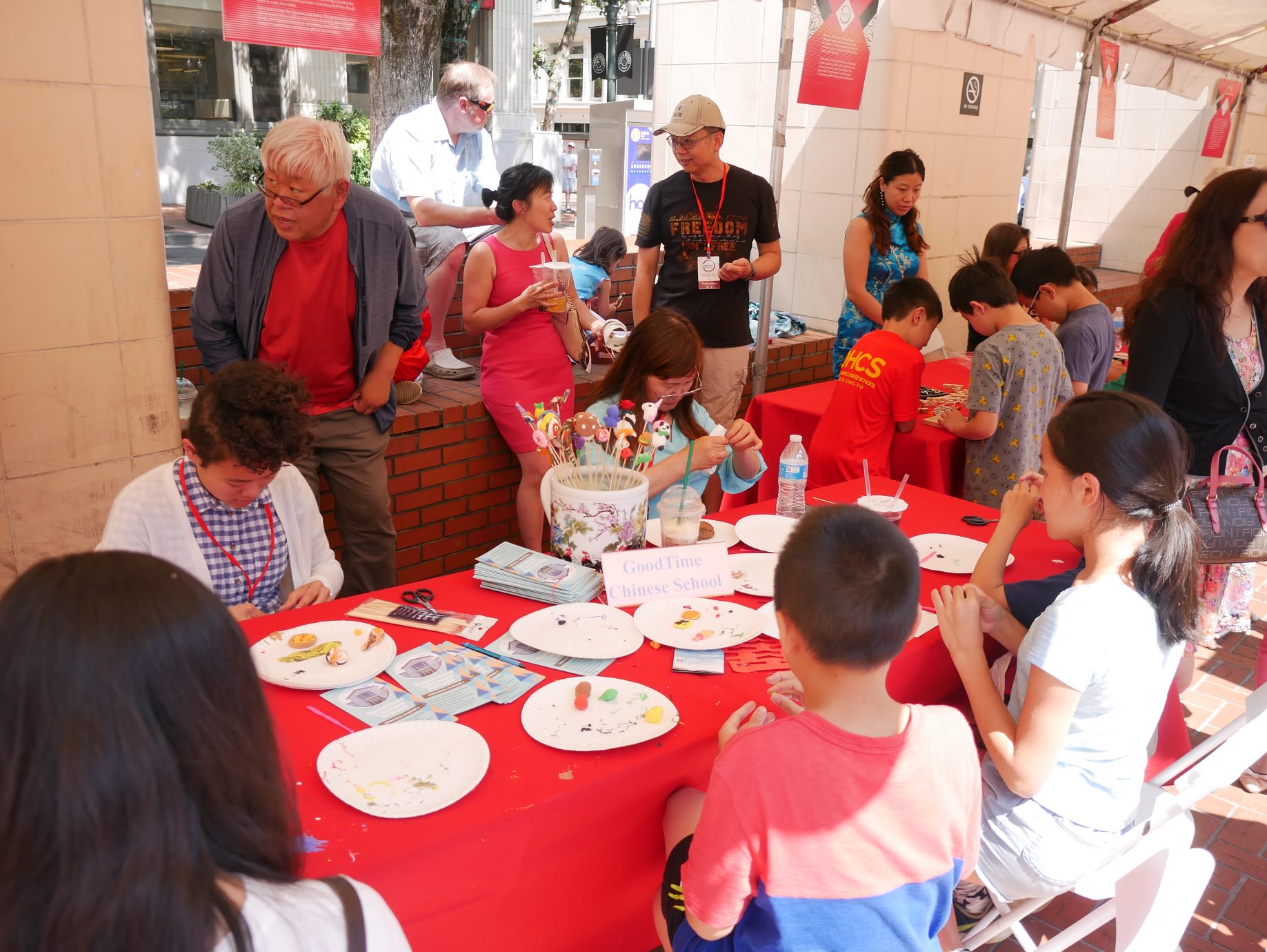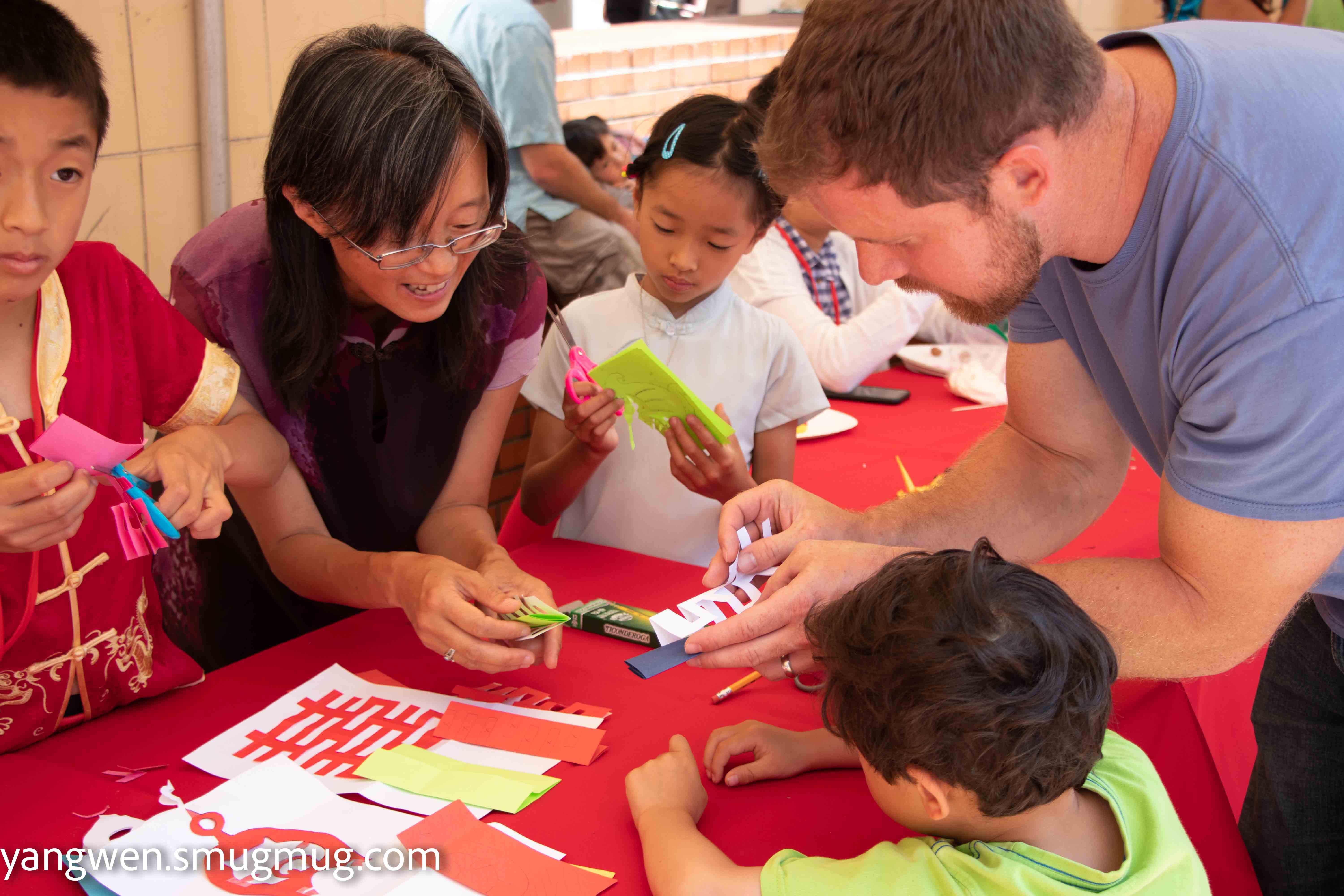 上面是我们这次文化节非常unique的部分,就是由义工们负责的动手活动。从照片上看每一项活动都吸引很多游人,尤其是孩子们。值得一提的是,我们为文化节特意制作了50个义工胸牌,因为按照三个时段,每个时段应该在30人左右。没想到开场没几分钟,所有的胸牌就发完了,我们忘了开场前的准备部分的义工就有20人之多。这是我们在现场遇到的第一个glitch。