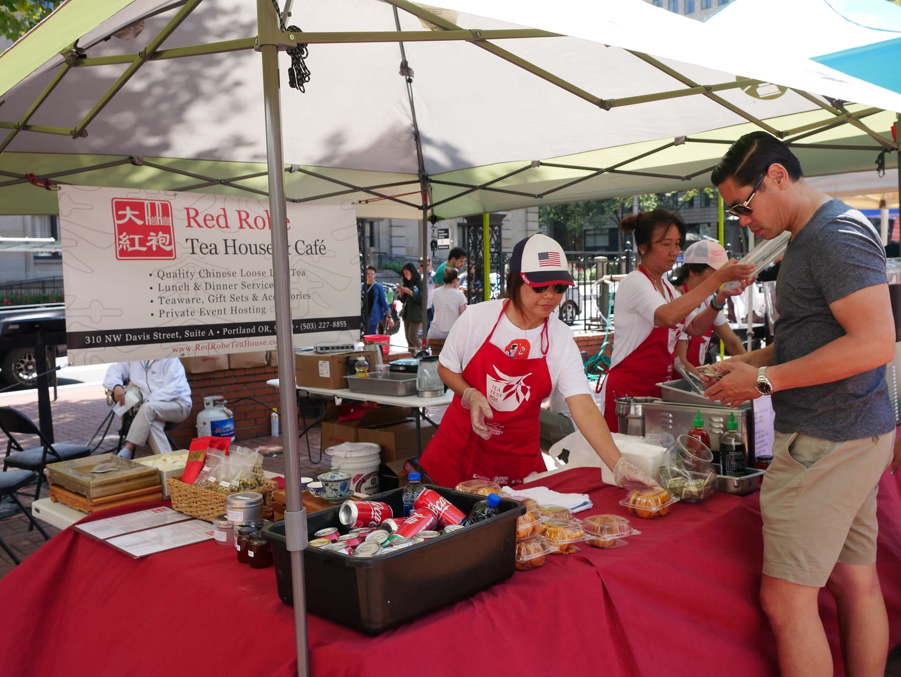 饮食文化是不可或缺的一部分,我们非常感谢参加此次活动的7个商家。说心里话,他们是不是有赚到钱,除了一芳之外,我心里一点没数,如果回头在survey中知道亏钱了,我绝不会奇怪。这次组织这项活动,方知做为商家的成本该有多高。但是,从一开始每一个商家都是从支持我们自己的文化节角度来参与的。于作华和Mandy(茗迪)给了我大量的细节介绍,基本上是一路扶持我们走过整个过程的,包括最后提醒我把自家的水管子拿过去,解决商家用水的问题,等等,等等。因为西北角的星巴克拥有整个广场咖啡销售的垄断权,In J Coffee的Joe只能在现场赠送自己心爱的云南咖啡。