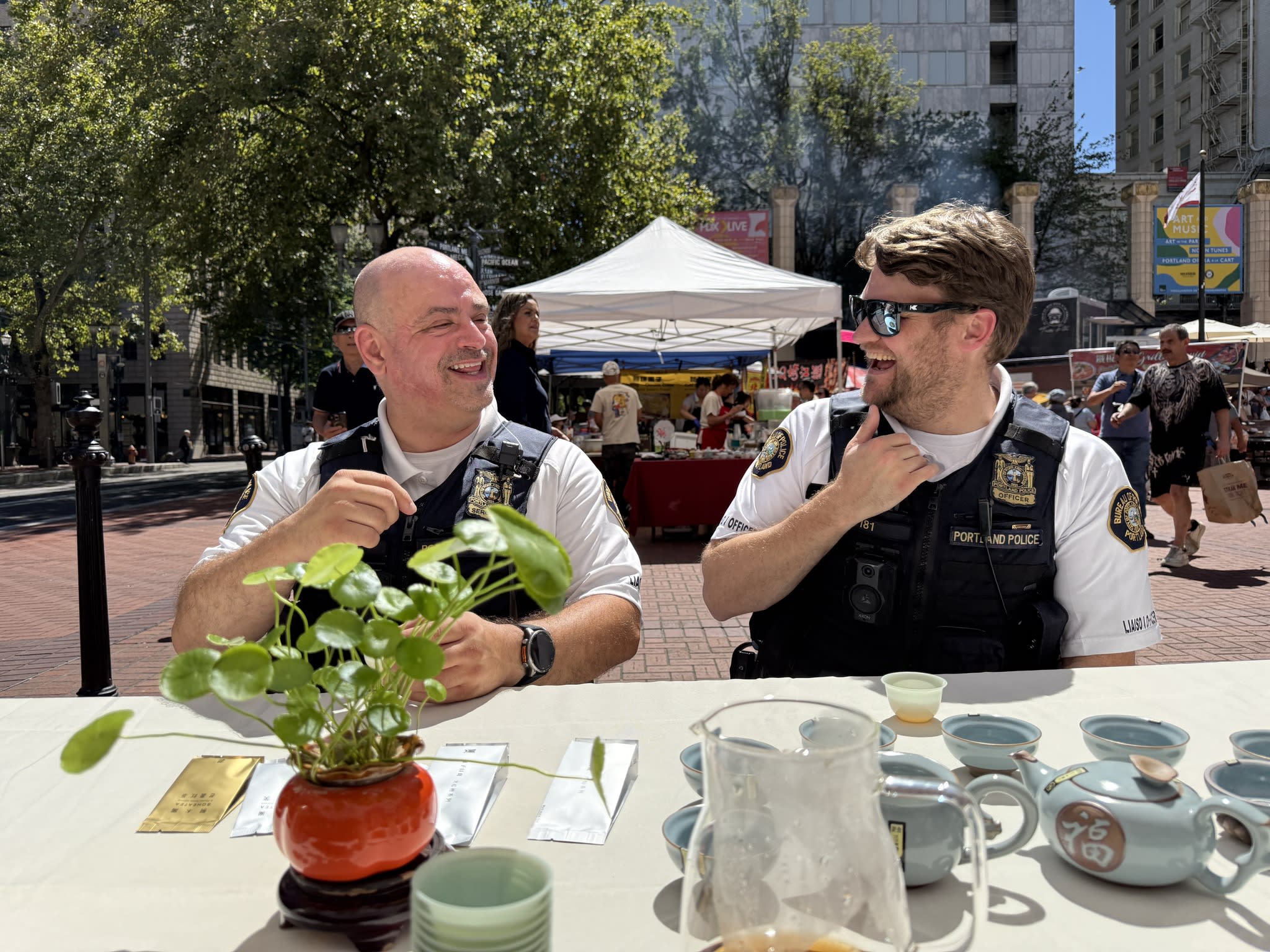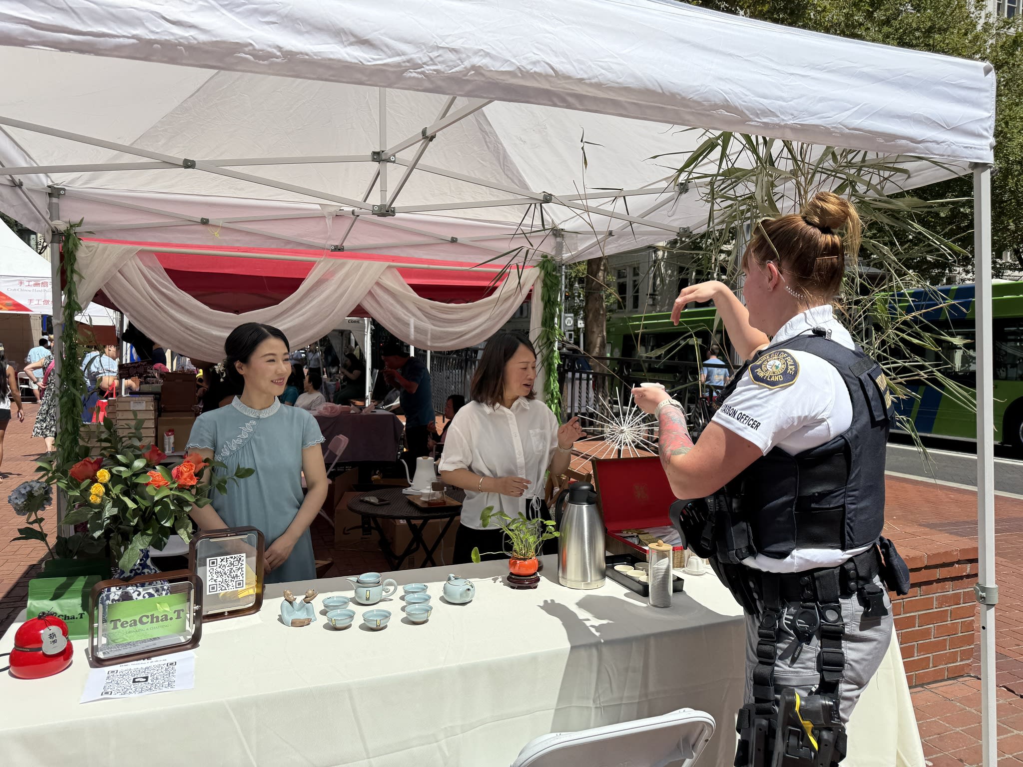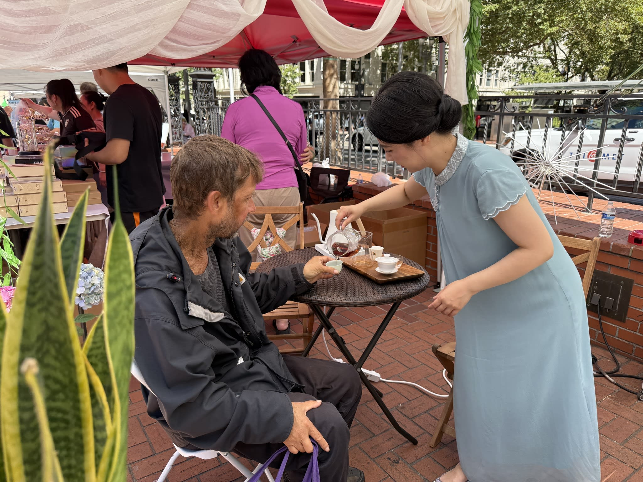 Tea is a timeless cultural symbol that has connected people across centuries and from all walks of life. At the tea stand, we served tea to the officers, whose presence brought a sense of peace and harmony to everyone at the event. A homeless friend was invited to a VIP seat in the back, savoring a pour of exquisite tea from one of China’s most renowned mountains.