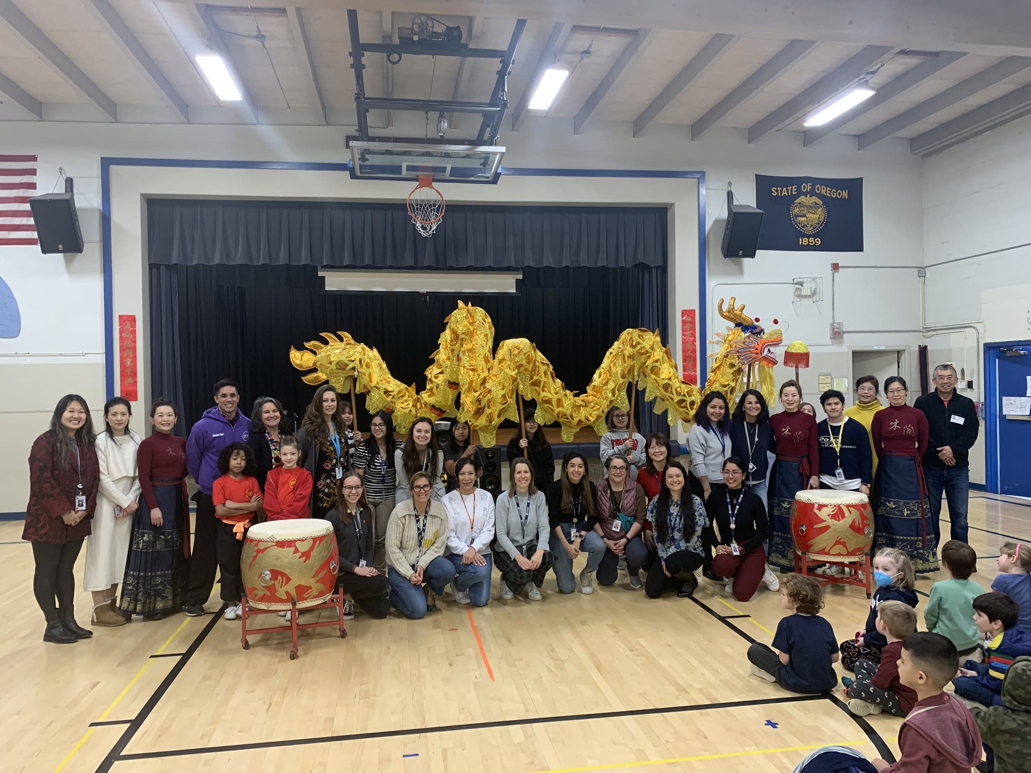 受到社区孩子们喜爱的这条龙出生在旧金山的唐人街。拥有50年历史的文化礼品店老板为我们推荐了这条龙。上周五在 Lake Oswego 的 Palisades World Language School 首次亮相,与老师同学们共庆农历新年的还有璐璐老师的古筝、俄勒冈希望中文学校的武术功夫和木兰鼓队的大鼓。