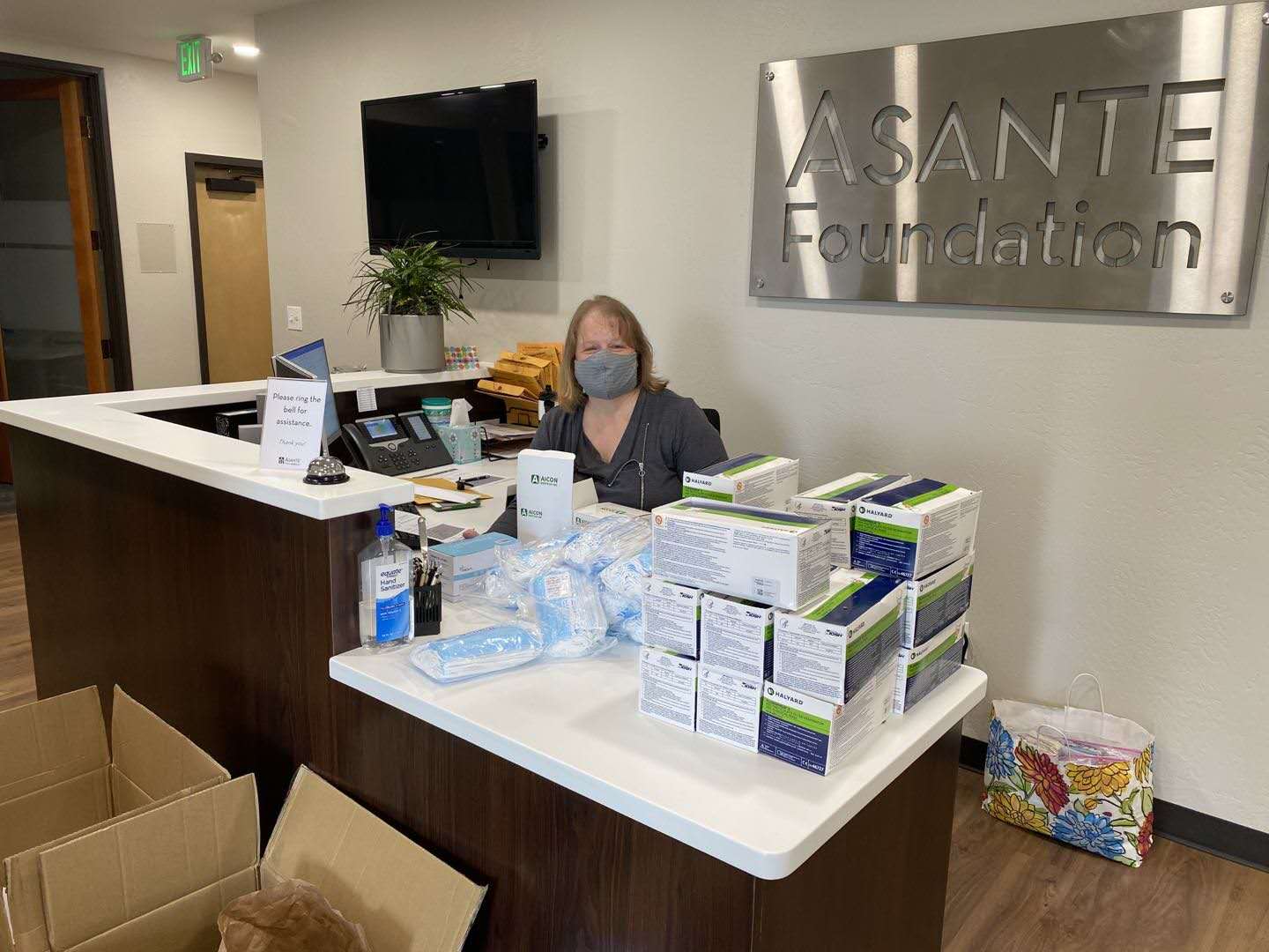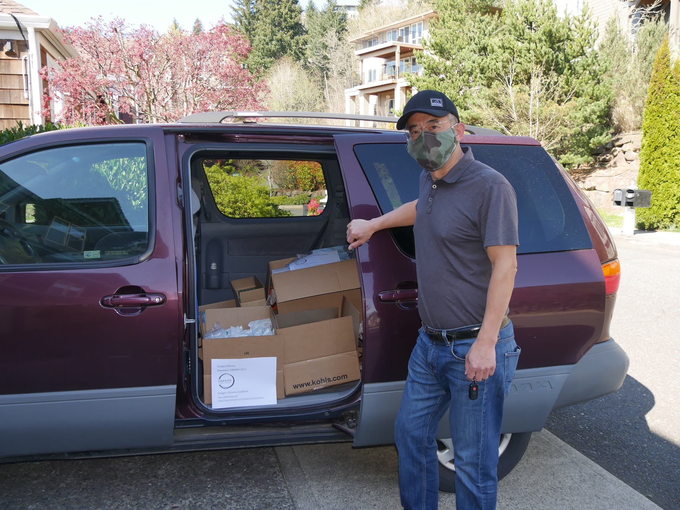 今天,金教授不辞辛苦,驱车3个多小时来到Medford,拜访了Asante Foundation。那里的PPE供应问题更加的严重,她们动员本地900个家庭缝制口罩。金教授深受感动,给她们留下了1,260个N95和500多个一次性口罩。