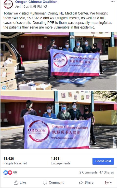 【社区捐赠医疗物资活动进展4/21】 无论过去一个月多么的难熬,今天是最开心的一天了,昨天收到用大家捐款购买来的N95口罩,不想耽搁一天,所以一大早便踏上了捐赠之路。 第一站是位于Sunnyside的Kaiser,我们放下了1,830个N95。接受捐赠部门的员工很会摆pose,拍出来了一幅画面非常棒的照片。紧接着驱车南下,在Salem Fire Station 6 与OCC理事,也是UO教授的老金碰面,在那里给消防队留下了700个一次性口罩和KN95。也是在那里,Salem当地报纸记者对我们做了现场采访。之后我们来到Salem Hospital,他们对之前大王群友捐赠仍然感激不尽,这次我们的到来更加强化了华人社区对当地医护人员支持的良好印象。在那里我们捐赠了2,310个N95和40个隔离面罩。