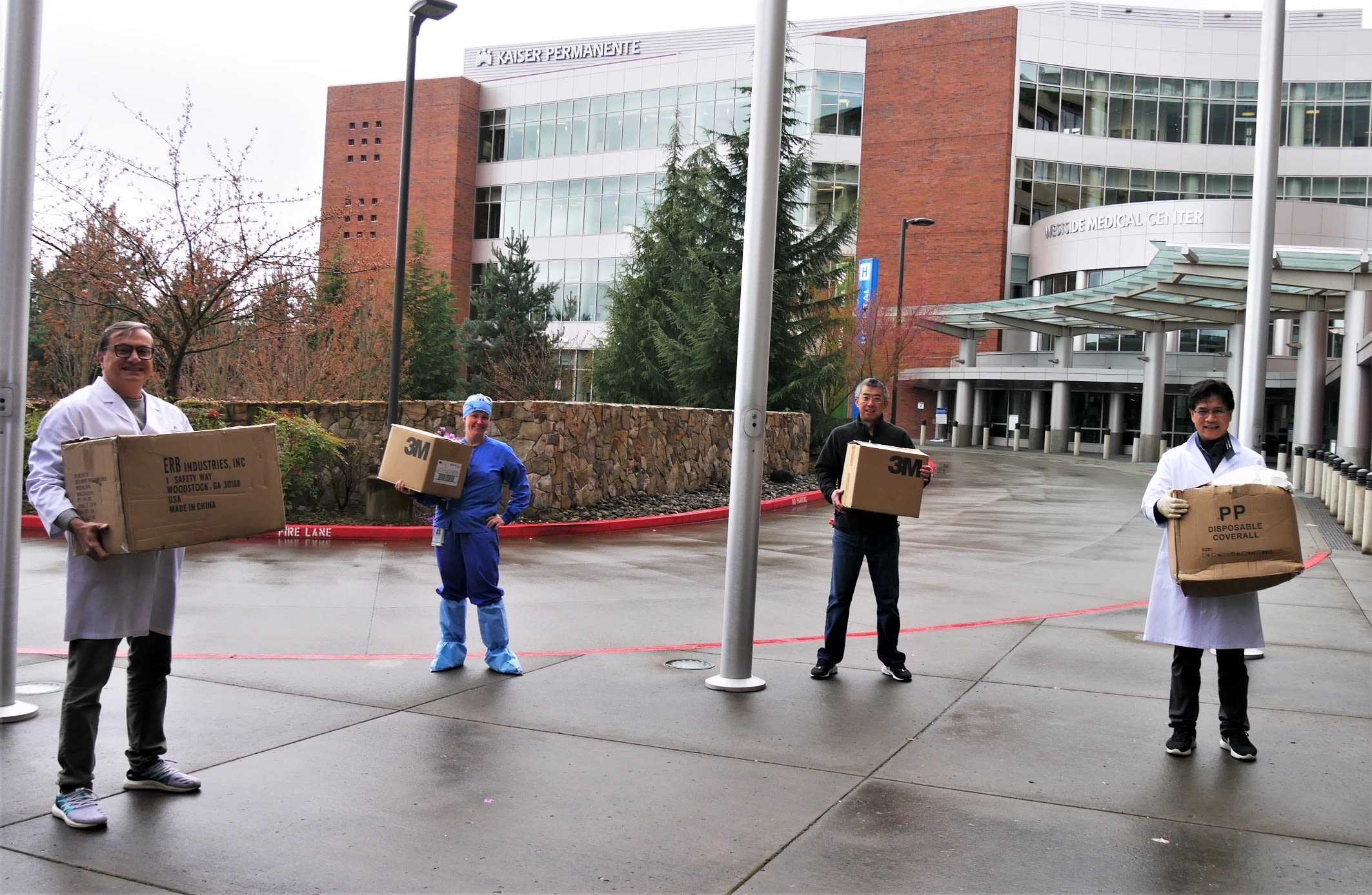 【社区捐赠医疗物资活动进展4/1】 今天,前往Kaiser Westside Medical Center,将转运中国(uszcn.com)和京华楼(mandarinhousepo.com)东家丛迅捐赠的120付护目镜和100件防护服送给了战斗在抗击疫情一线的医护人员,这两样物品正是医护人员最缺的。感谢徐风平医生从中安排并介绍医院为应对疫情而采取的各项措施,期间也提到医院对医生使用N95几近’吝啬’的程度,令人不胜唏嘘。希望我们订购的口罩能尽快顺利到达,早日送到他们手中。