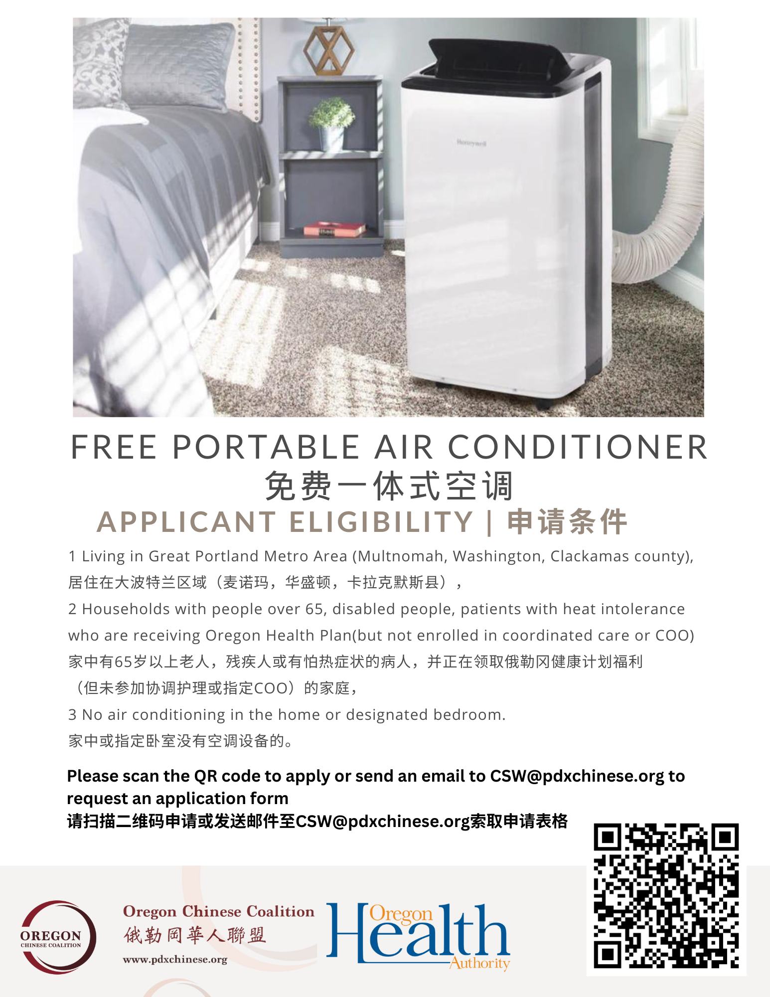 OCC今年又得到100台空调,专门针对有健康问题的65岁以上老年人。今年的重大调整是申请人不可以是CCO的成员。所谓CCO指的是健康协调护理组织,波特兰及周边地区基本上是Heath Share of Oregon,持有的卡如下面的图片所示。对于符合资格的老人,如果是在波特兰及周边地区,OCC会负责送货上门,并在需要时提供免费的安装服务。外地的则需要家人或安排人来波特兰领取。希望这些空调能帮助有需要的老人们安然度过这个炎热的夏天。