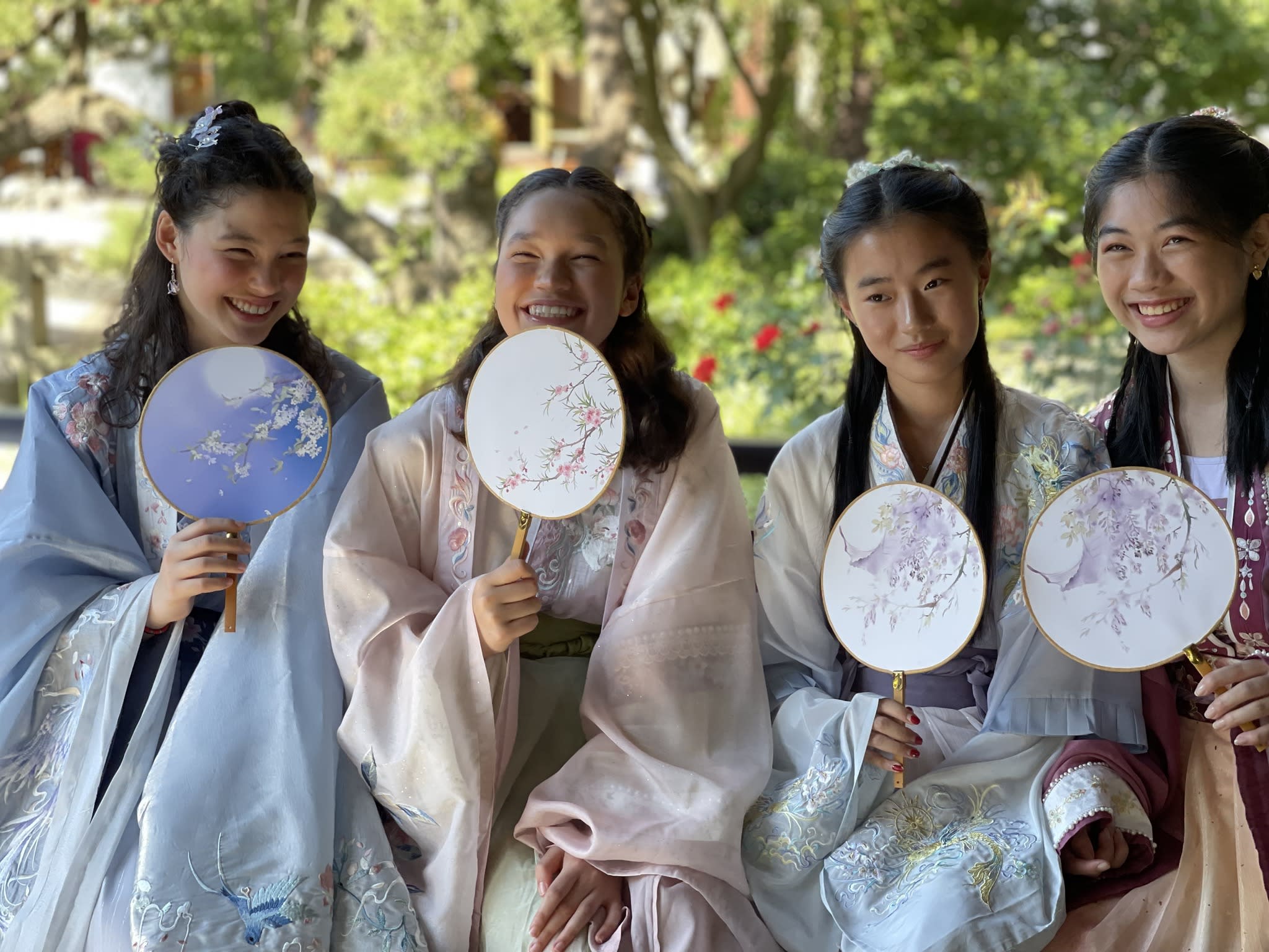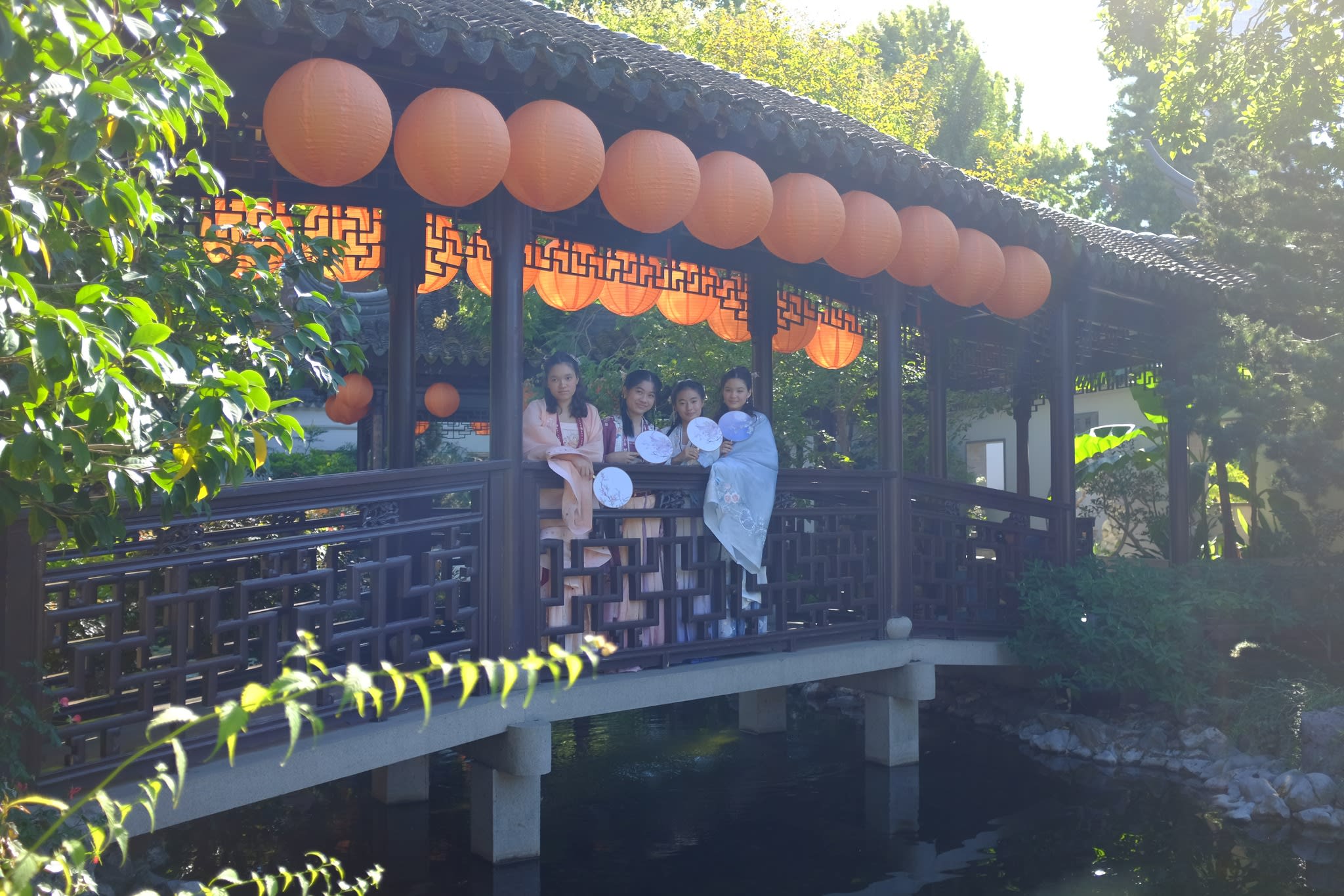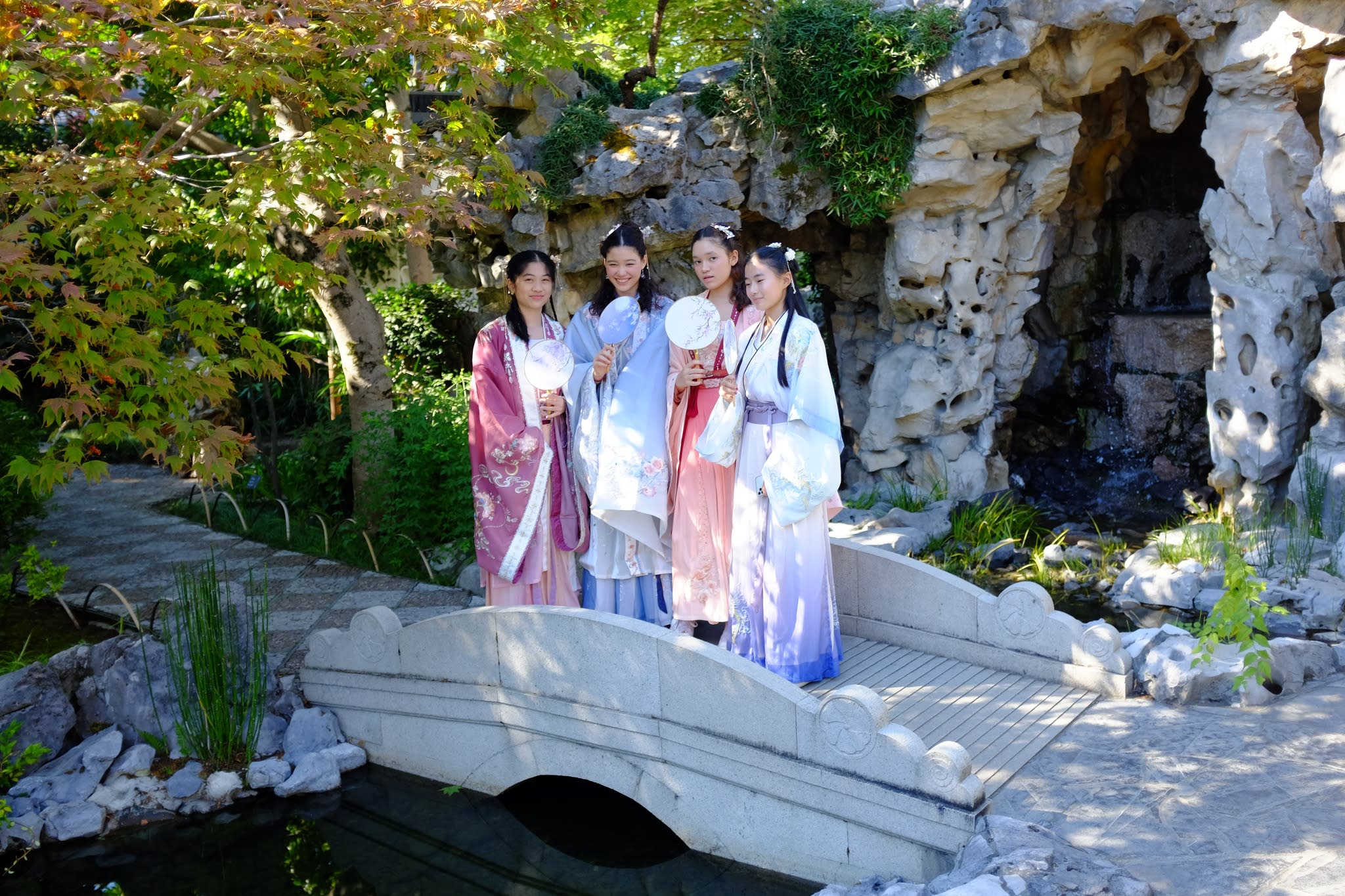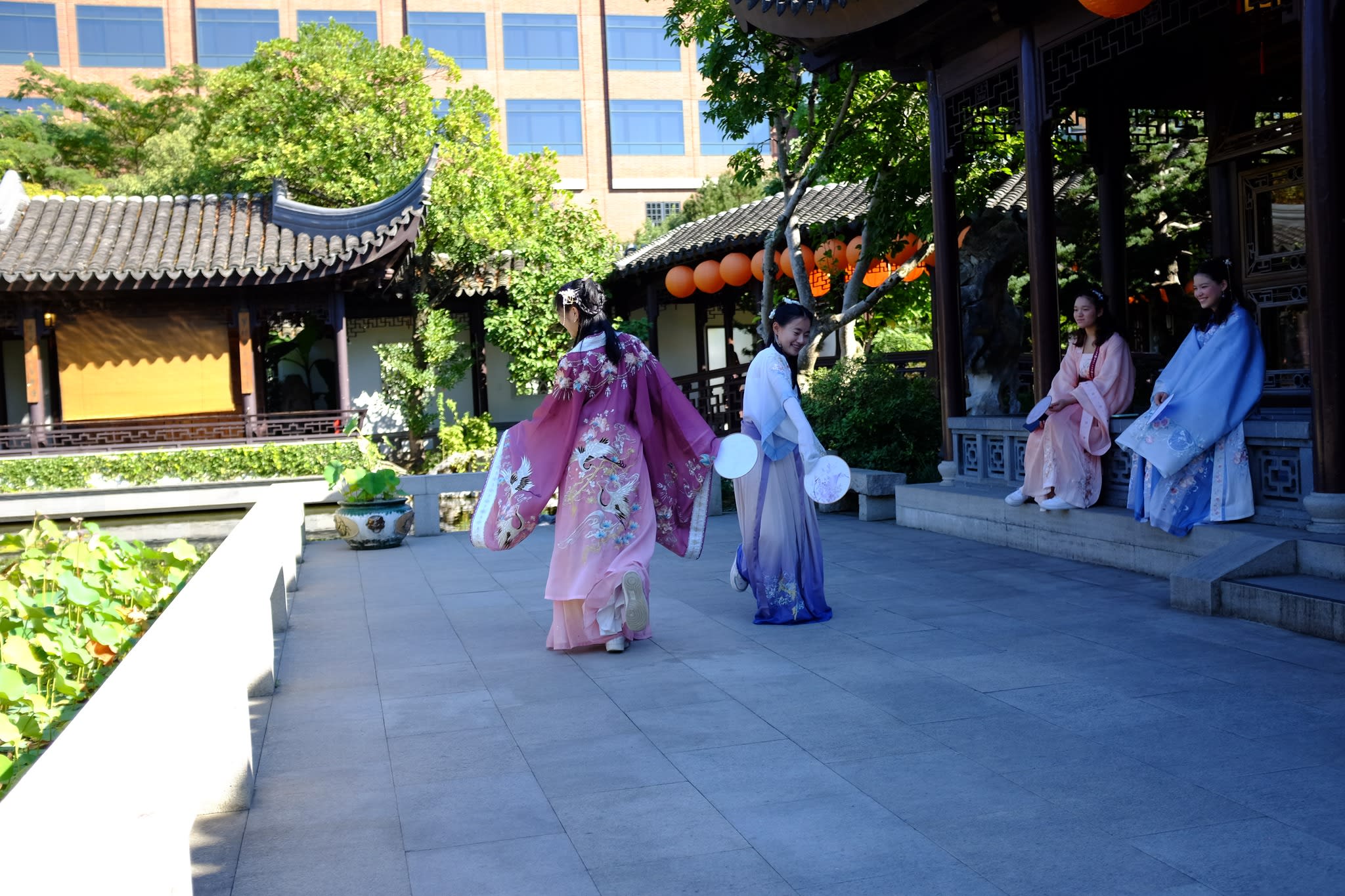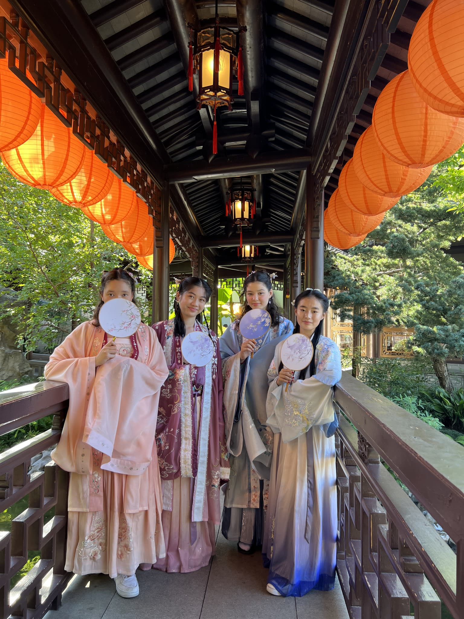 这是我们一直期待的,由身着汉服的女孩子们们展示中国传统服饰之美的WOW时刻。周日下午,青少年舞蹈队的四名高中生来到了兰苏园,尽情享受传统园林带给她们的意境。同时,她们的出现,也让花园穿越时空,似乎回到一千年前的朝代。