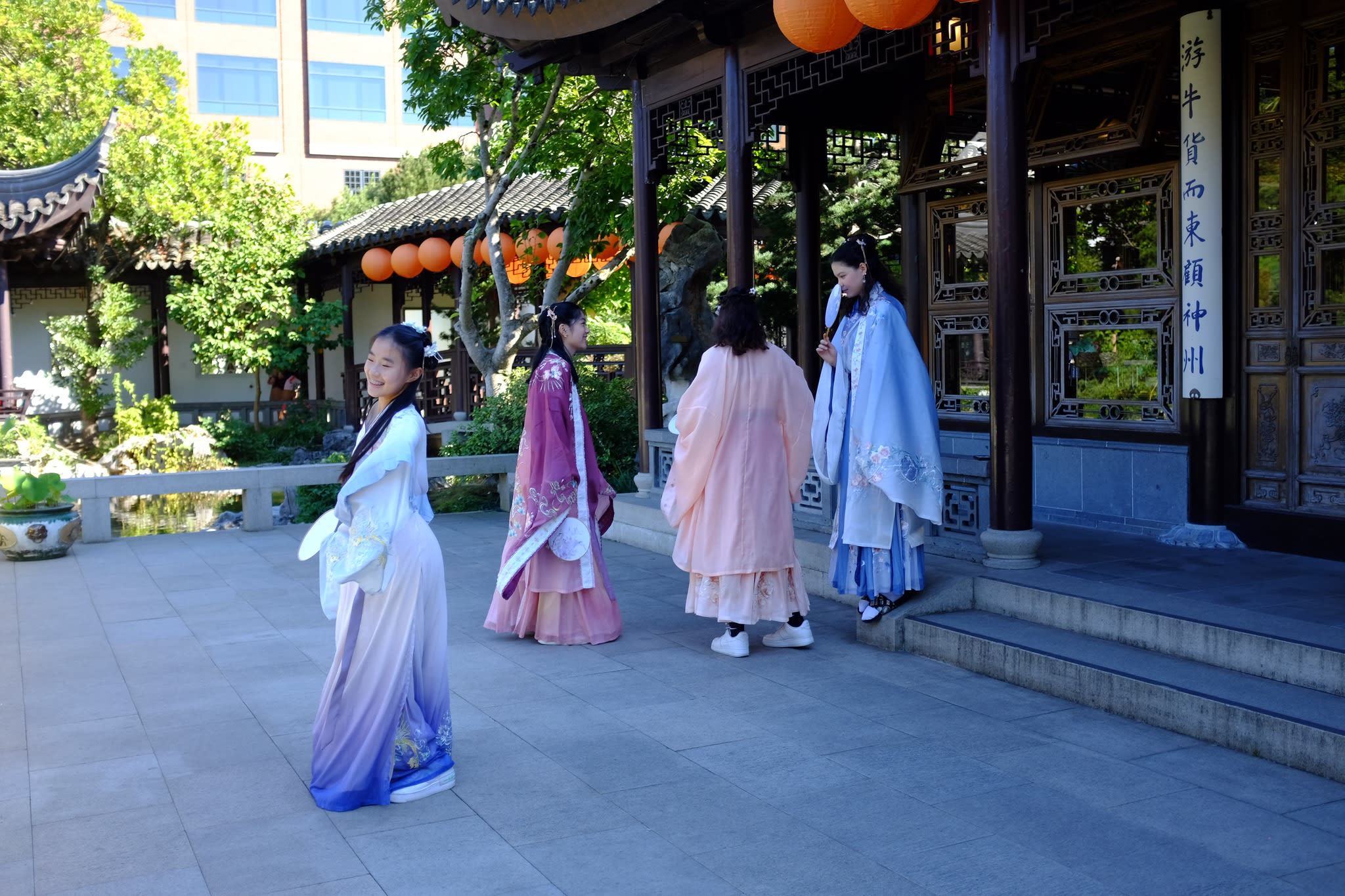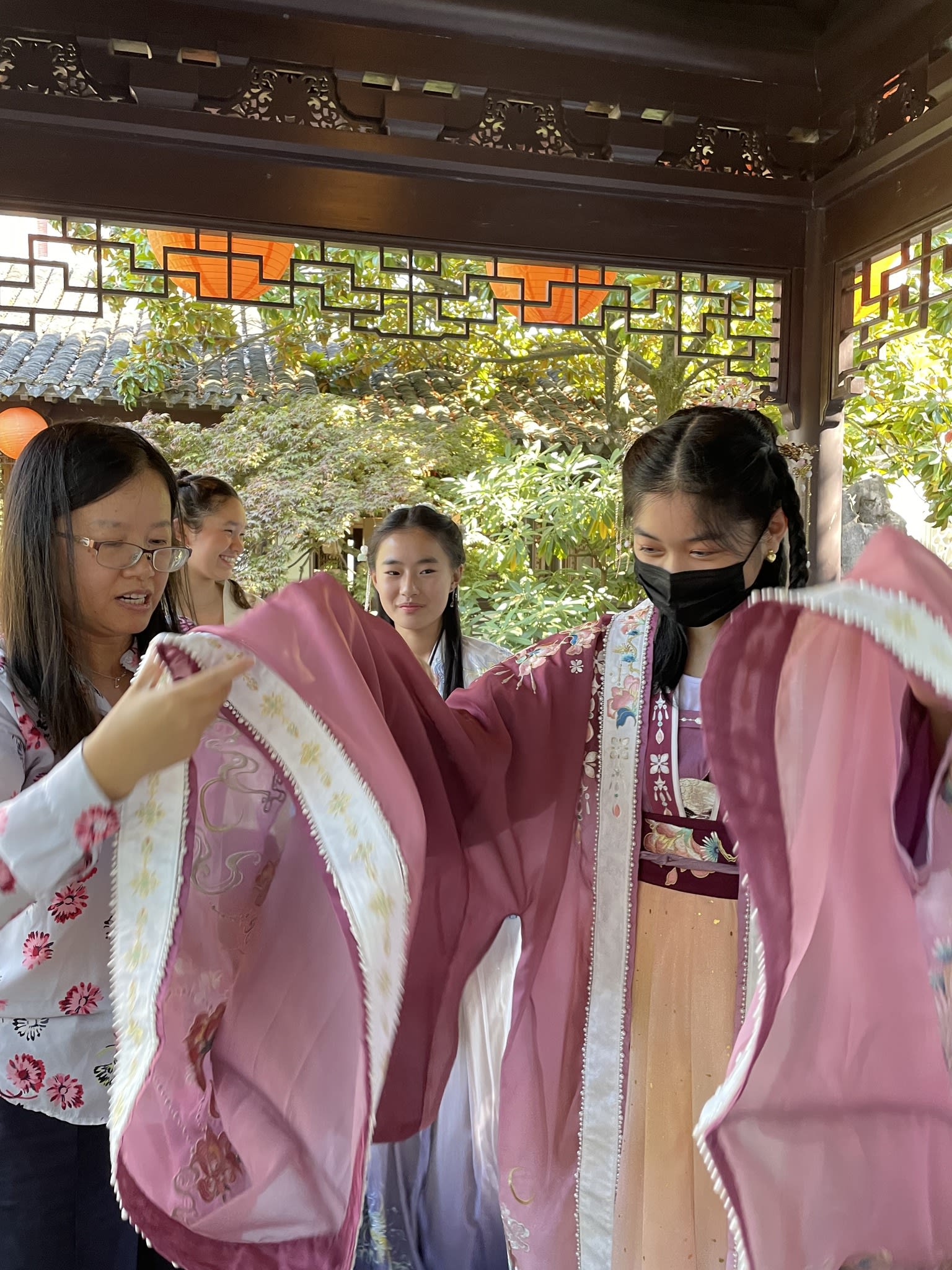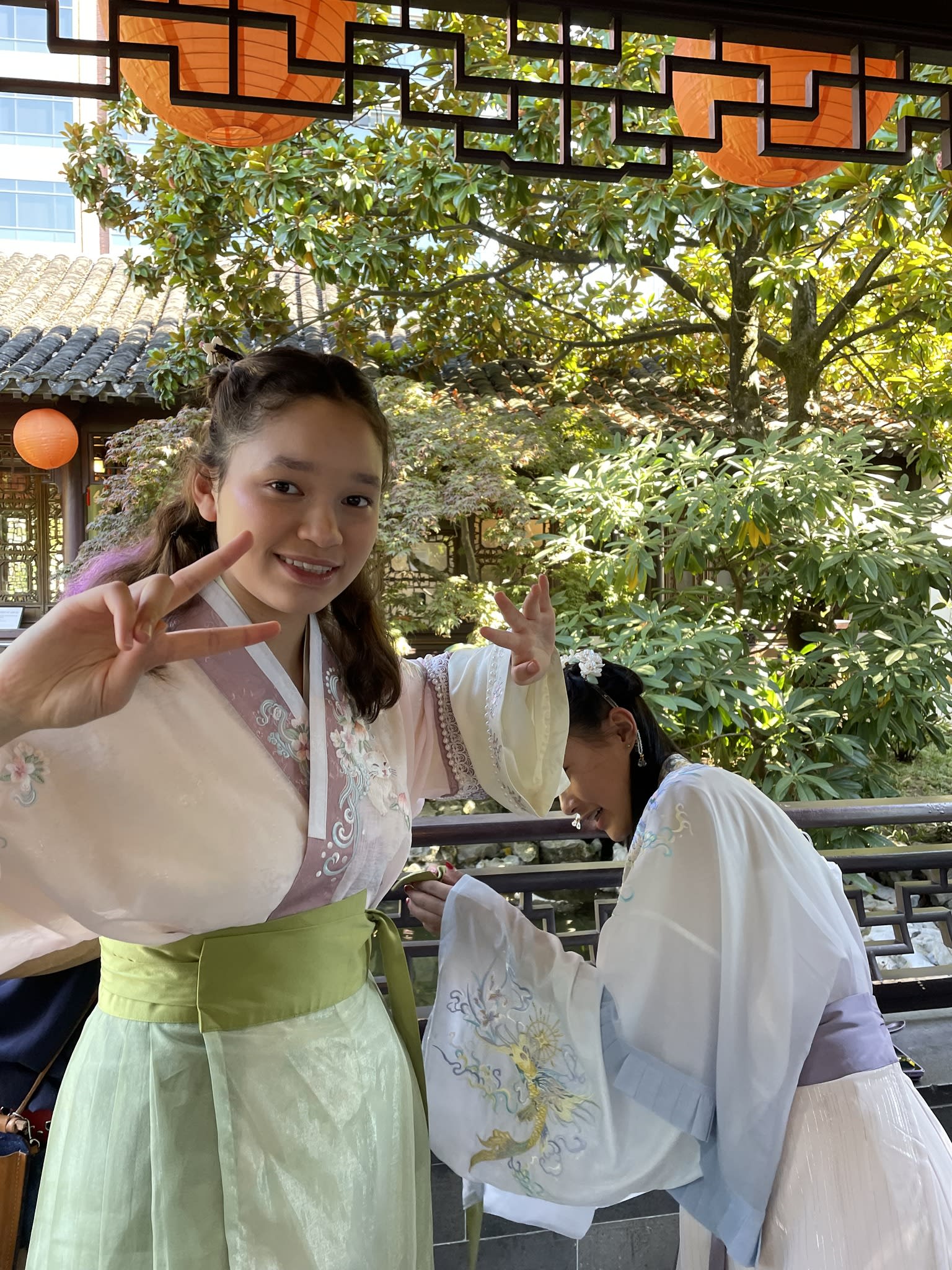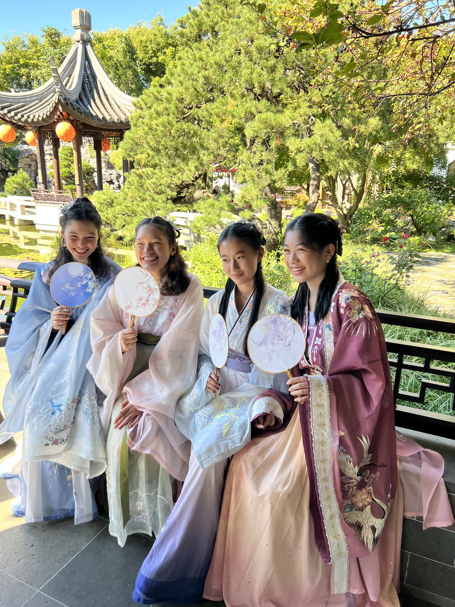 这是我们一直期待的,由身着汉服的女孩子们们展示中国传统服饰之美的WOW时刻。周日下午,青少年舞蹈队的四名高中生来到了兰苏园,尽情享受传统园林带给她们的意境。同时,她们的出现,也让花园穿越时空,似乎回到一千年前的朝代。