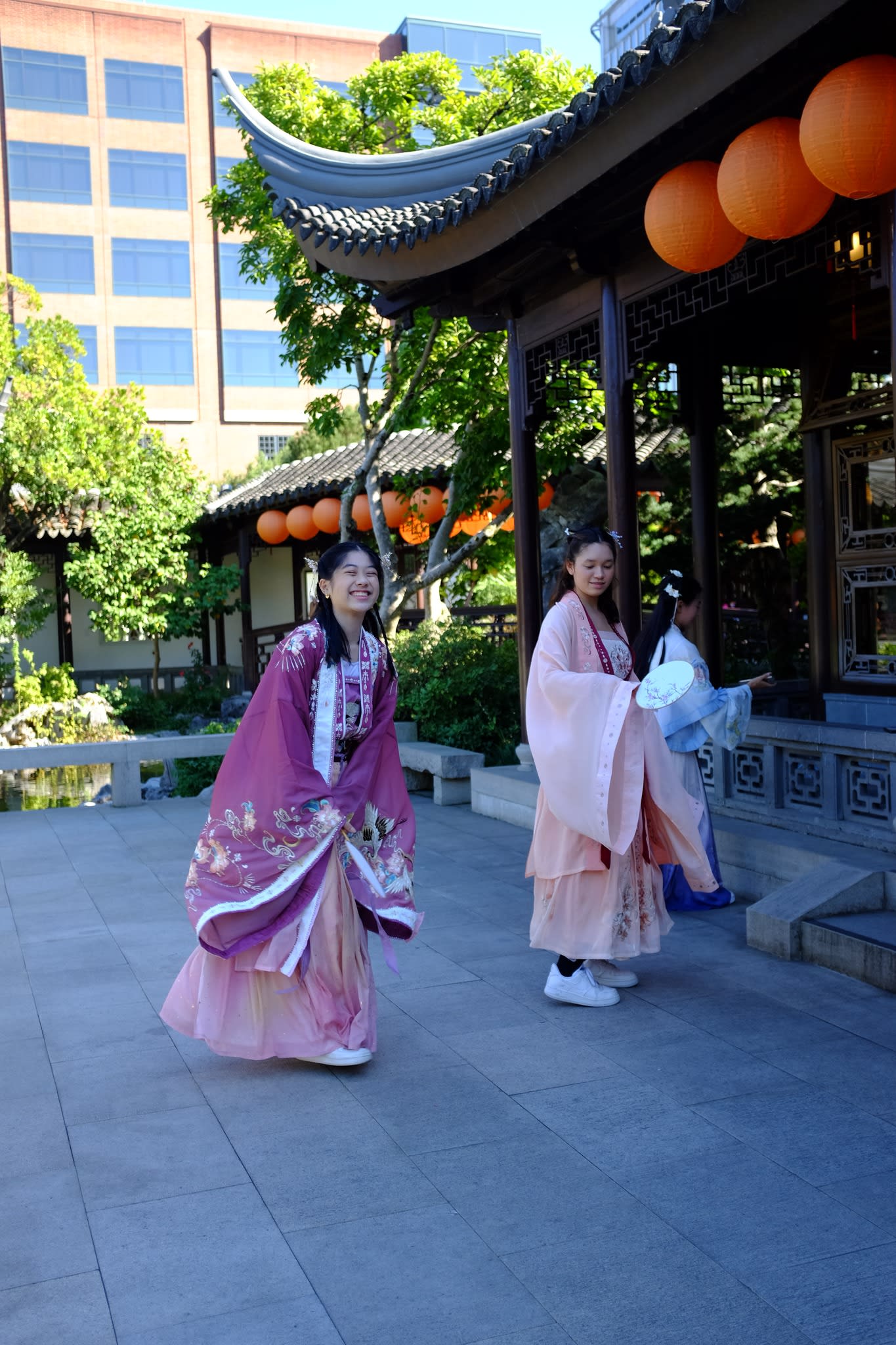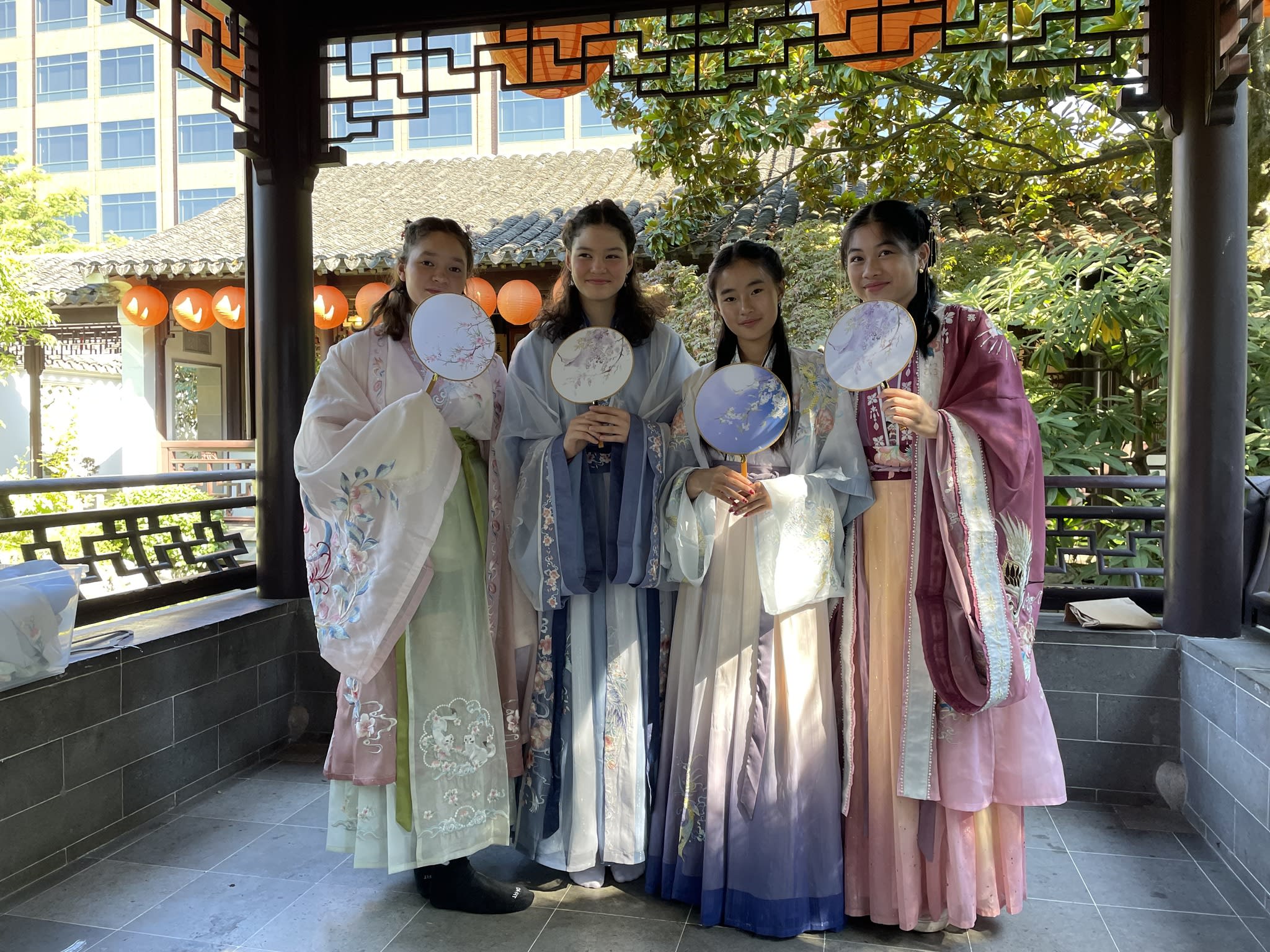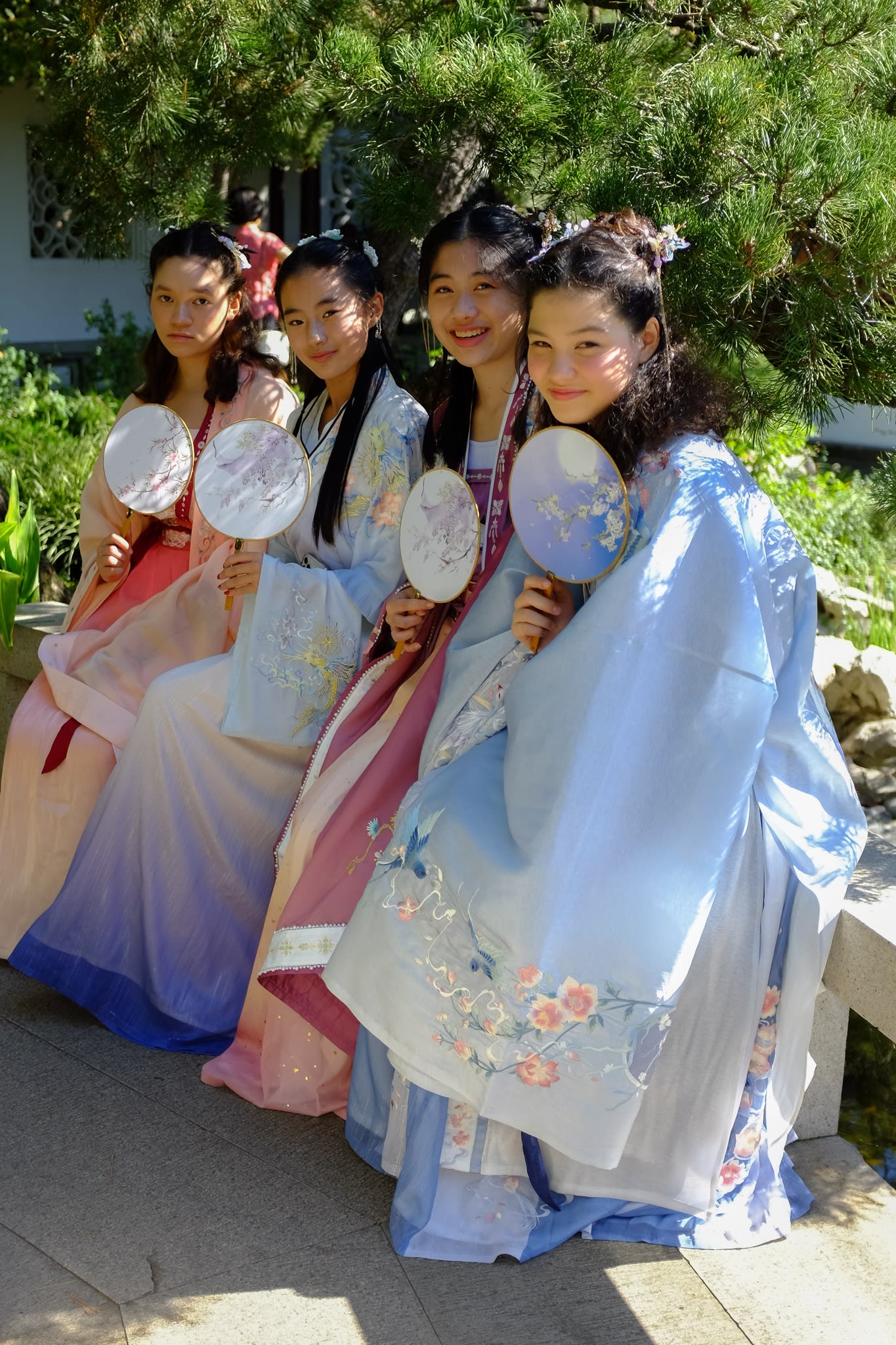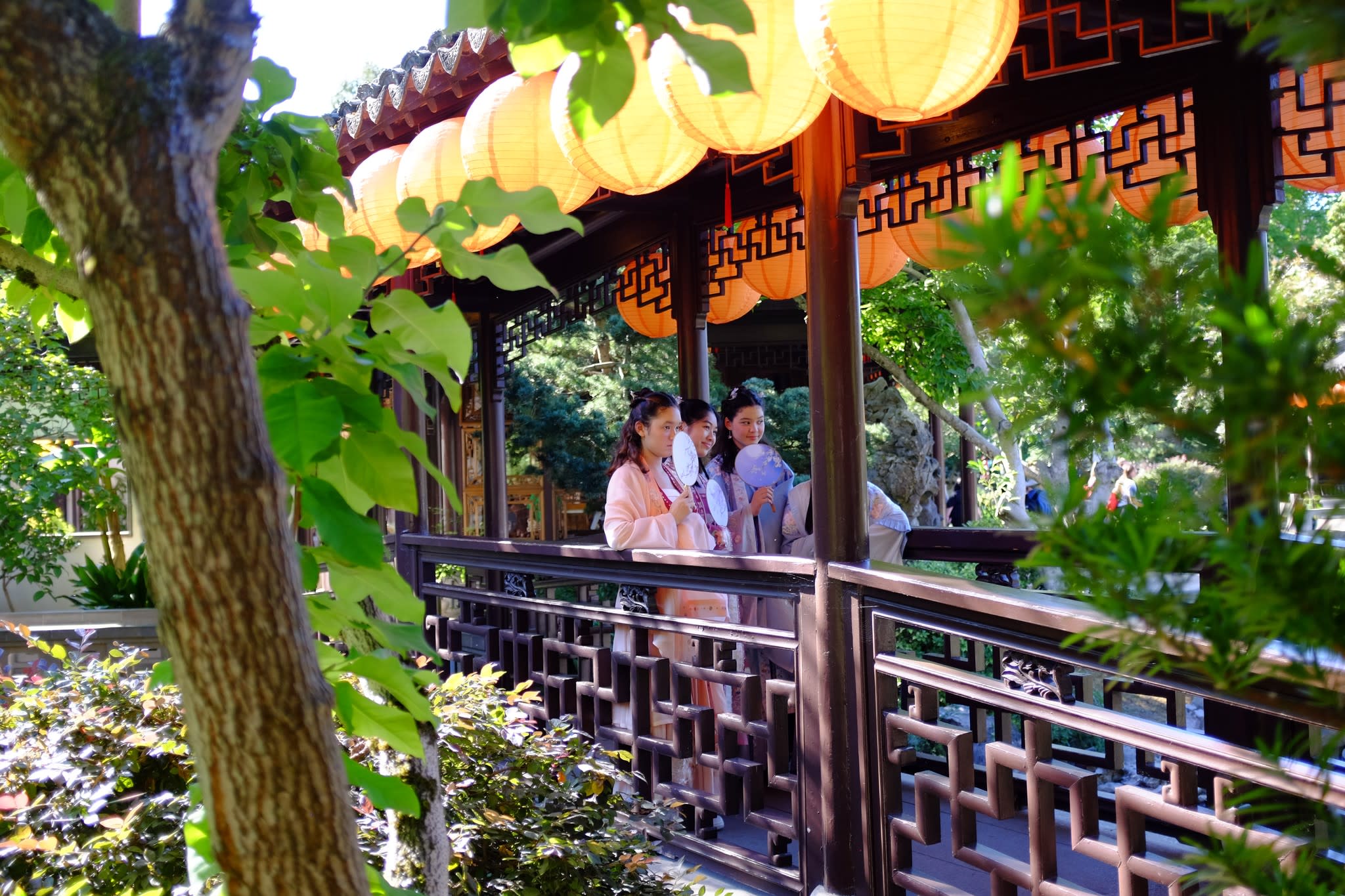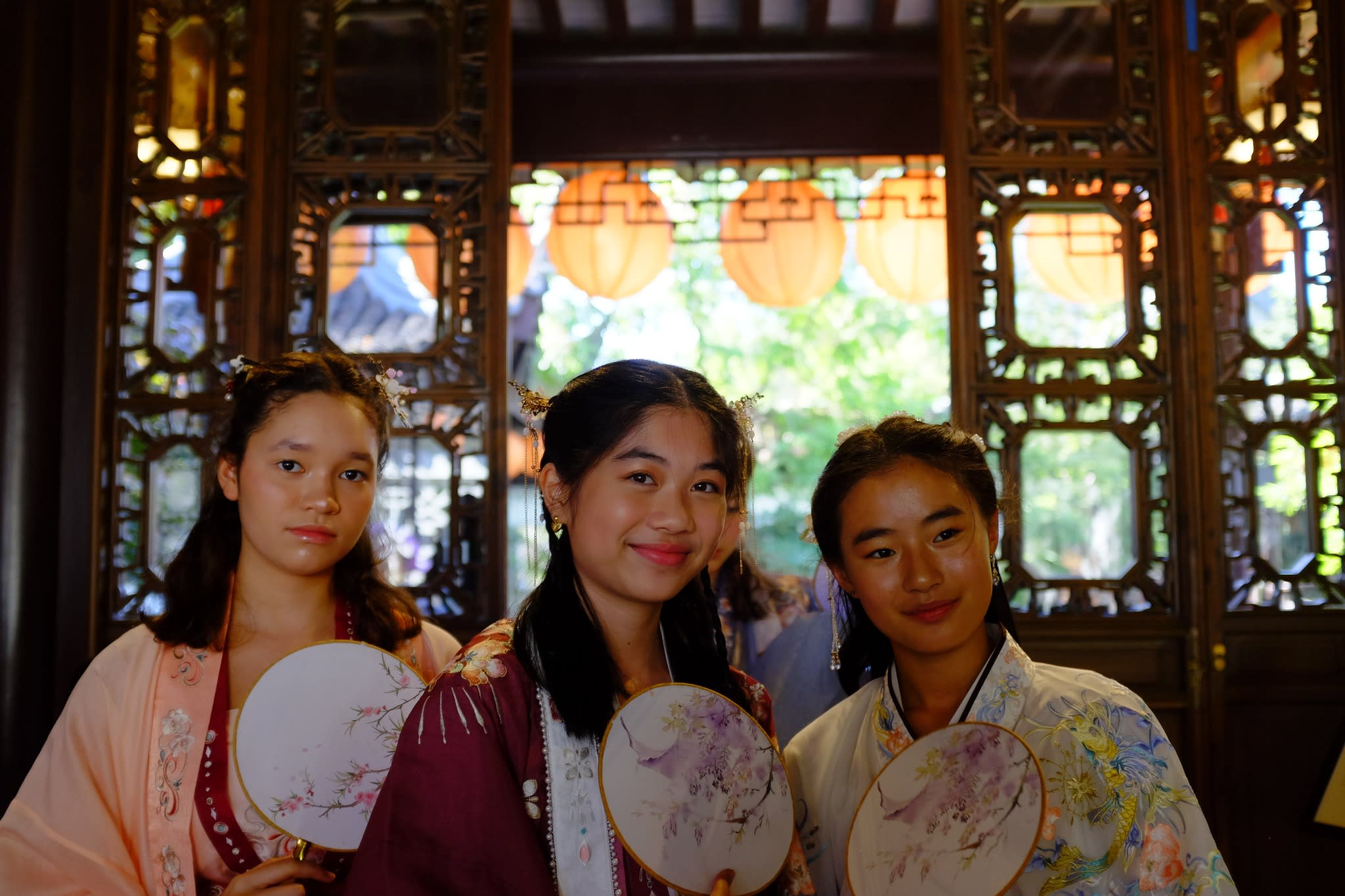 这是我们一直期待的,由身着汉服的女孩子们们展示中国传统服饰之美的WOW时刻。周日下午,青少年舞蹈队的四名高中生来到了兰苏园,尽情享受传统园林带给她们的意境。同时,她们的出现,也让花园穿越时空,似乎回到一千年前的朝代。