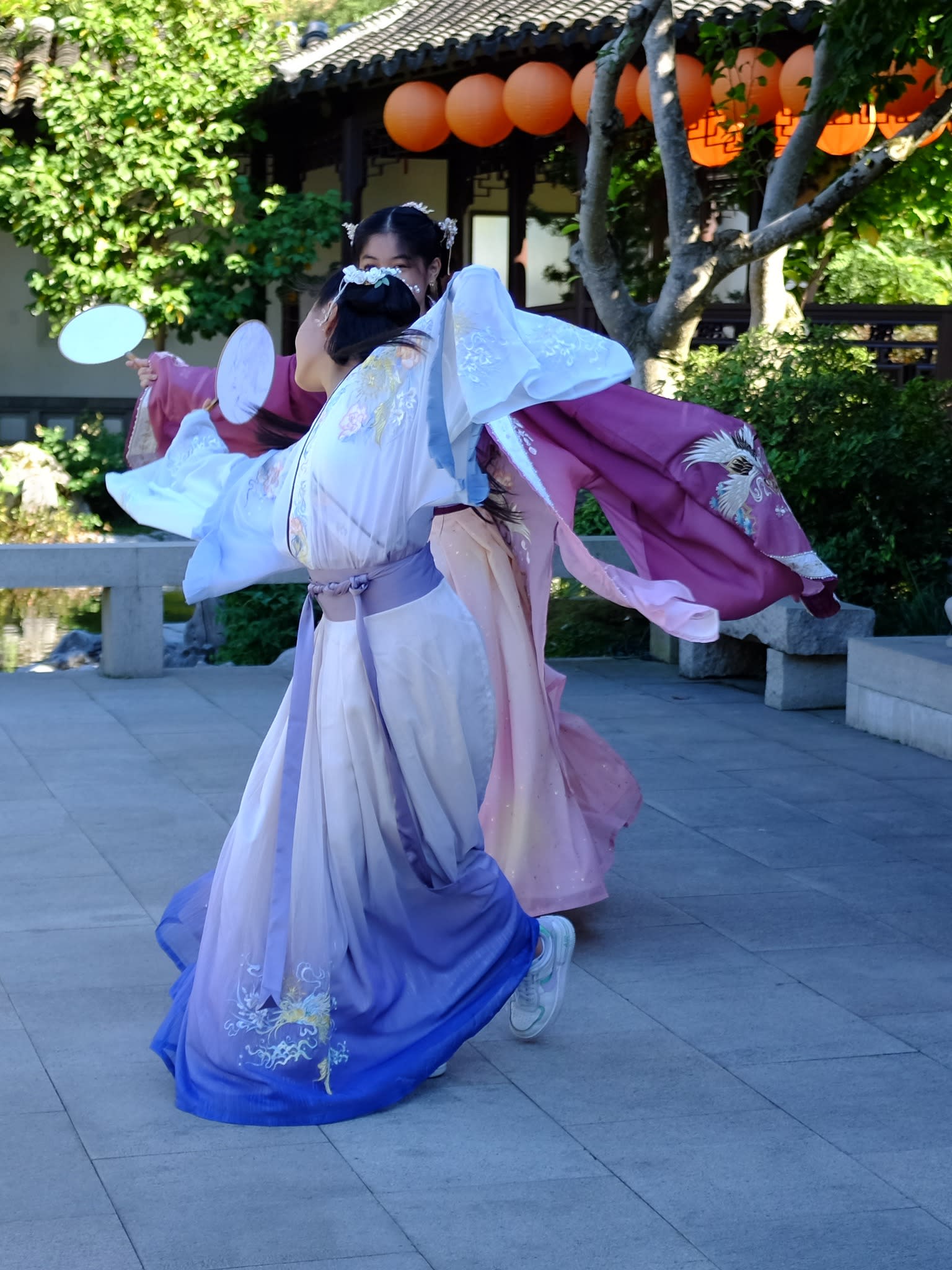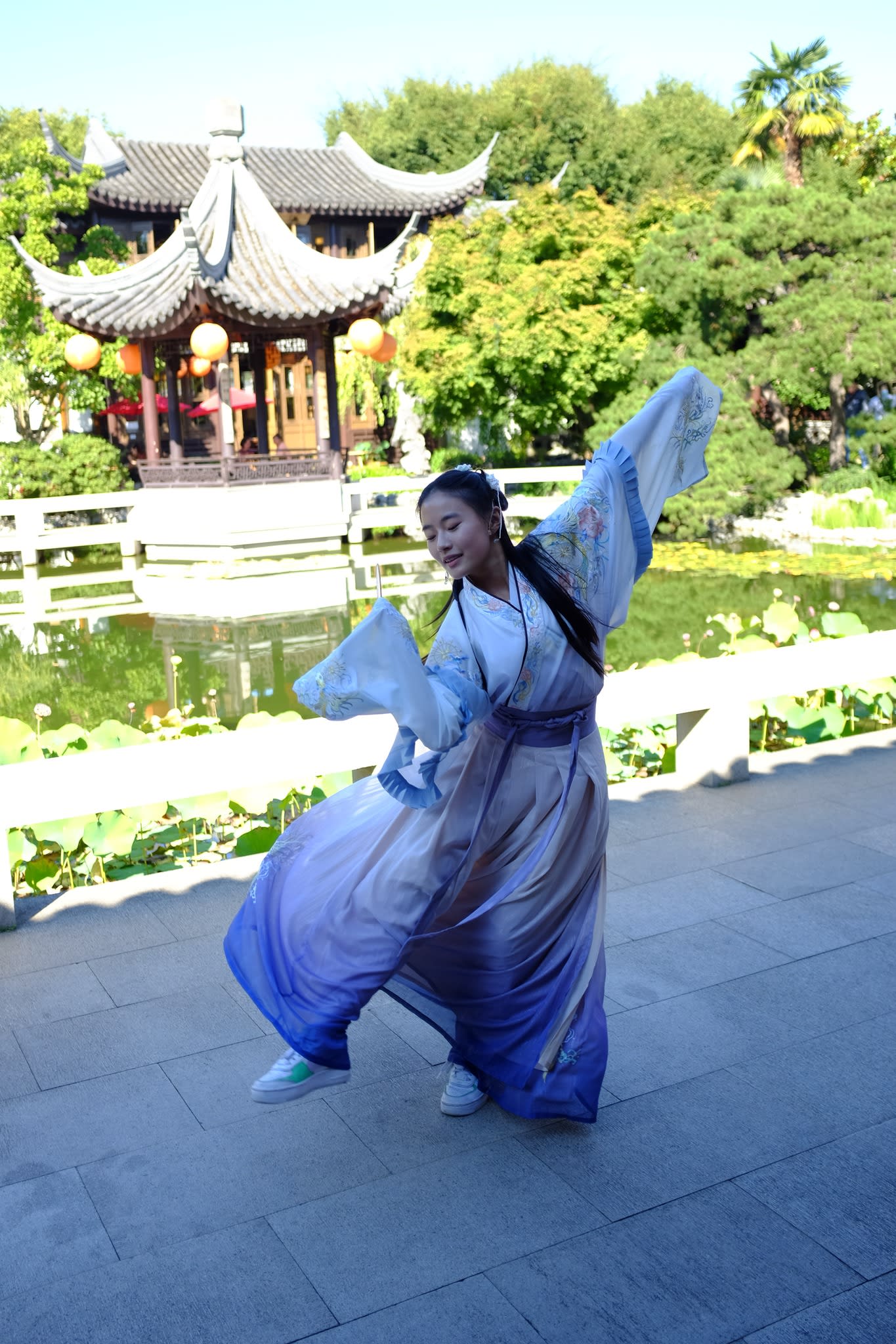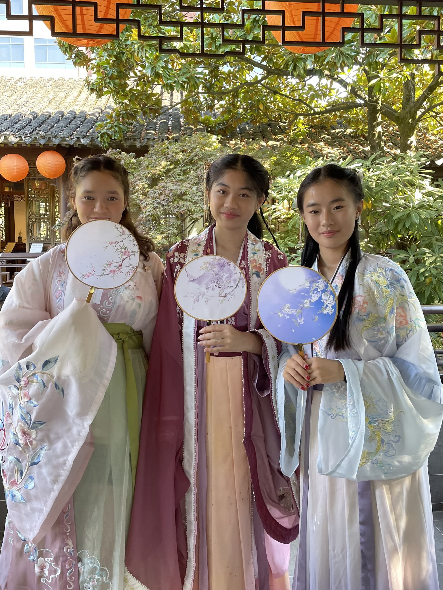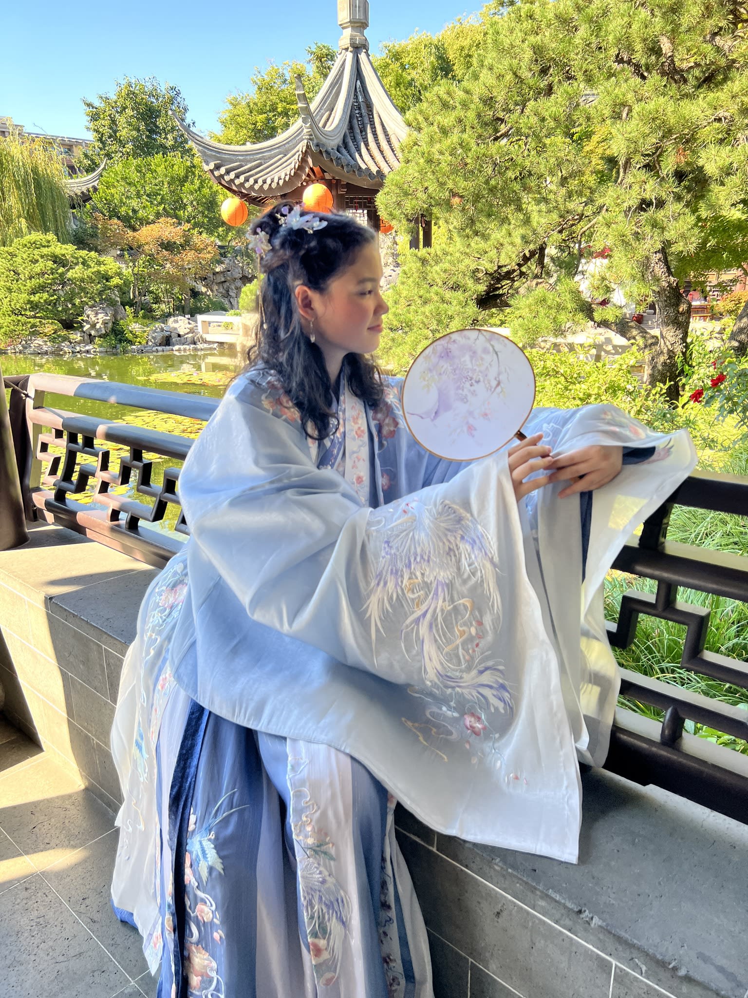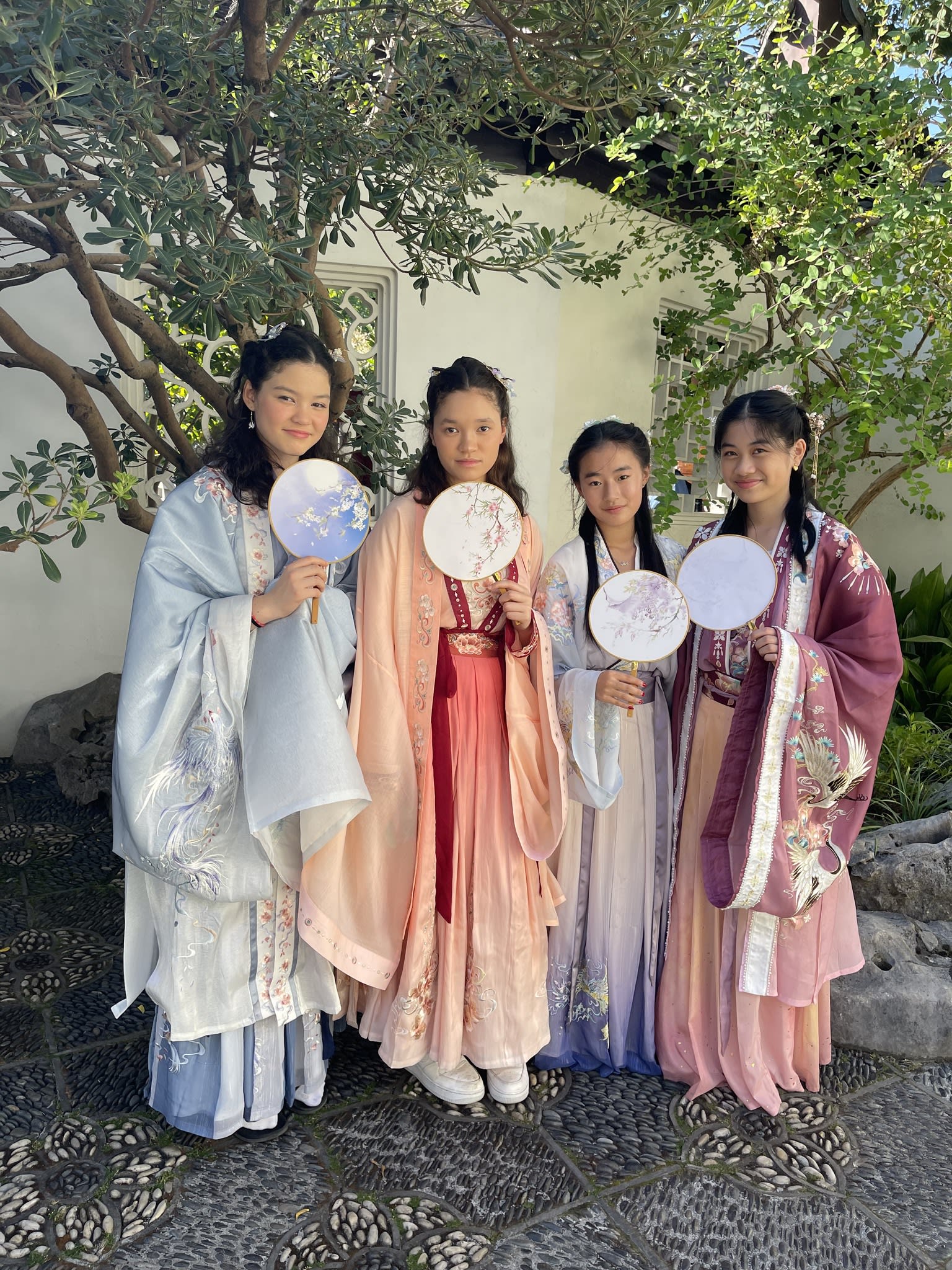 这是我们一直期待的,由身着汉服的女孩子们们展示中国传统服饰之美的WOW时刻。周日下午,青少年舞蹈队的四名高中生来到了兰苏园,尽情享受传统园林带给她们的意境。同时,她们的出现,也让花园穿越时空,似乎回到一千年前的朝代。