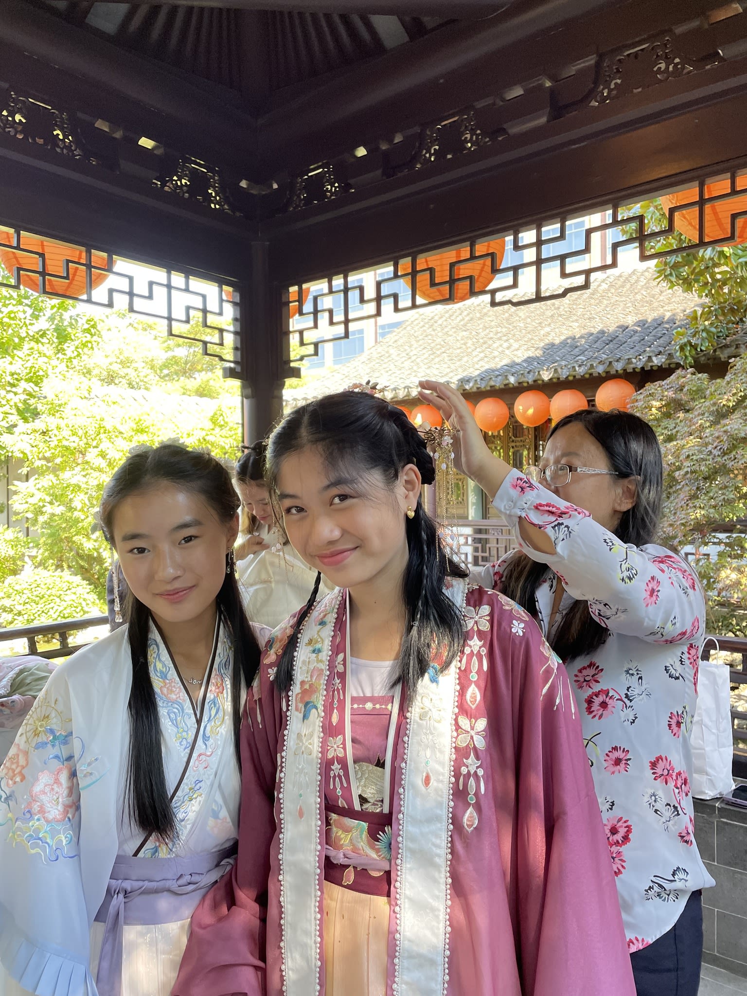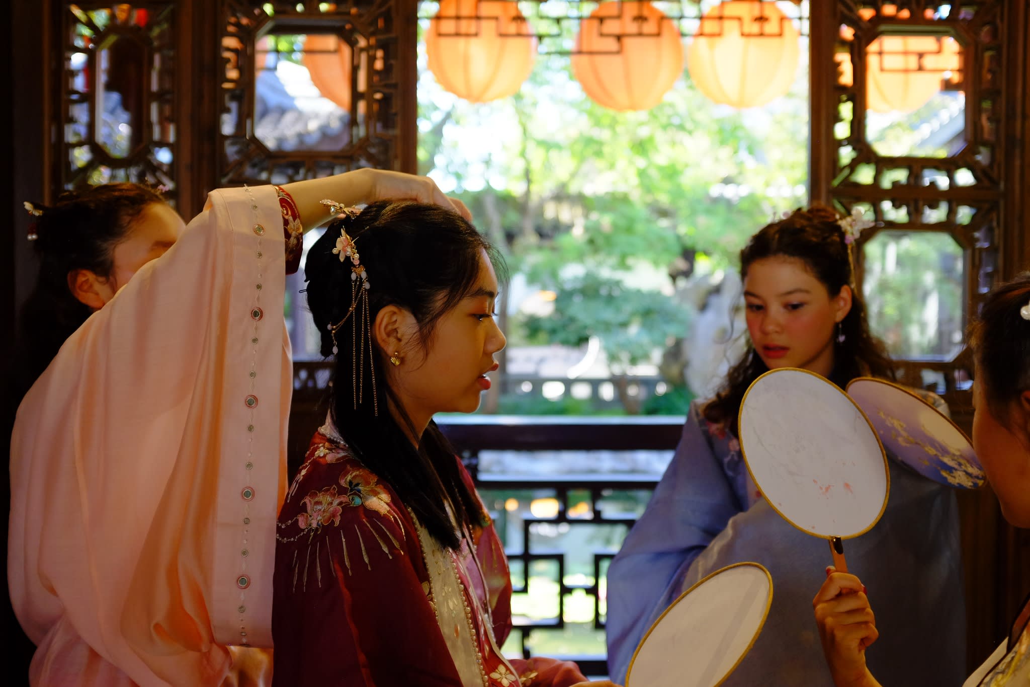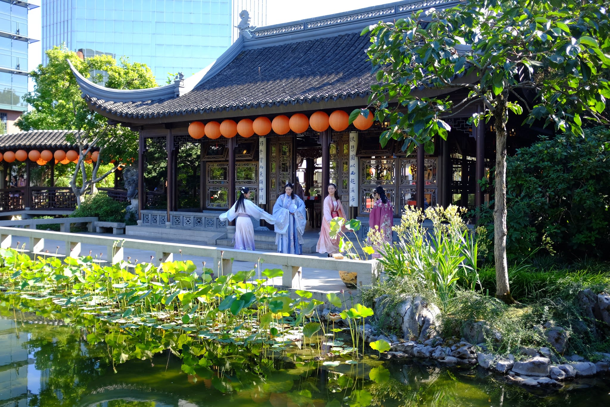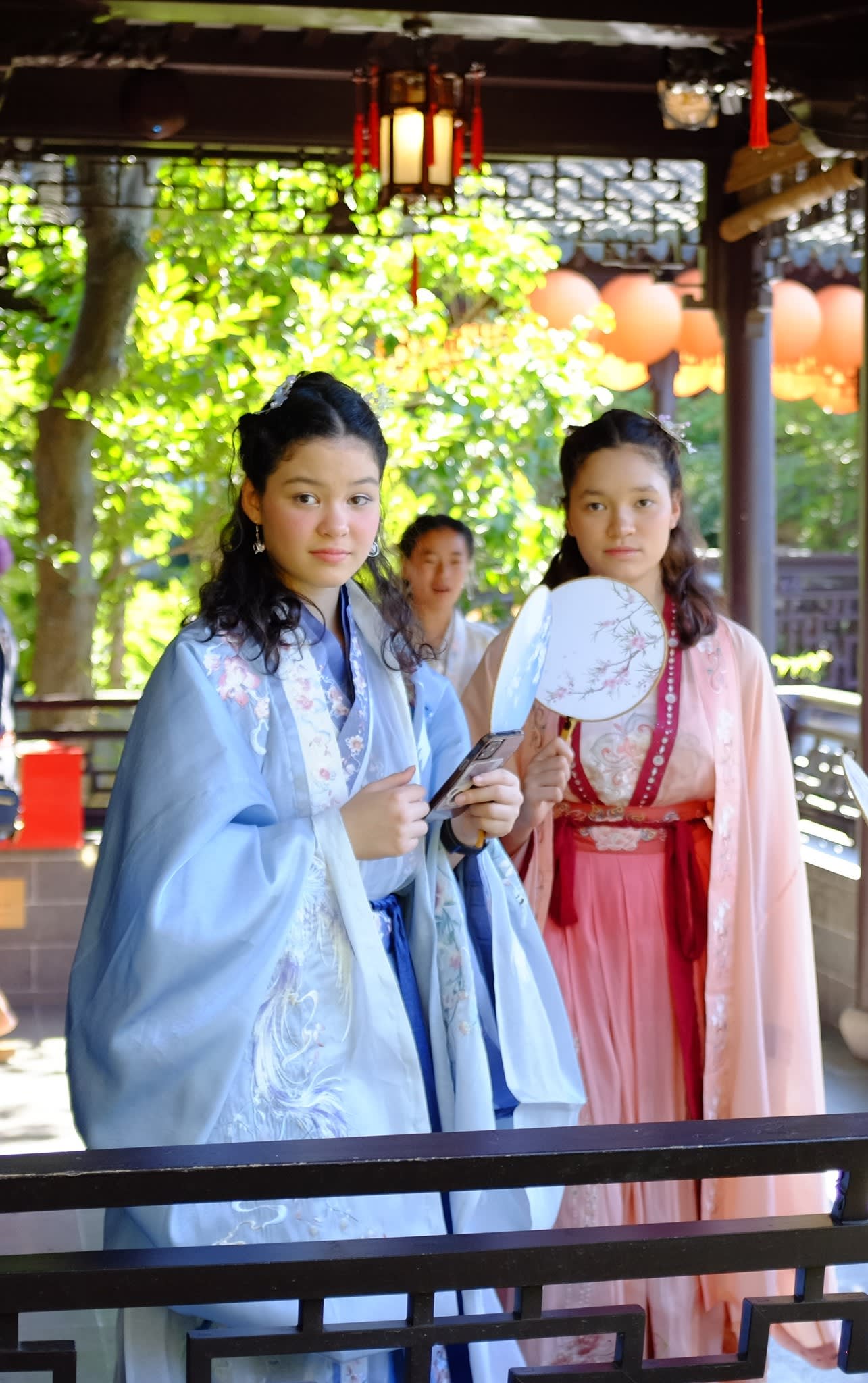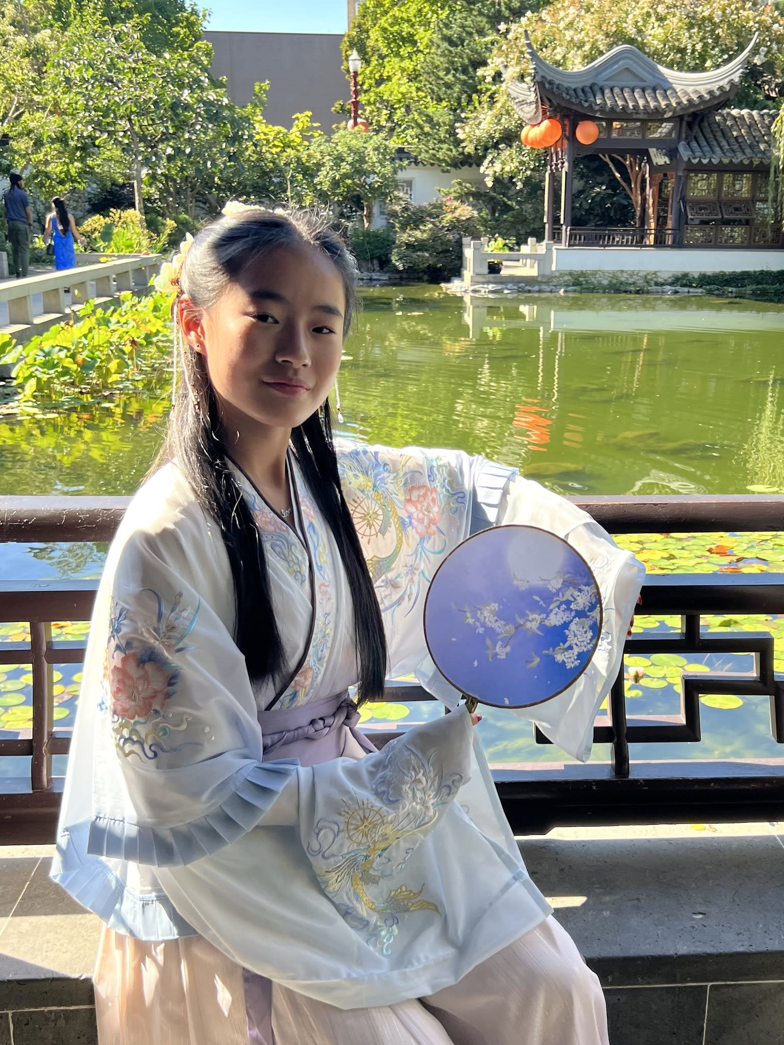 这是我们一直期待的,由身着汉服的女孩子们们展示中国传统服饰之美的WOW时刻。周日下午,青少年舞蹈队的四名高中生来到了兰苏园,尽情享受传统园林带给她们的意境。同时,她们的出现,也让花园穿越时空,似乎回到一千年前的朝代。