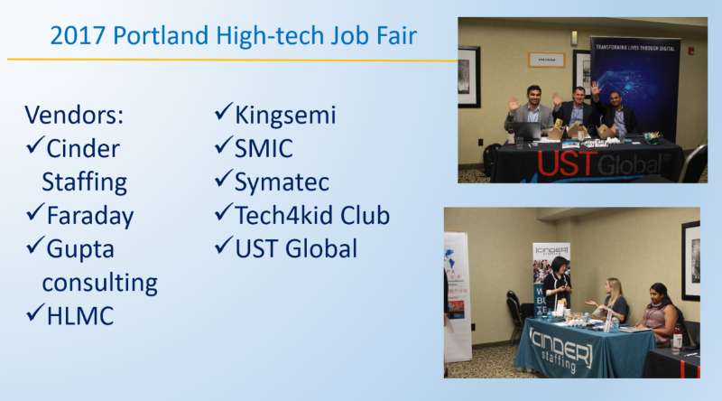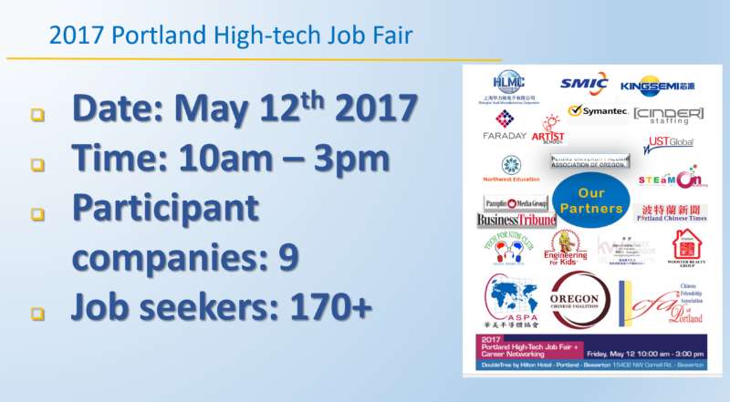 “前不久石珏找到我,说是华美半导体协会(CASPA)有意将本年度的招聘会(job fair)的一个会场放在波特兰。如此一个好机会,怎么可以错过!我们作为社区定将全力支持CASPA波特兰作为主办方的这次招聘会。与此同时,我们也达成了一个共识,那就是此次招聘会将不仅限于半导体行业,而是要囊括各个科技领域,范围取决于我们能招来多少招聘公司。