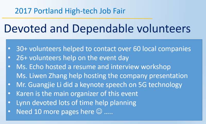 我们的想法是此次招聘会将对全州华人开放,不仅仅是在职的,也包括在OSU,UO,PSU。。。的在校应届毕业生们。我们初步的估算是吸引30家公司,300应聘华人。为社区招聘会定下调子。