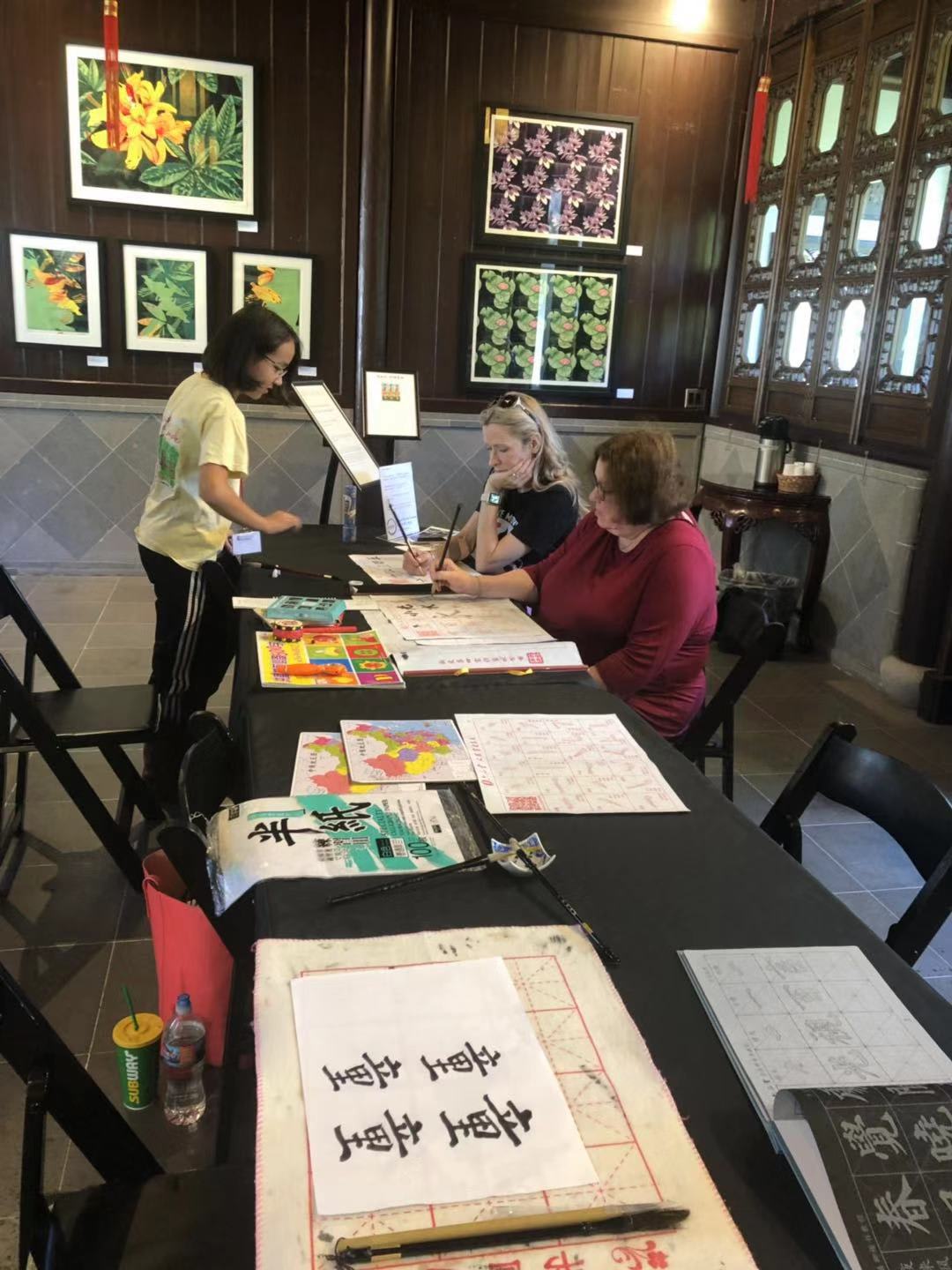 As we began to adjust to the busy flow, a Romanian family with three children showed up. All three were very interested in calligraphy, but the youngest one intrigued me the most. Even after his older siblings stopped to continue on around the garden, he continued to practice calligraphy while our moms talked. After briefly tuning in, I heard that the family was from Michigan, and that all three siblings had learned Chinese at some point. When the kid stood up to leave, he told us that he really enjoyed calligraphy, and his mom jokingly remarked that she would “put him back in Chinese lessons.”