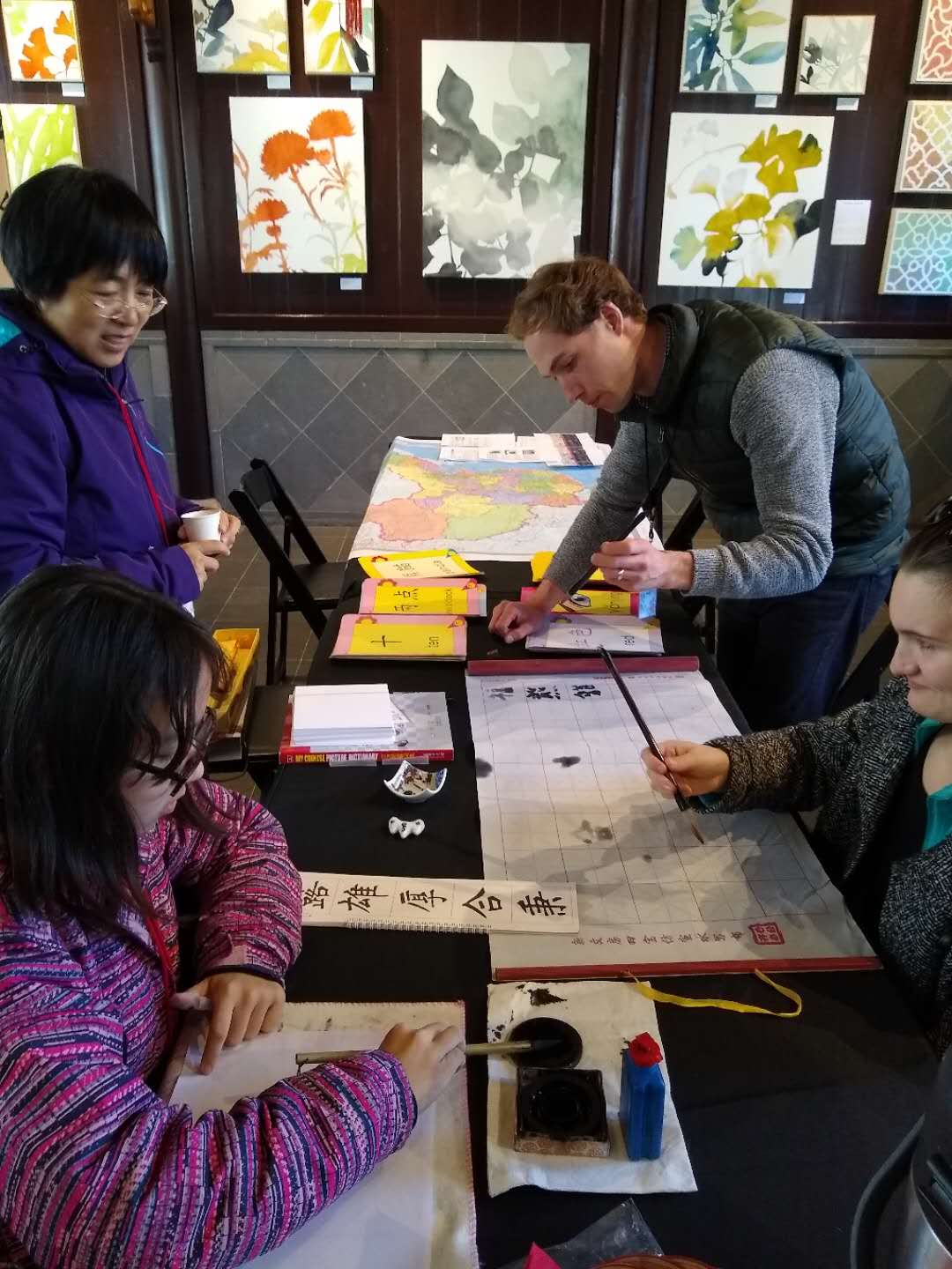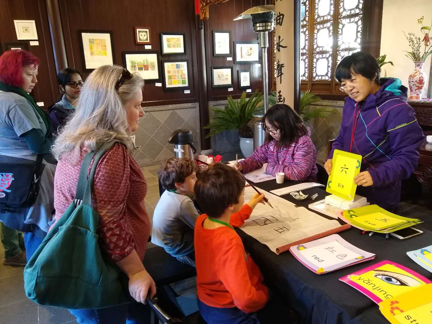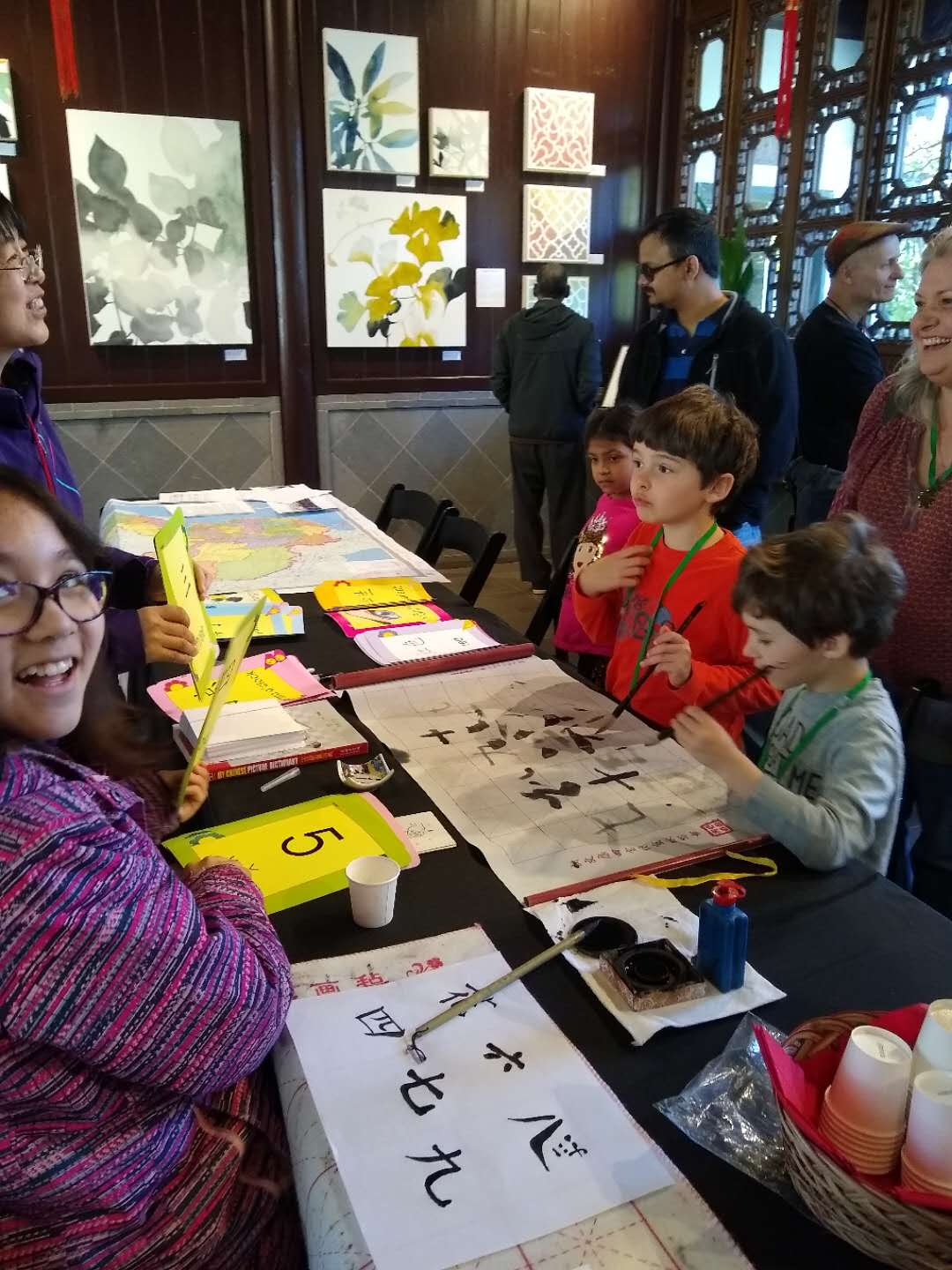 On March 17th of 2019, my mom and I went to go volunteer at the Lan Su Chinese Garden. One of the first things I noticed was that even the Americans seemed extremely interested in Chinese Culture and art. The first group that walked in was a group of three. It was a mother and her two daughters. The mother had lived in Beijing, and the kids were interested in learning about numbers in Chinese and about their own names in Chinese. It was surprising to see them smiling and how they were so excited about learning. I helped to introduce them to the basics about writing the numbers in Chinese and Chinese calligraphy. Along with this, a family of three from Taiwan came to look at the Chinese garden. The girl, who was in her third and final year of high school, was very kind to me and drew me a few small pictures. I was able to show several people my Chinese calligraphy and I heard many positive comments about my skill.
