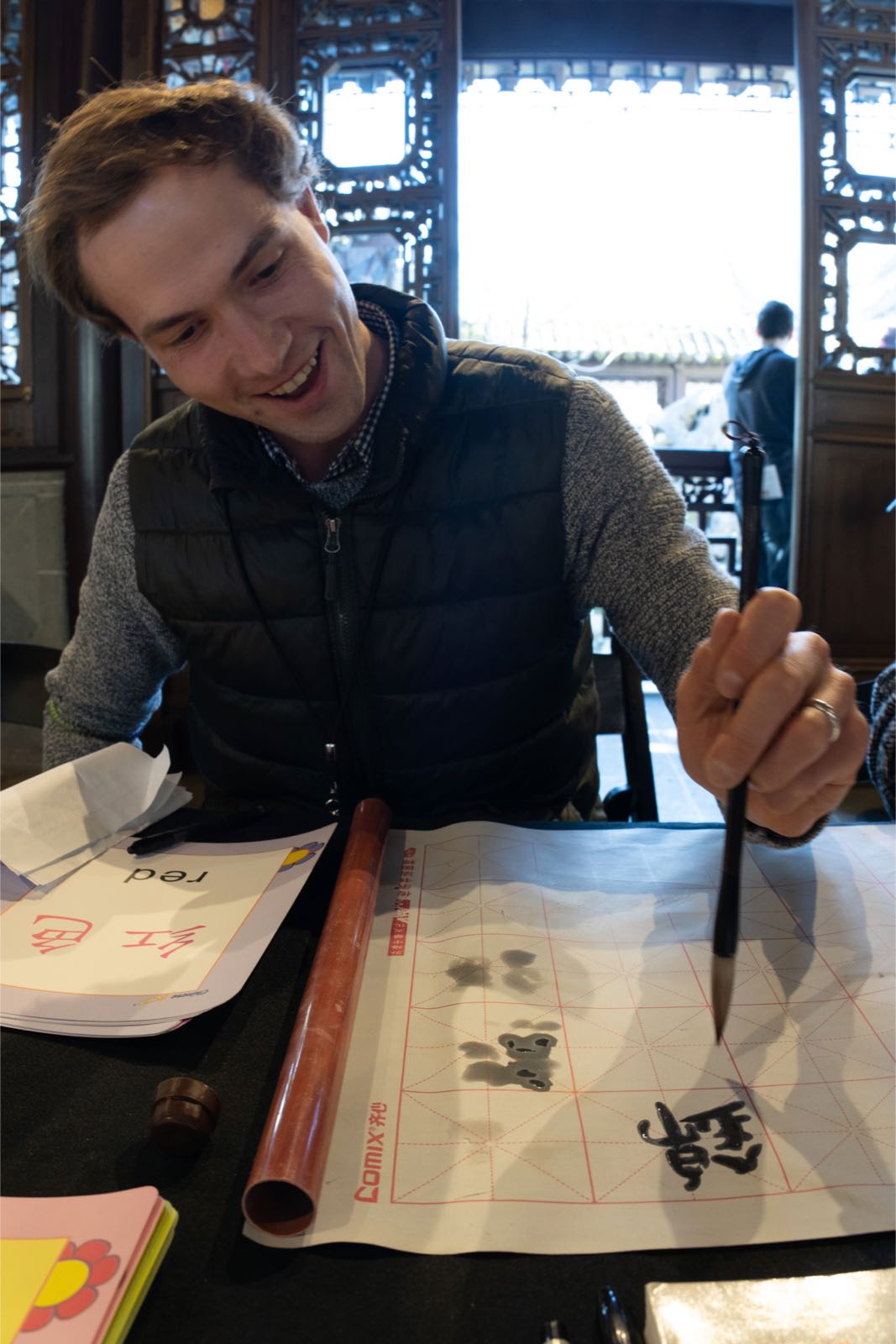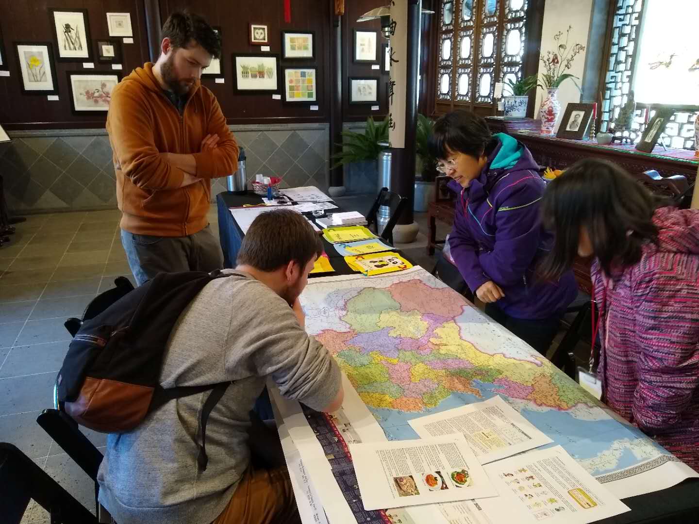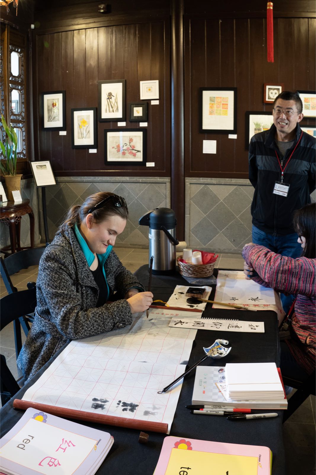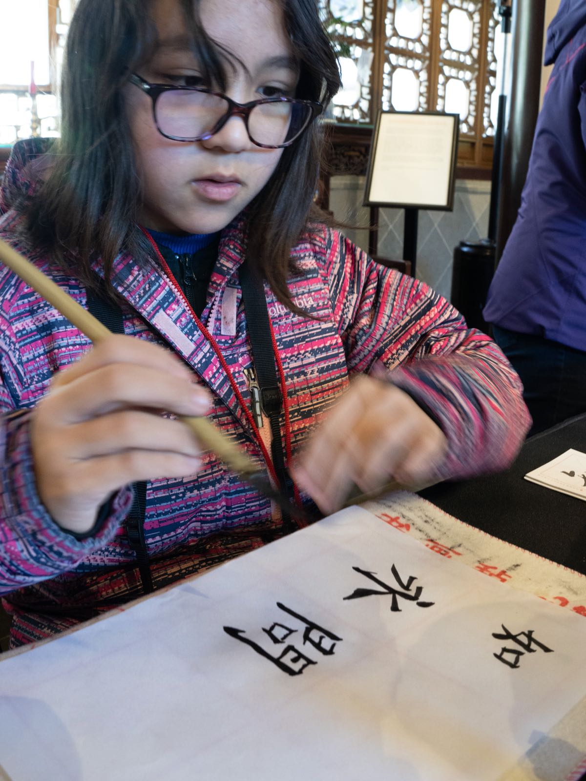 On March 17th of 2019, my mom and I went to go volunteer at the Lan Su Chinese Garden. One of the first things I noticed was that even the Americans seemed extremely interested in Chinese Culture and art. The first group that walked in was a group of three. It was a mother and her two daughters. The mother had lived in Beijing, and the kids were interested in learning about numbers in Chinese and about their own names in Chinese. It was surprising to see them smiling and how they were so excited about learning. I helped to introduce them to the basics about writing the numbers in Chinese and Chinese calligraphy. Along with this, a family of three from Taiwan came to look at the Chinese garden. The girl, who was in her third and final year of high school, was very kind to me and drew me a few small pictures. I was able to show several people my Chinese calligraphy and I heard many positive comments about my skill.