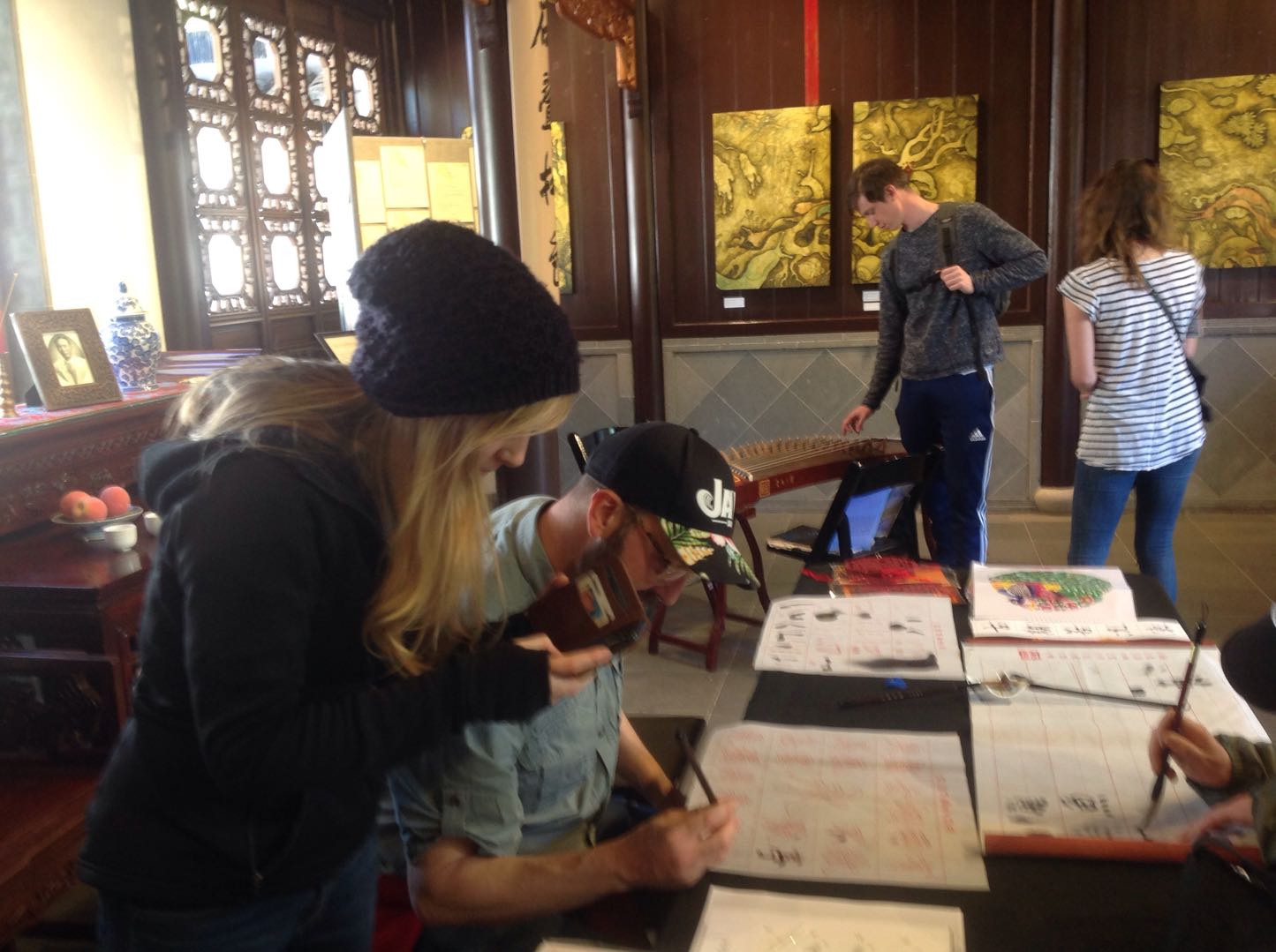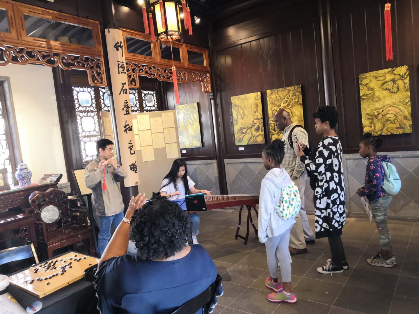 游客朋友对中国民乐独有的音色很感兴趣,Nancy在介绍古筝和简谱。