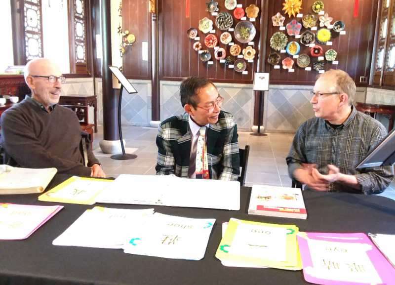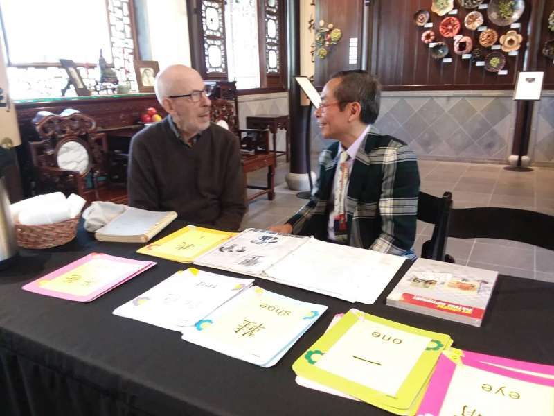 照片中一位老先生年轻时在耶鲁大学学习过中文。他是兰苏园的会员,听到有这个汉语角,很兴奋。特意过来参加。他说很久不用中文,很多都忘了。今天和骆老师聊得就像是相识多年的老朋友。