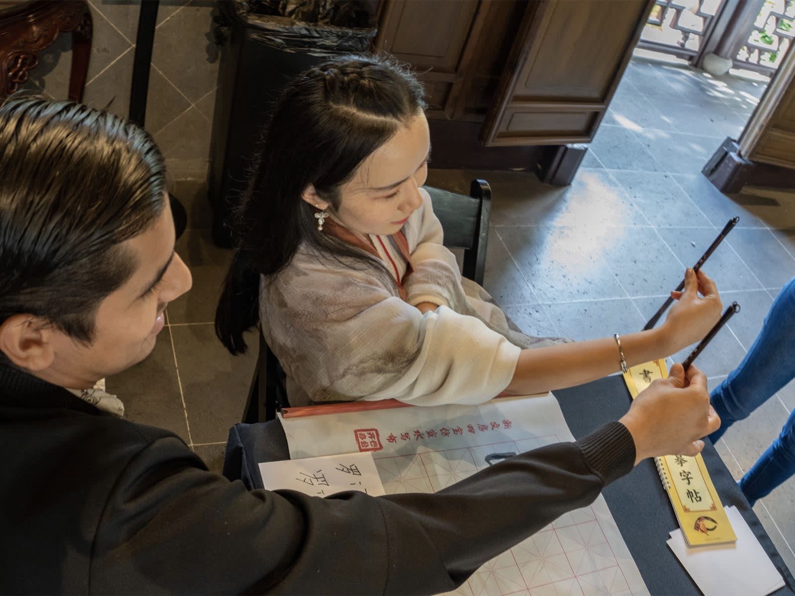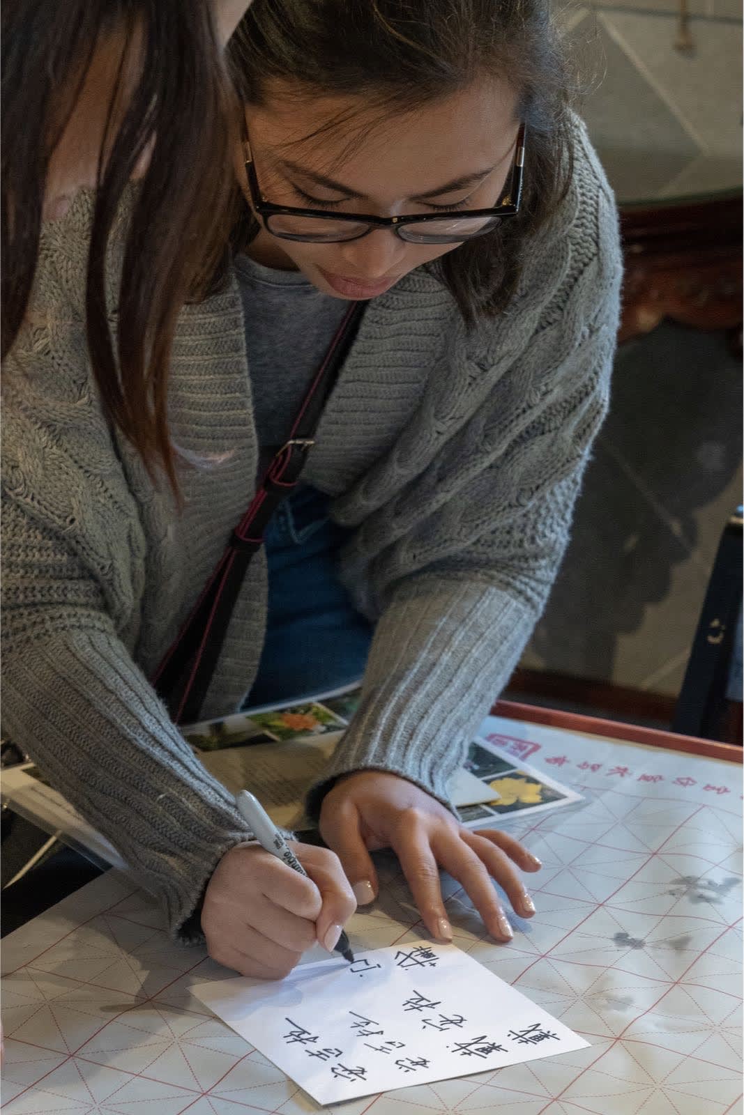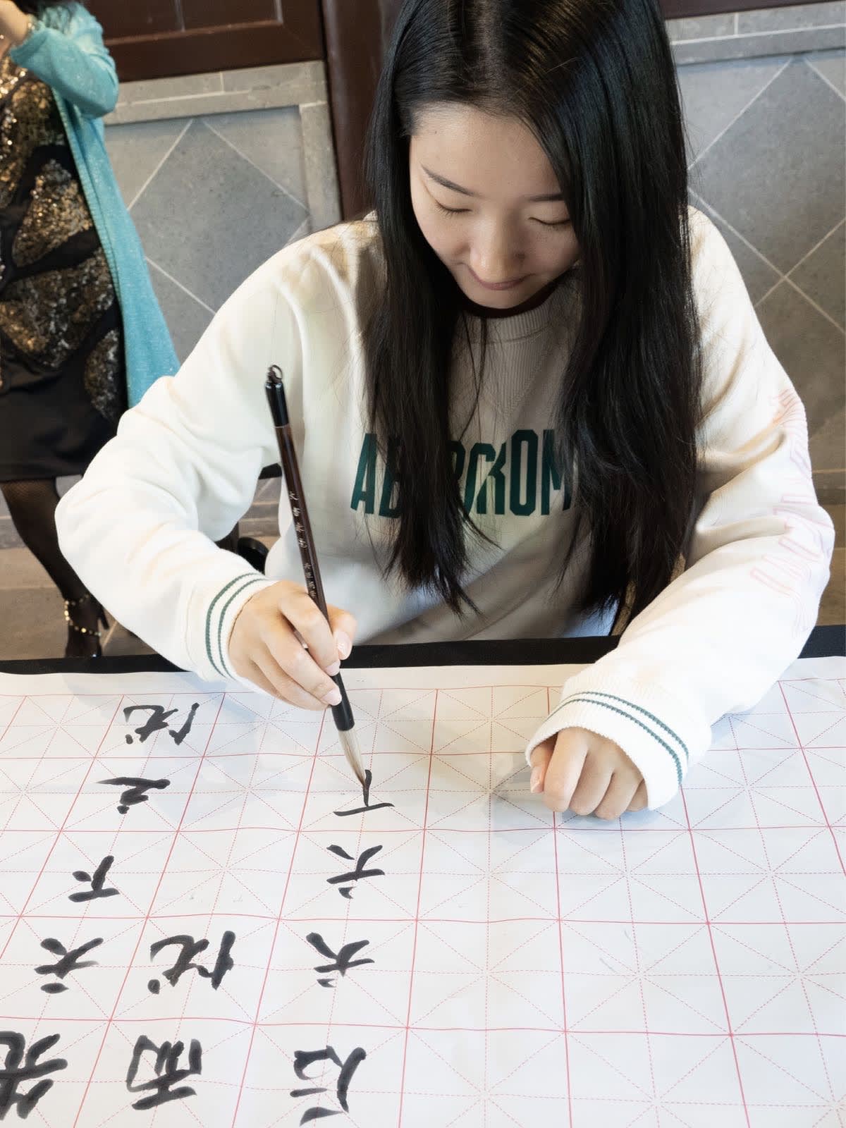 在期间发生了一件让我感触很深的事情,有位老美向我讨教如何写中国书法. 我便耐心的从如何拿笔一步一步的教,直到我示范了三四次 并且手把手的教老美才勉强的拿对笔,我从他脸上看到不可思议的表情; 表示这么复杂的拿笔方式,还要写好汉字,怎么可能!但是他还是很耐心的一笔一笔的画出了我用他英文名翻译出来的中国汉字. 虽然歪歪扭扭,他很开心。此时的我深感写好中国书法的不易和困难。为了能把中国最精髓的文化展示出来,我自己要学习的东西很多。”