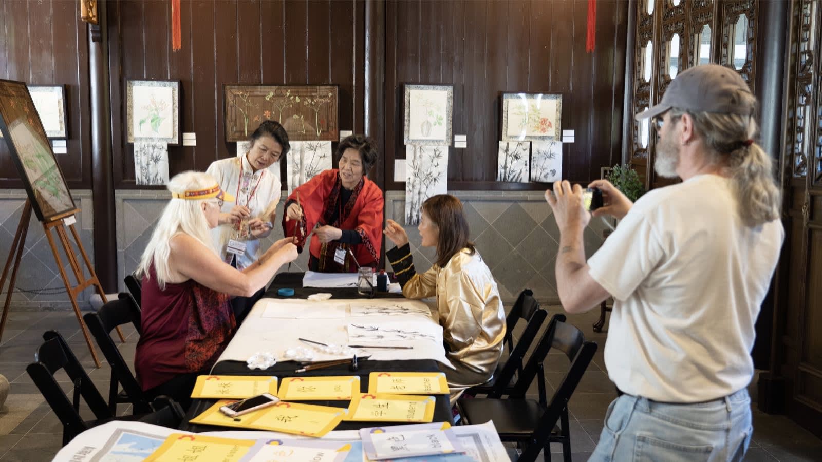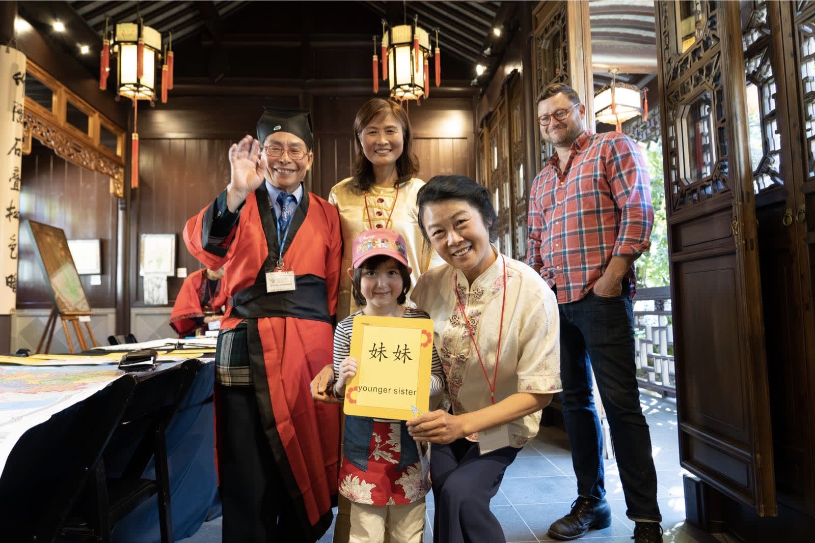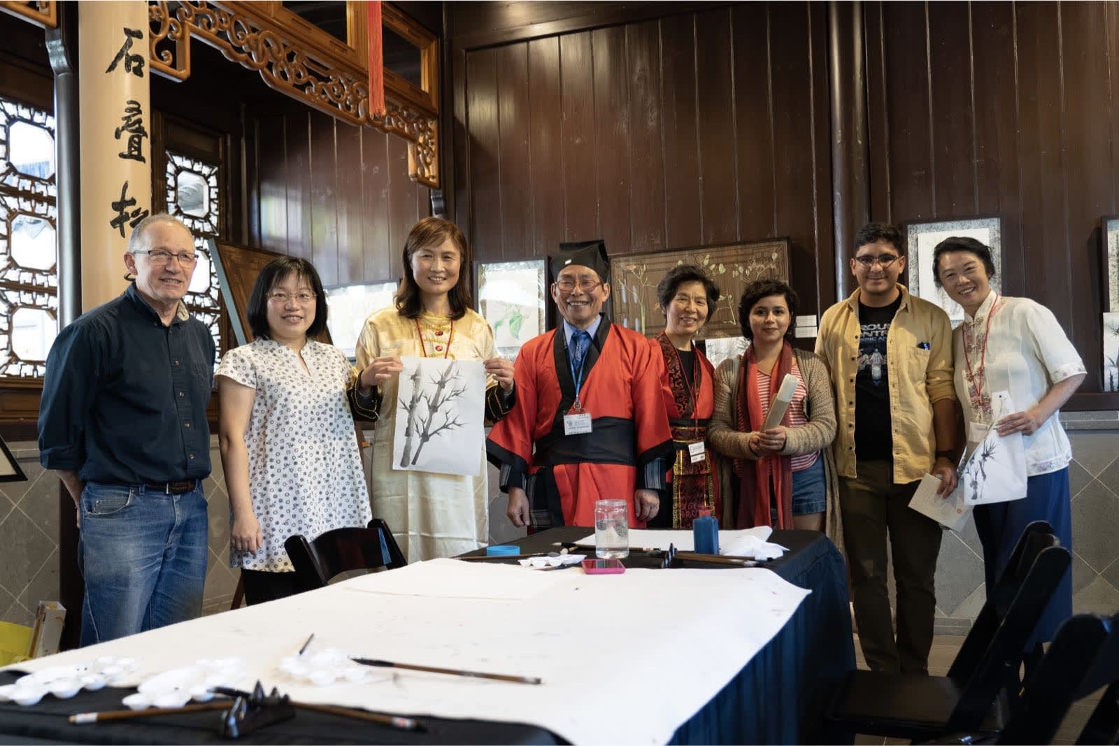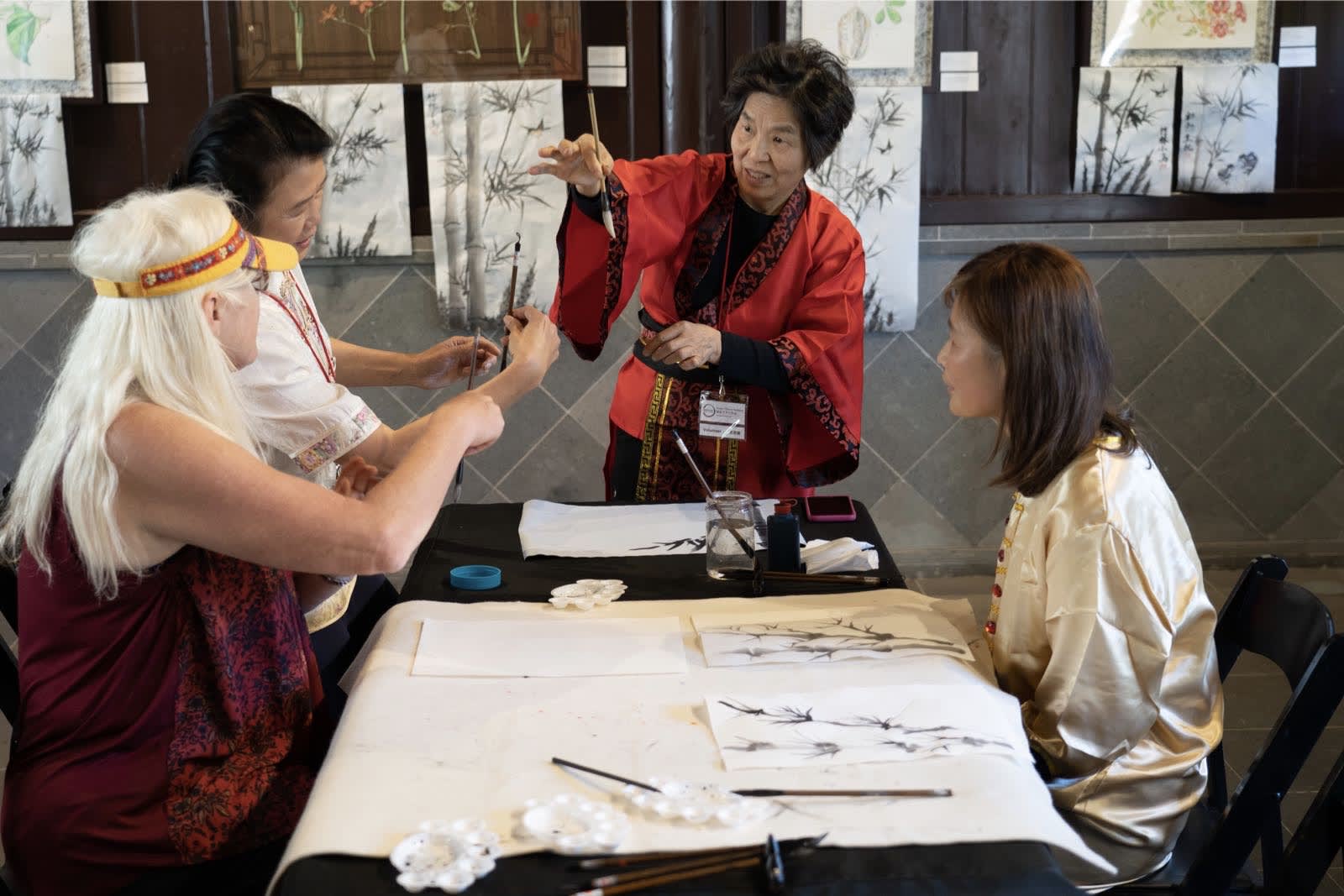 昨天出动了希望中文学校的刘老师和骆老师两位元老,加上来自社区的三位志愿者,阵容可谓强大! 明代书生光超把身着旗袍,唐装,汉服的志愿者们与访客们交流互动的画面一一收入镜头。