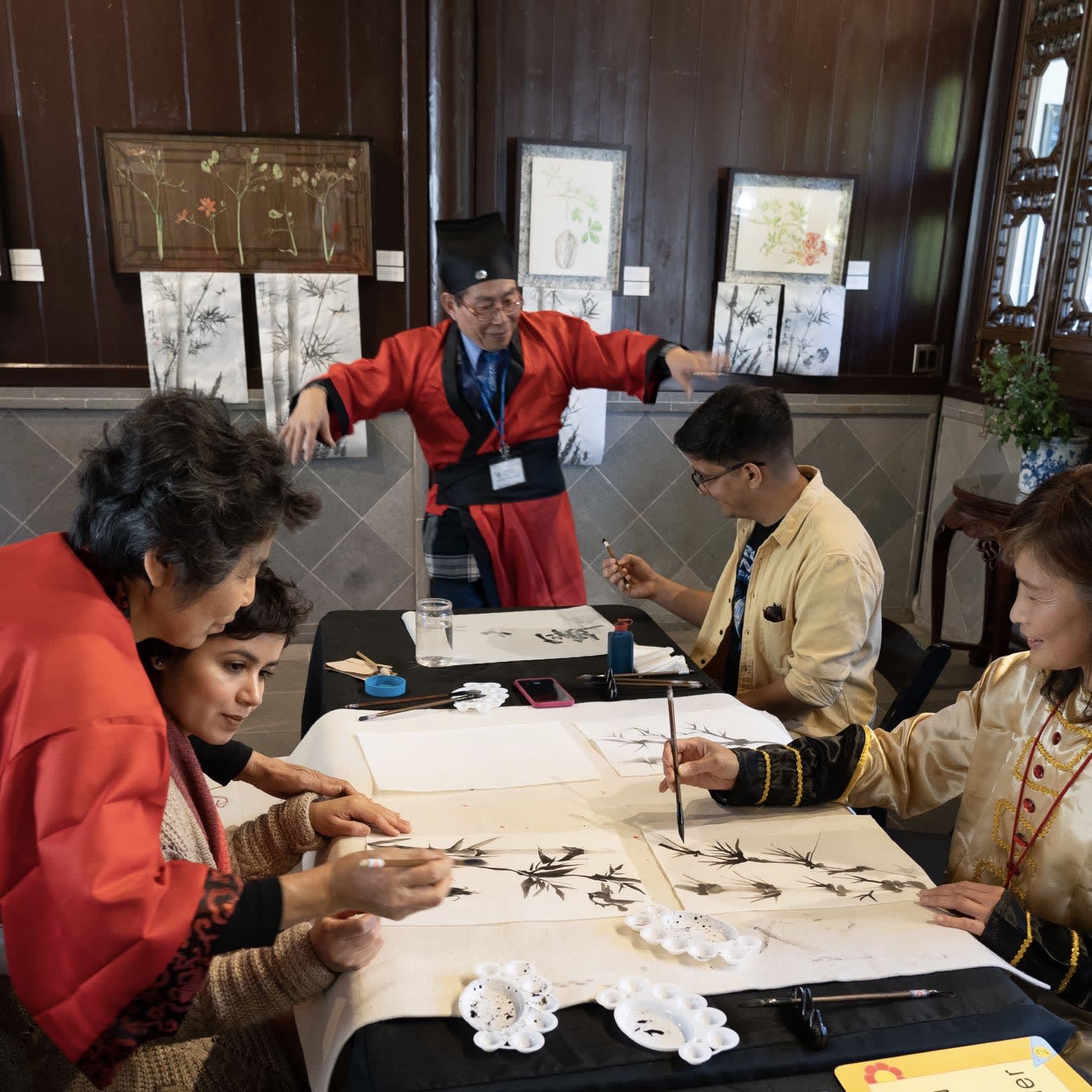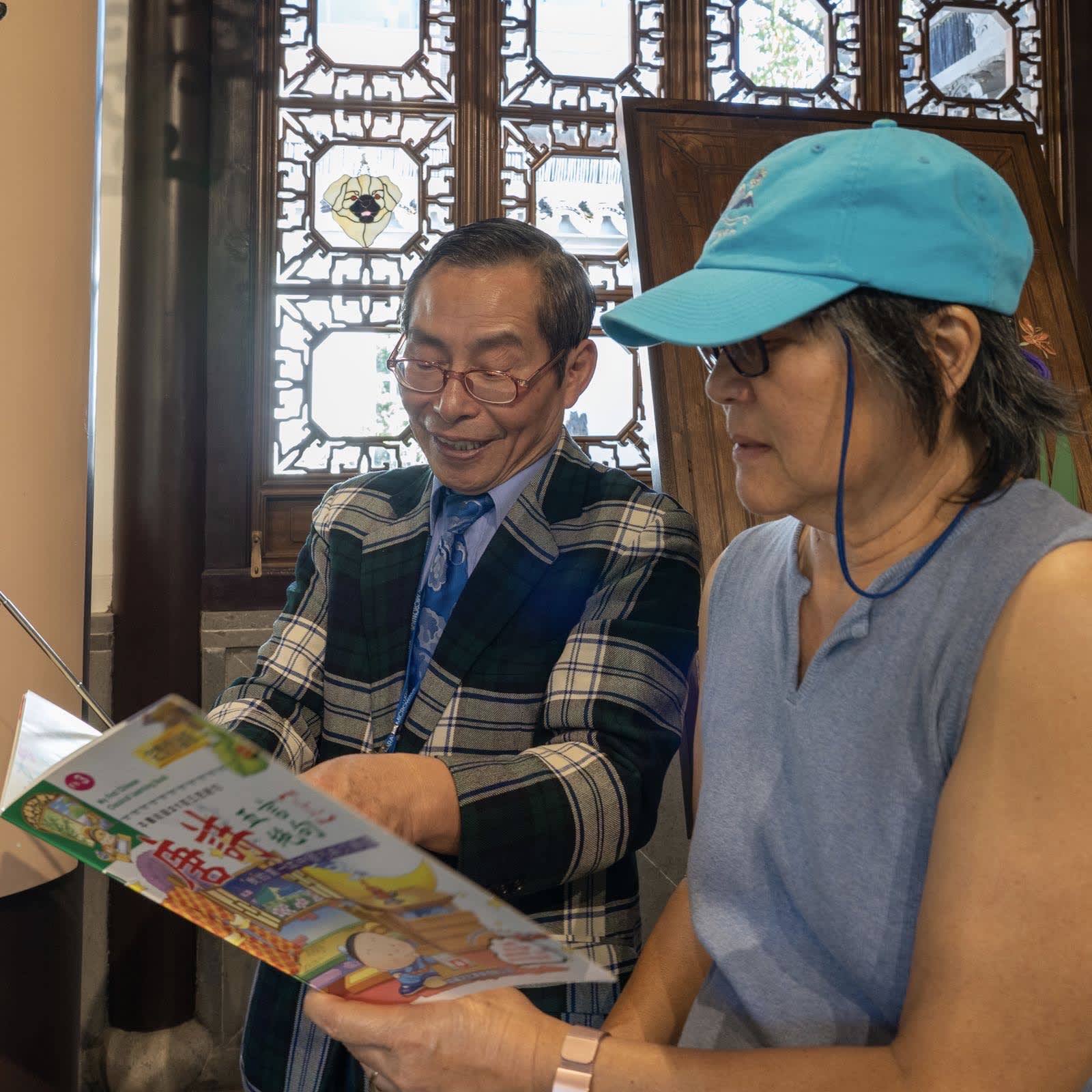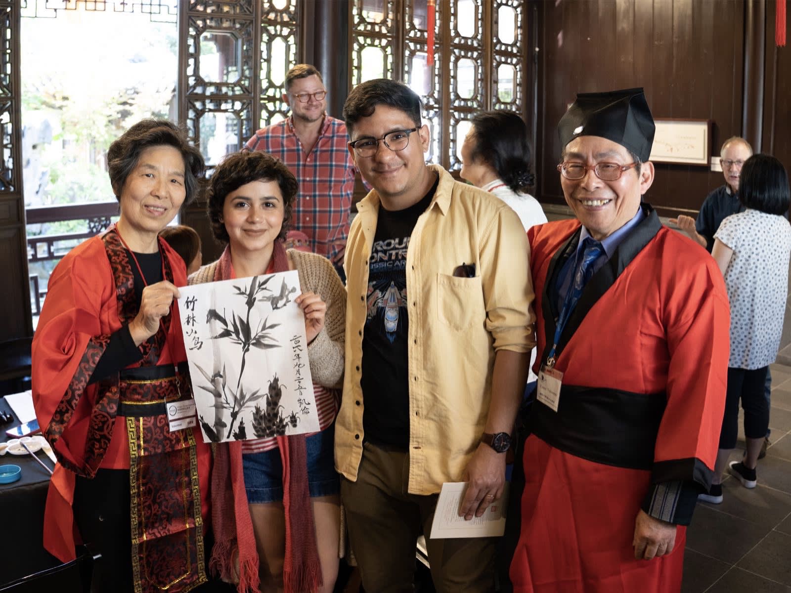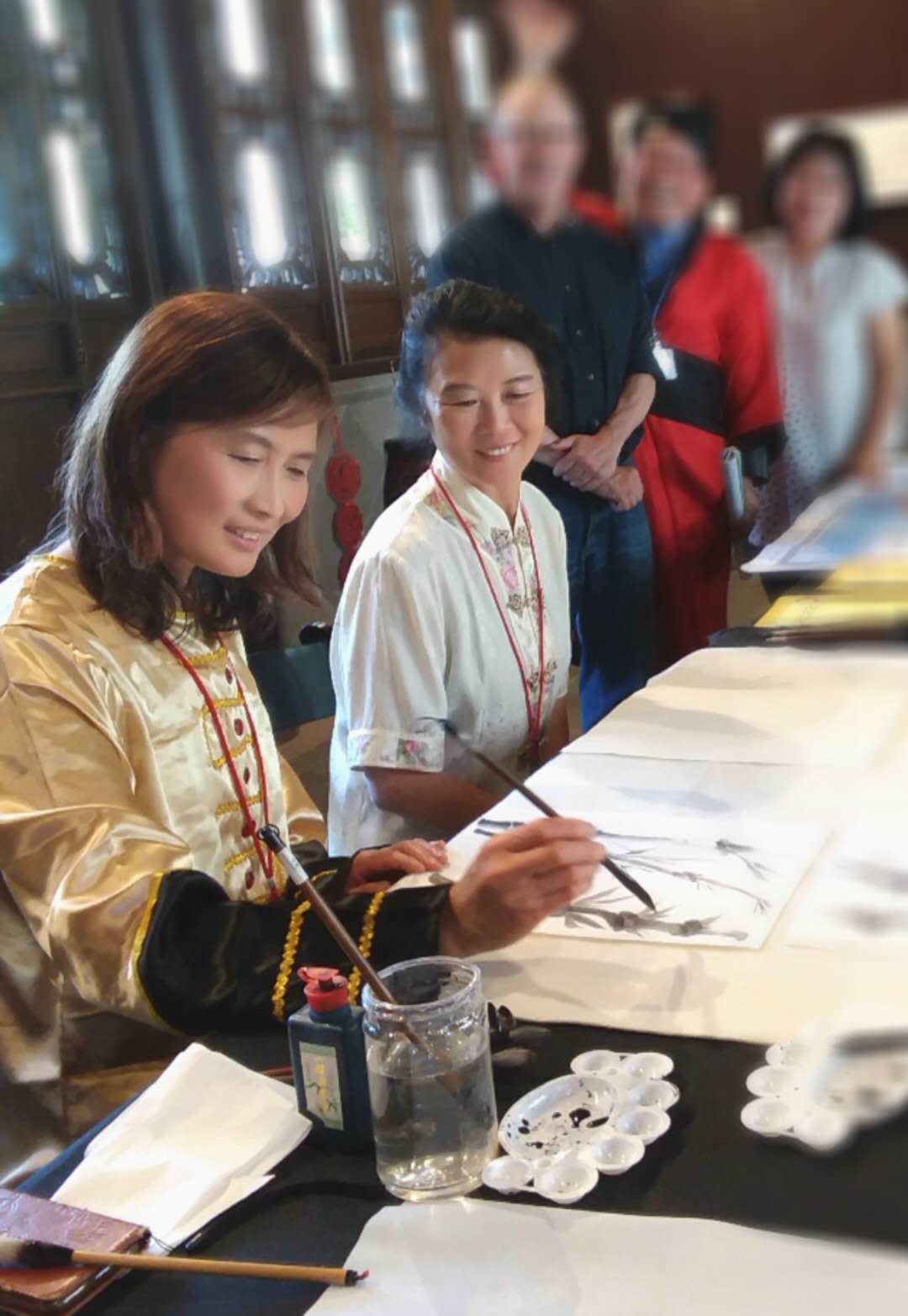 昨天出动了希望中文学校的刘老师和骆老师两位元老,加上来自社区的三位志愿者,阵容可谓强大! 明代书生光超把身着旗袍,唐装,汉服的志愿者们与访客们交流互动的画面一一收入镜头。