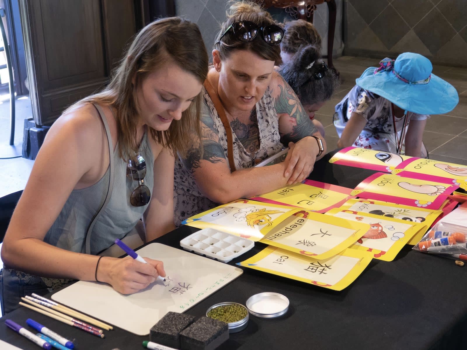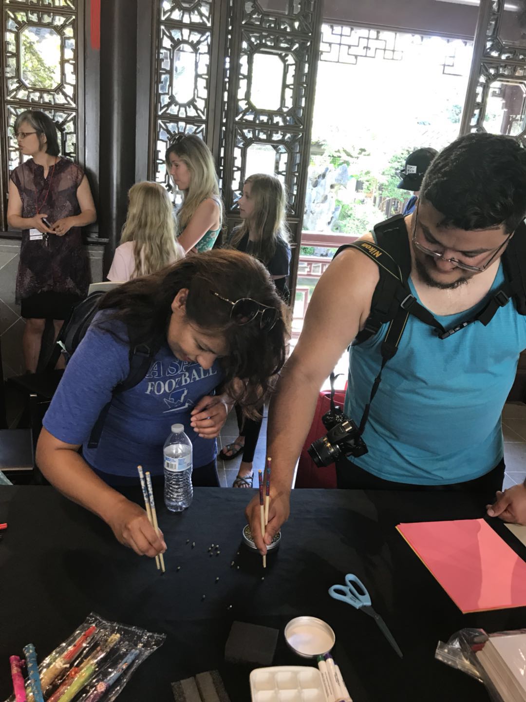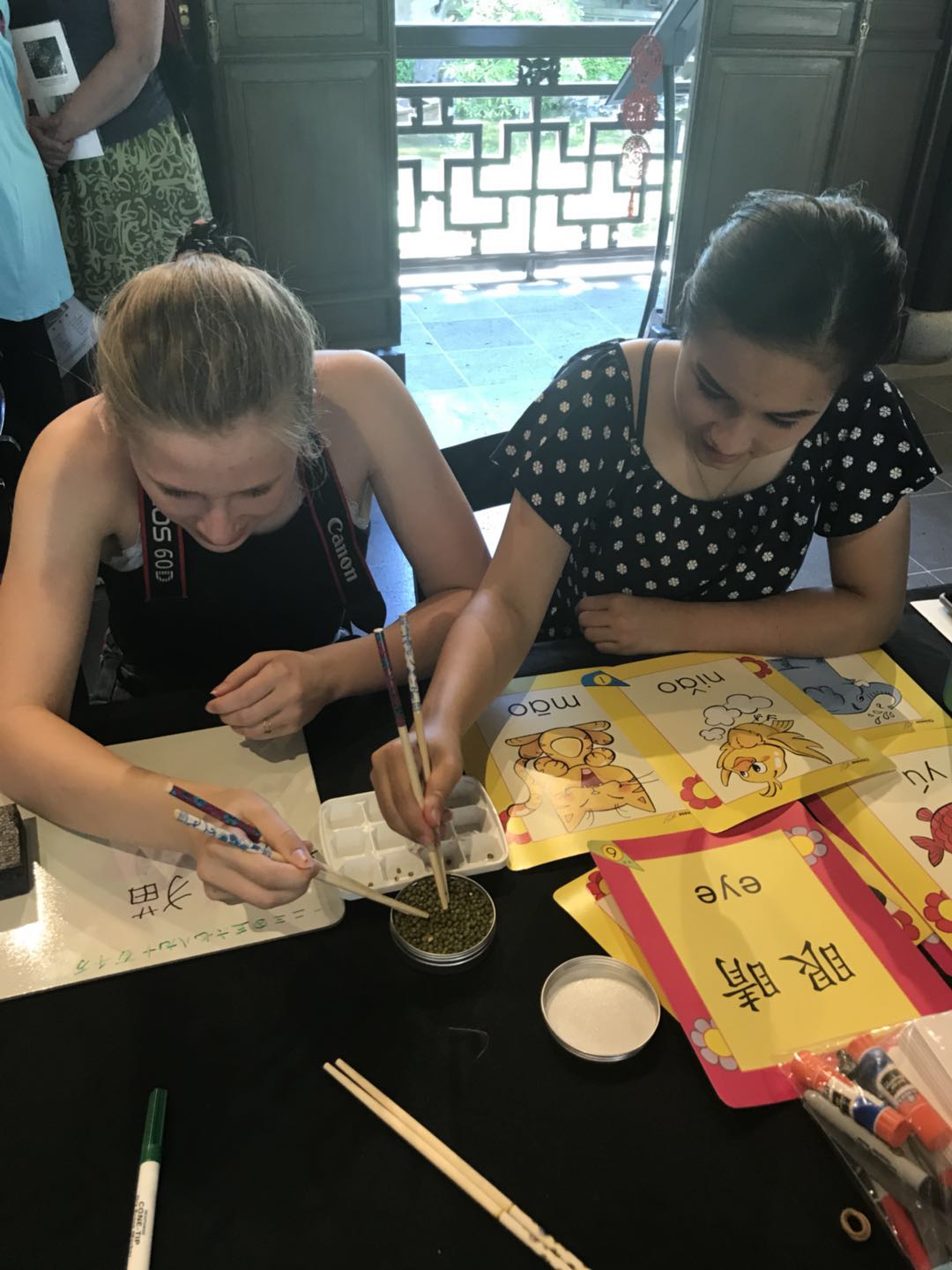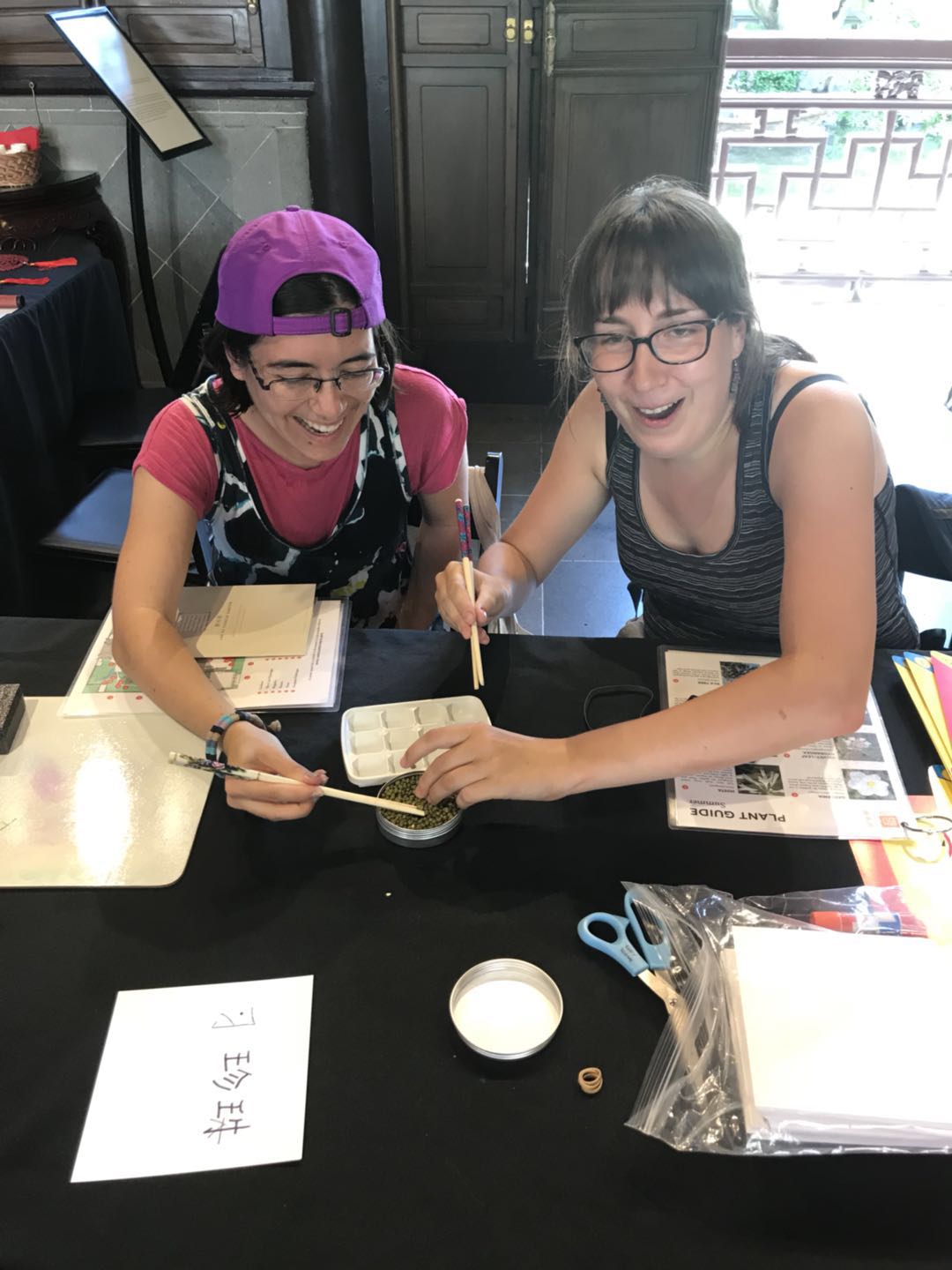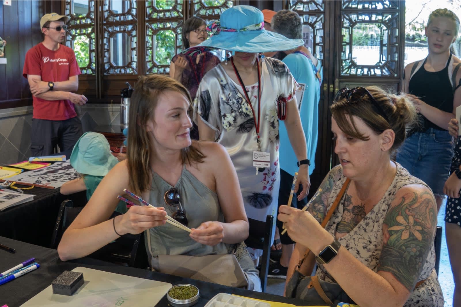 我们的志愿者们每次都会带去一些独特的活动,这次Fion拿了景泰蓝筷子让大家练习用筷子夹绿豆,人人都跃跃欲试,说心里话,这个技术活即便对我们华人来说都会有不小的难度,但是现场大家,尤其是结伴逛园子的朋友或情侣,一边挑战着这古老的习俗,一边尽情享受着不同文化带来的快乐。事后志愿者群群友们纷纷称赞这个点子,都同意今后这项活动和水画笔应该成为保留节目。