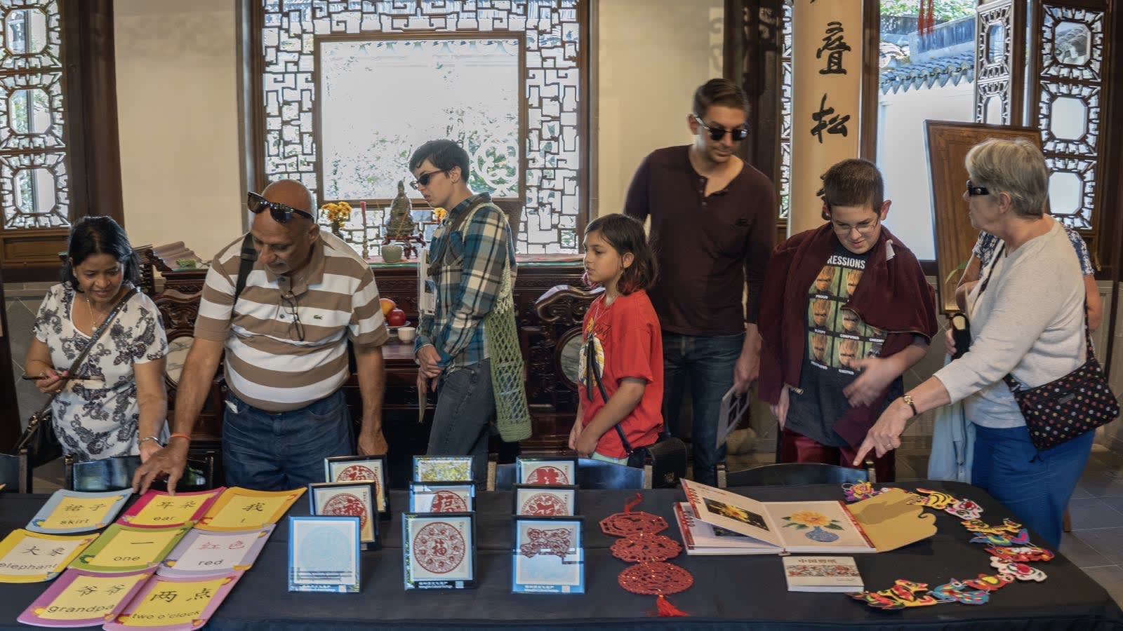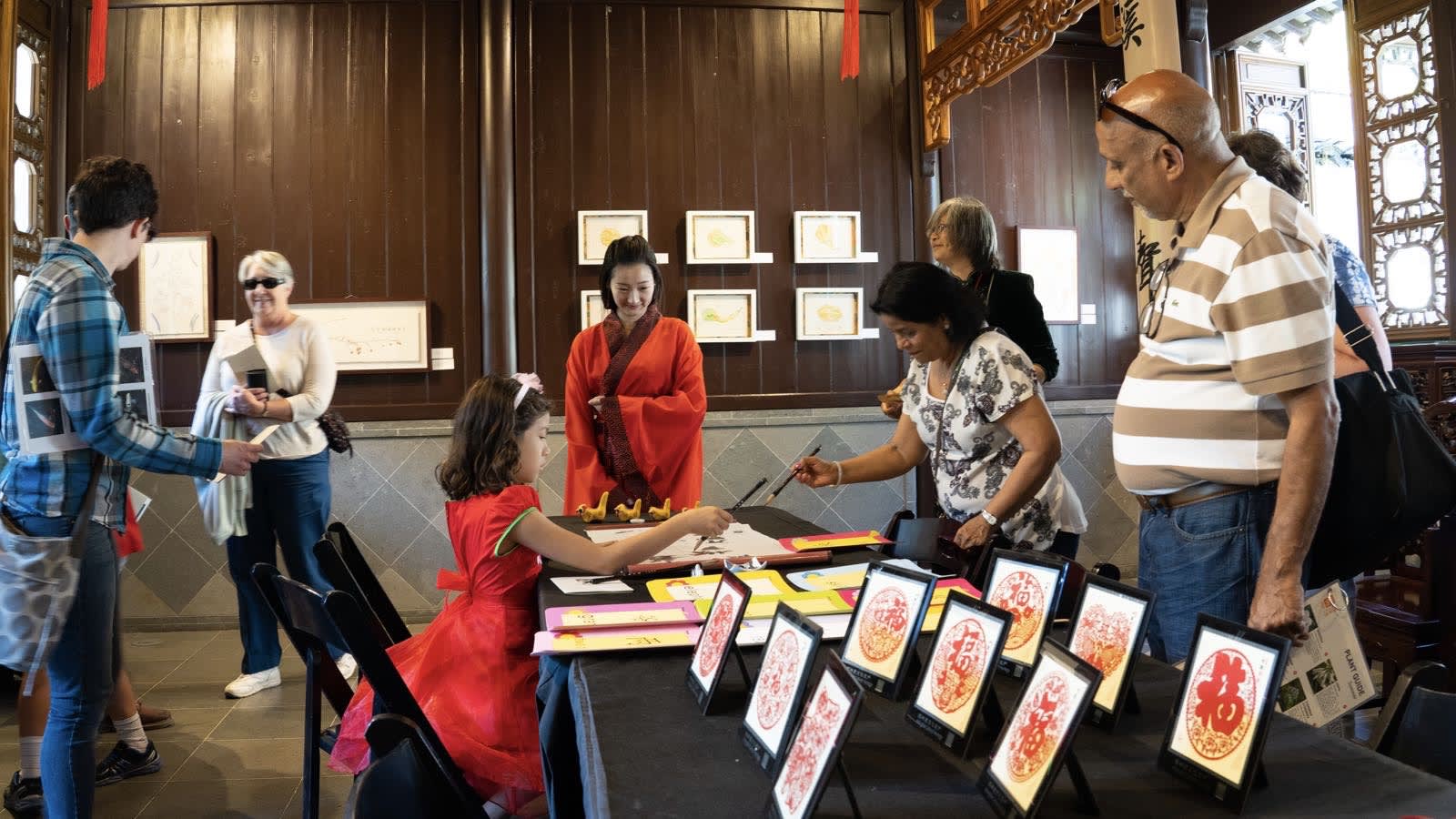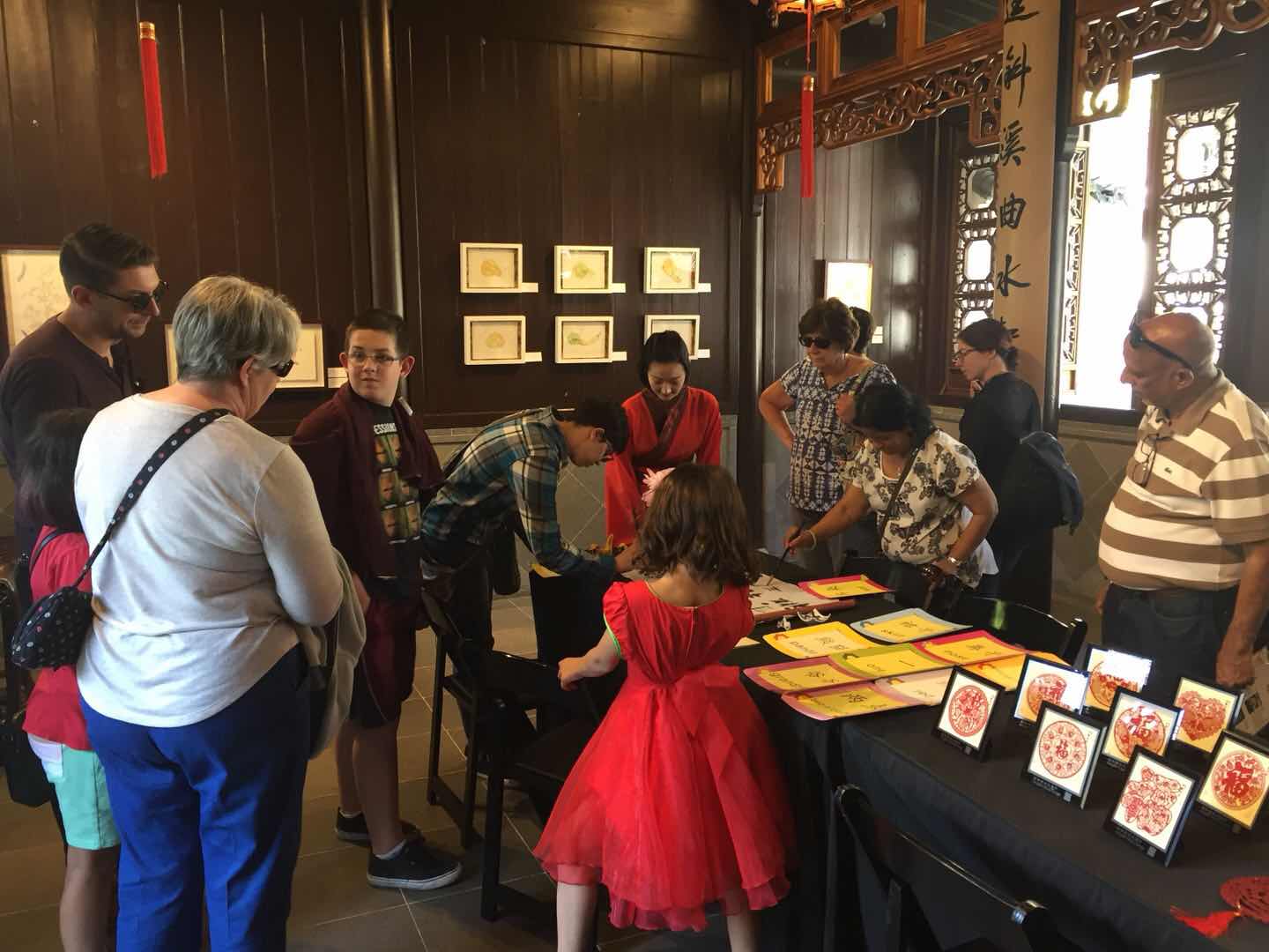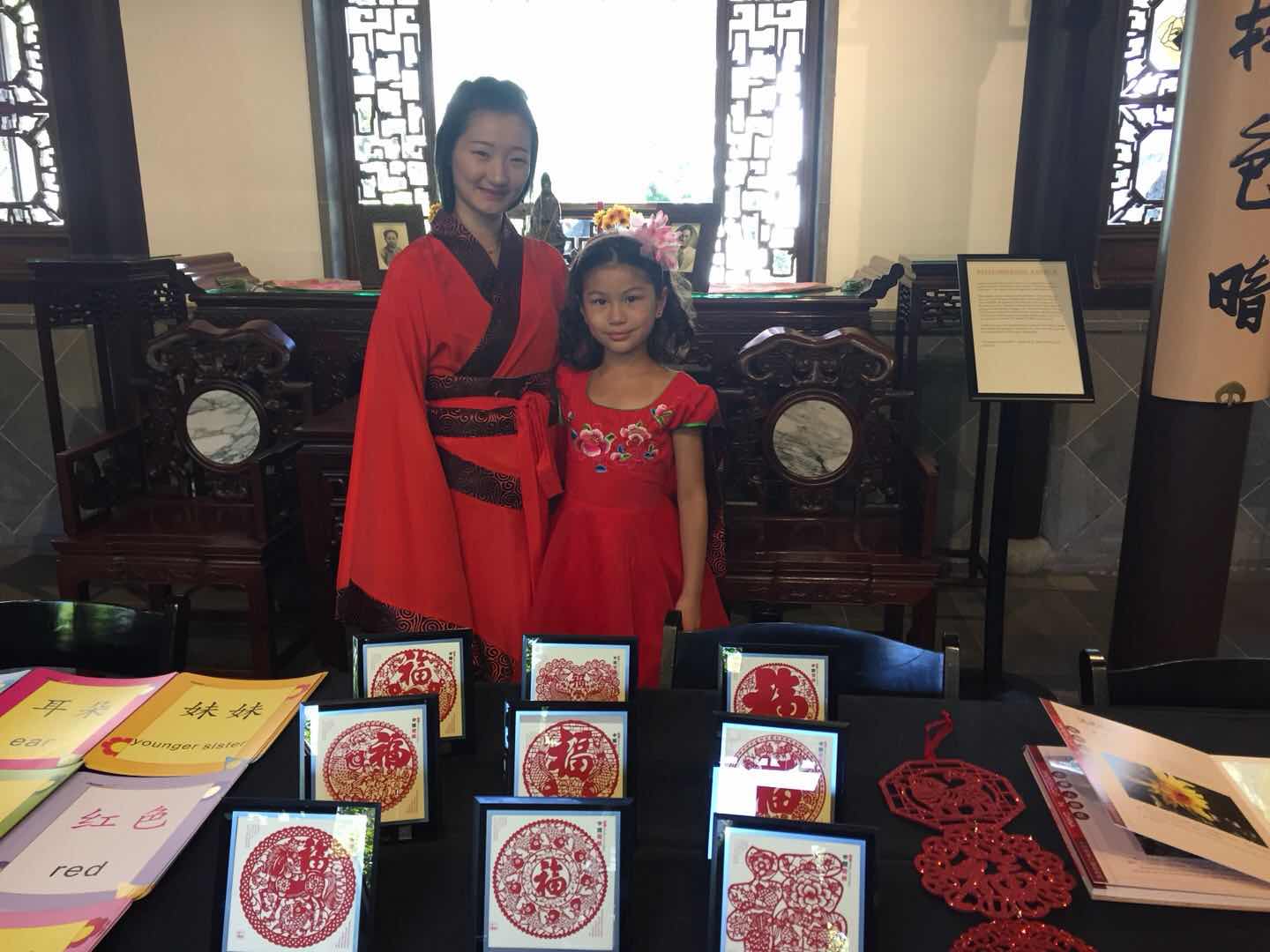 淼莲和女儿组合再次登场,妈妈身着旗袍,女儿穿了中国传统刺绣的大红纱裙。她们带去了不少中国传统剪纸作为这次展示的重点内容,不同剪法的福字,各种花卉图案,十二生肖…
