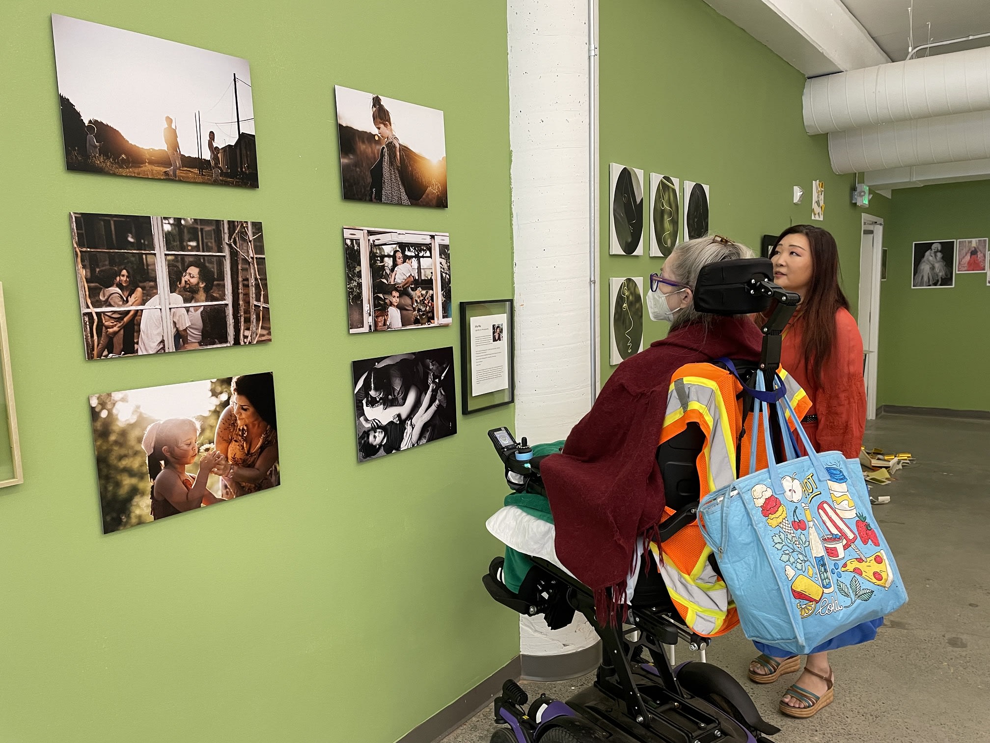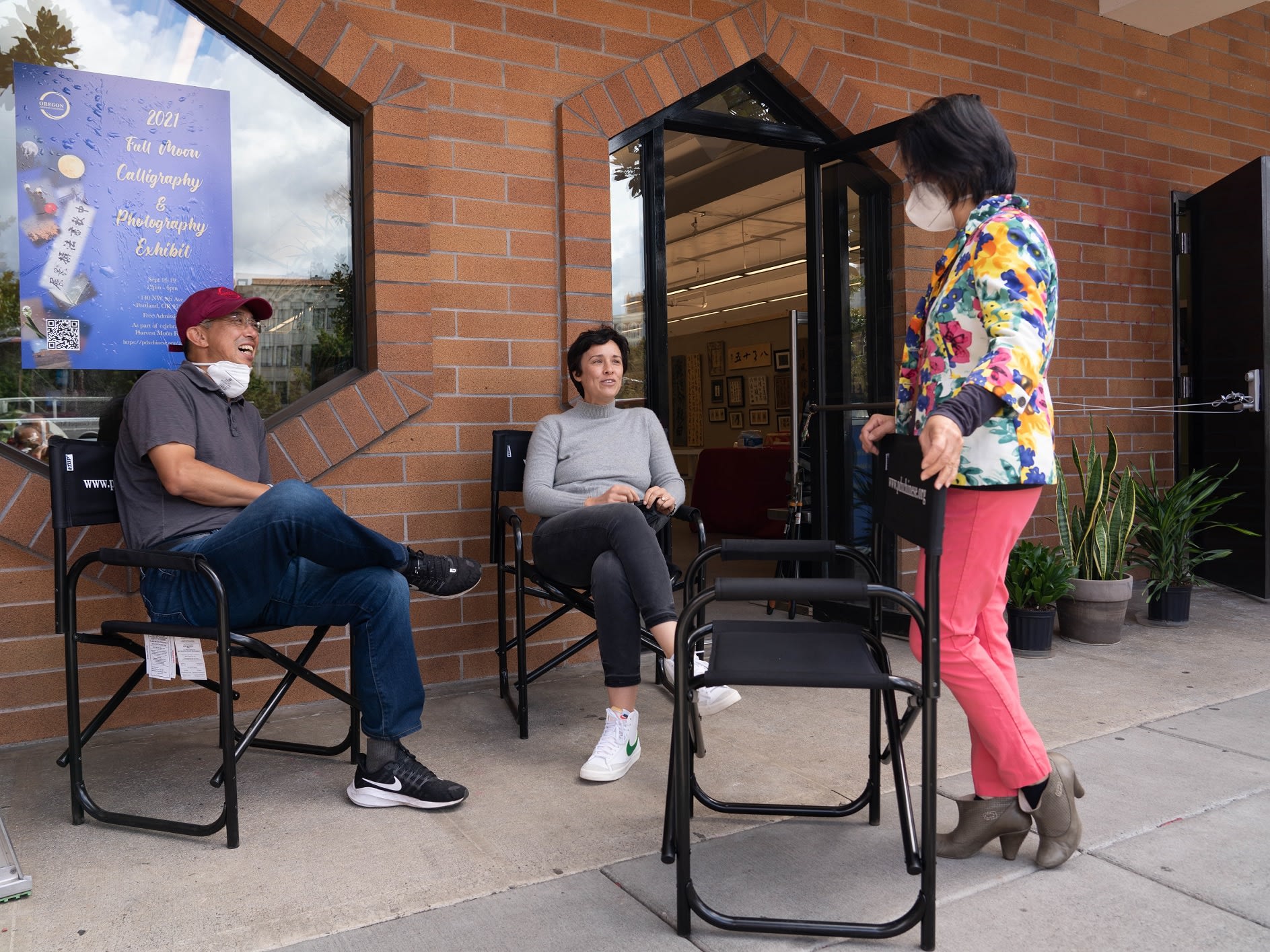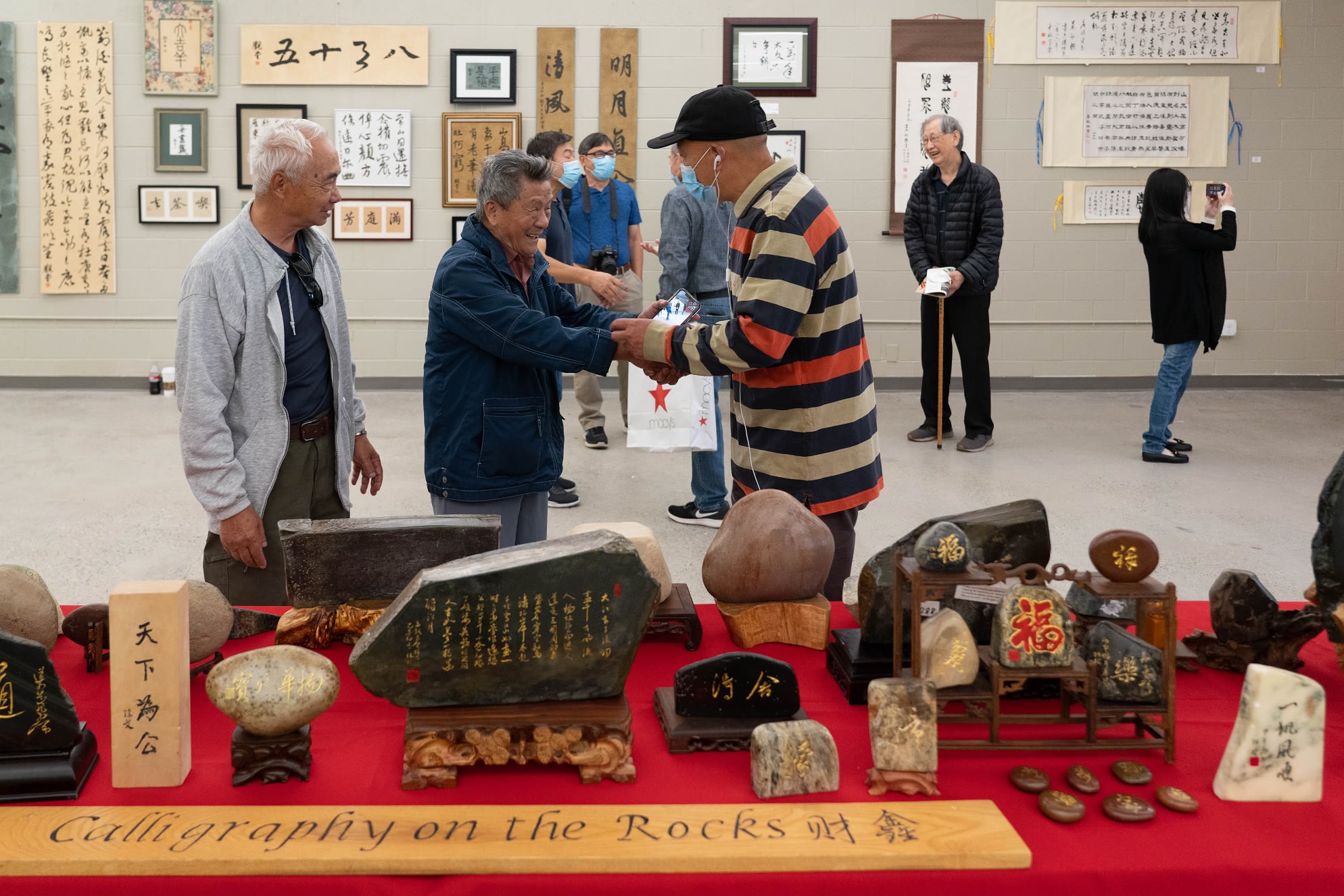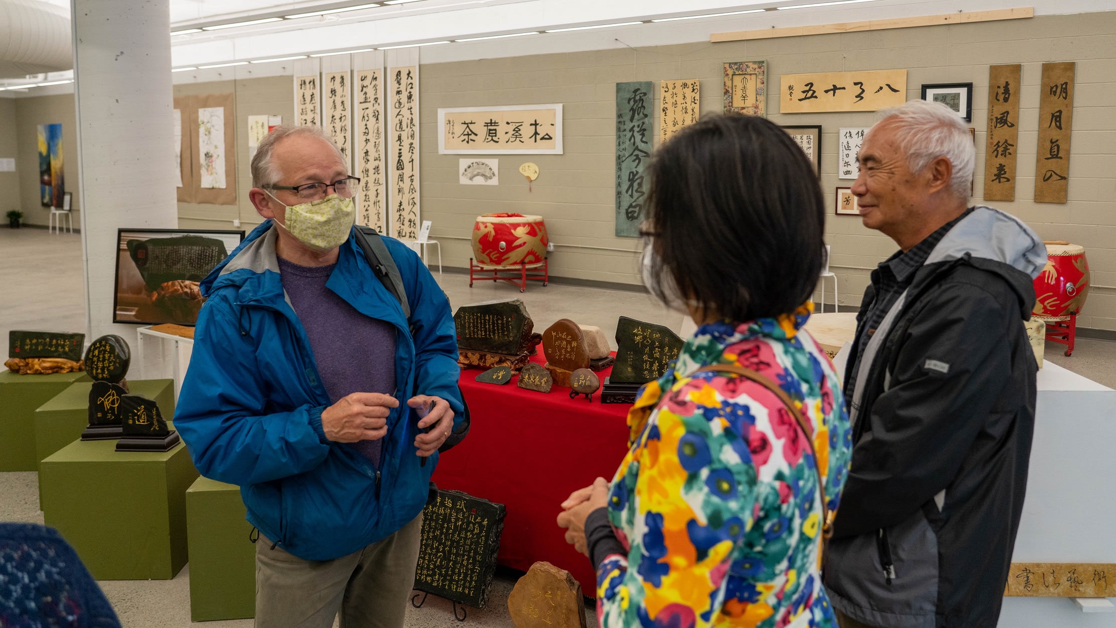 【中秋望月书法摄影展第二天】昨天照片非常的多,需要回头认真整理后发在小结里面。今天热闹场景不在,也许更有展览的气氛。有来自社区的华人,也有外来的游人。照片中坐着轮椅的妇人非常认真逐一看着作品,红蔓很有心,主动上前帮助介绍作者和作品。下午从SE一白人家里取回来赠送给我们社区的全套舞狮装备,索性先放在展室,很独特的一景。有关华工历史展板昨天在Wong Laundry楼前展示,效果非常的好,今天本来想放在牌楼下面,但风大只能作罢了。