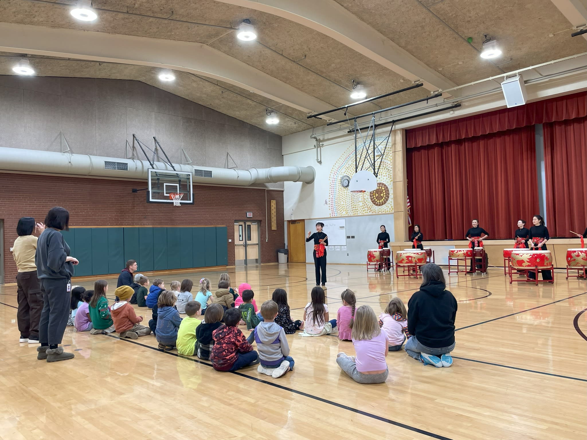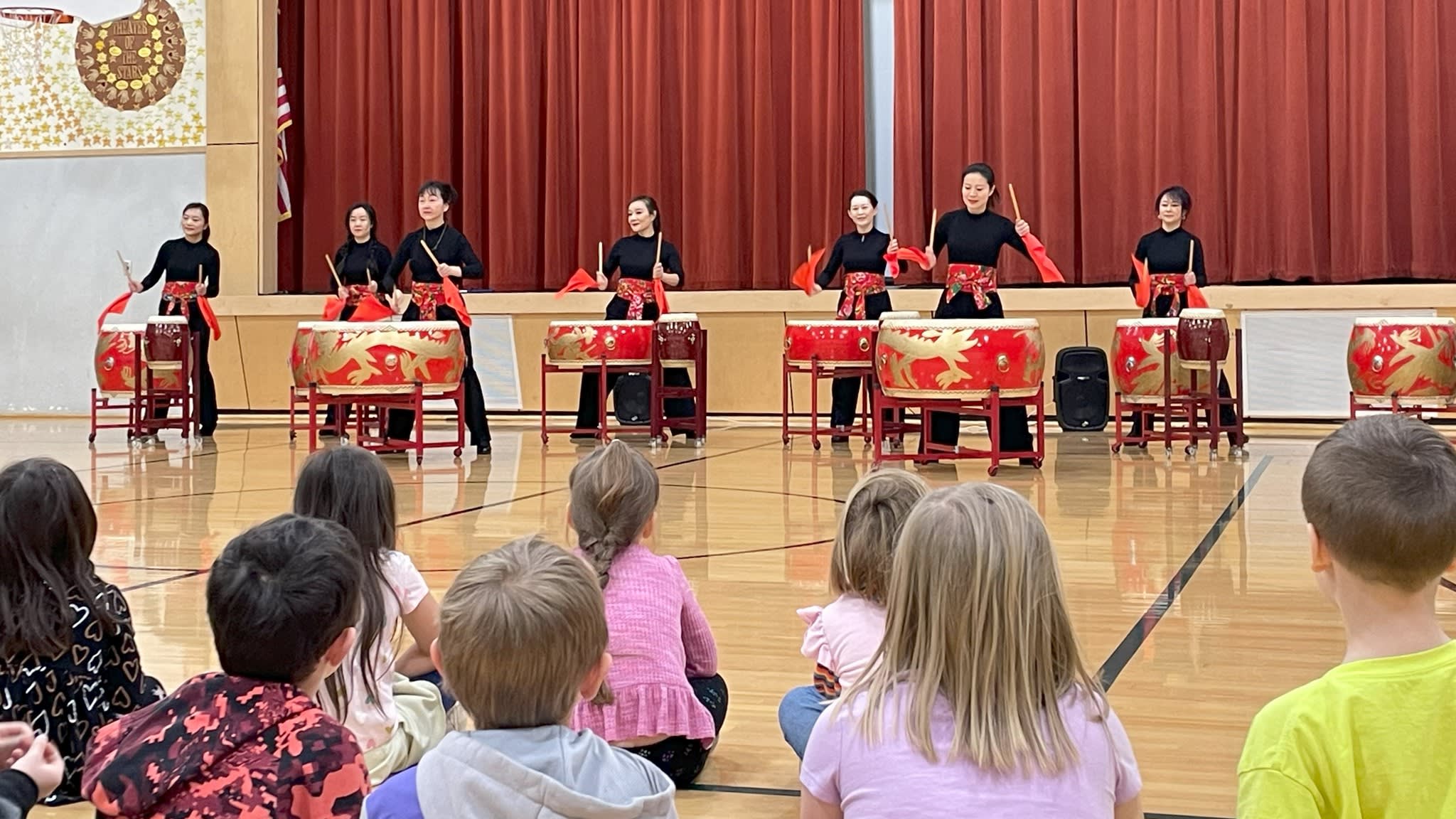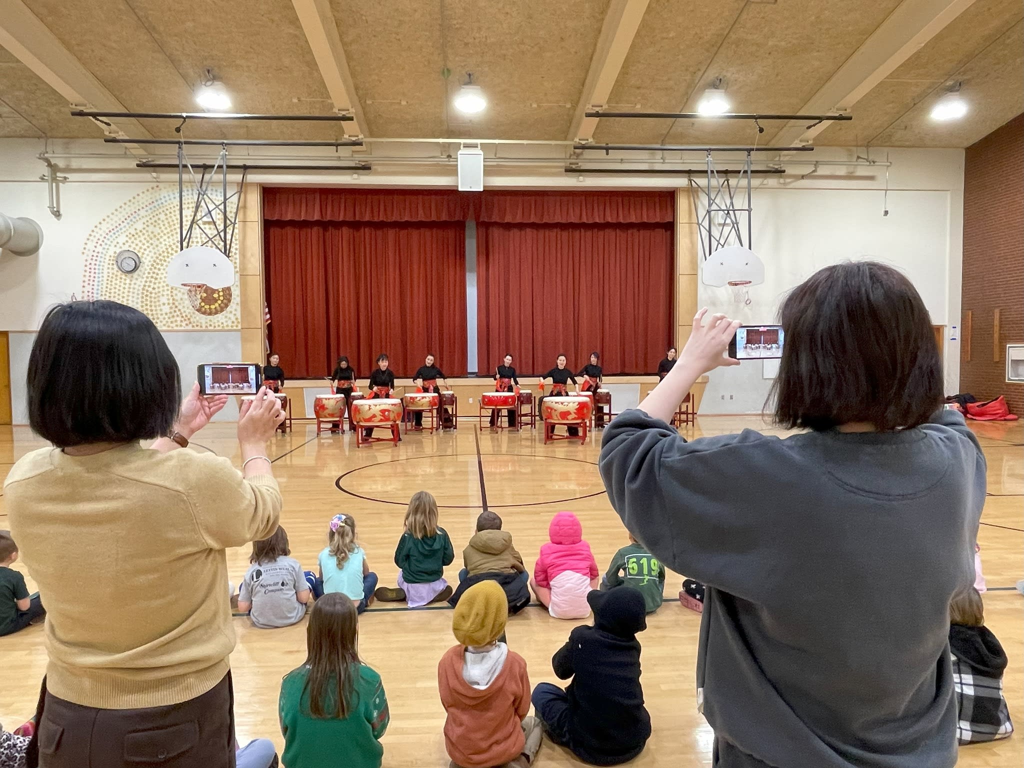 今天木兰大鼓队来到位于 West Linn 边上的 Bolton 小学,给那里的两个中文班的老师和学生们表演中国大鼓。大鼓队为了给孩子们提供一次留下深刻印象的文化体验,平时不上班的队员几乎悉数到场。表演的是刚刚排练完成的春节曲目,欢快喜庆,深受孩子们的欢迎。应同学们的要求,队员们连打了两次。表演前后,队员们邀请孩子们轮流上场,跟着学习打鼓动作,体验打鼓的乐趣。平时只能看,现在拿起鼓棒自己敲打大鼓,孩子们各个欣喜若狂。活动结束后,同学们都不舍得离开,和鼓队队员们依依惜别。